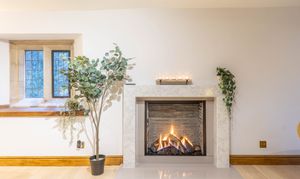 - Elegant sitting room featuring exposed beams, a gas stove and original windows, creating a warm, inviting atmosphere