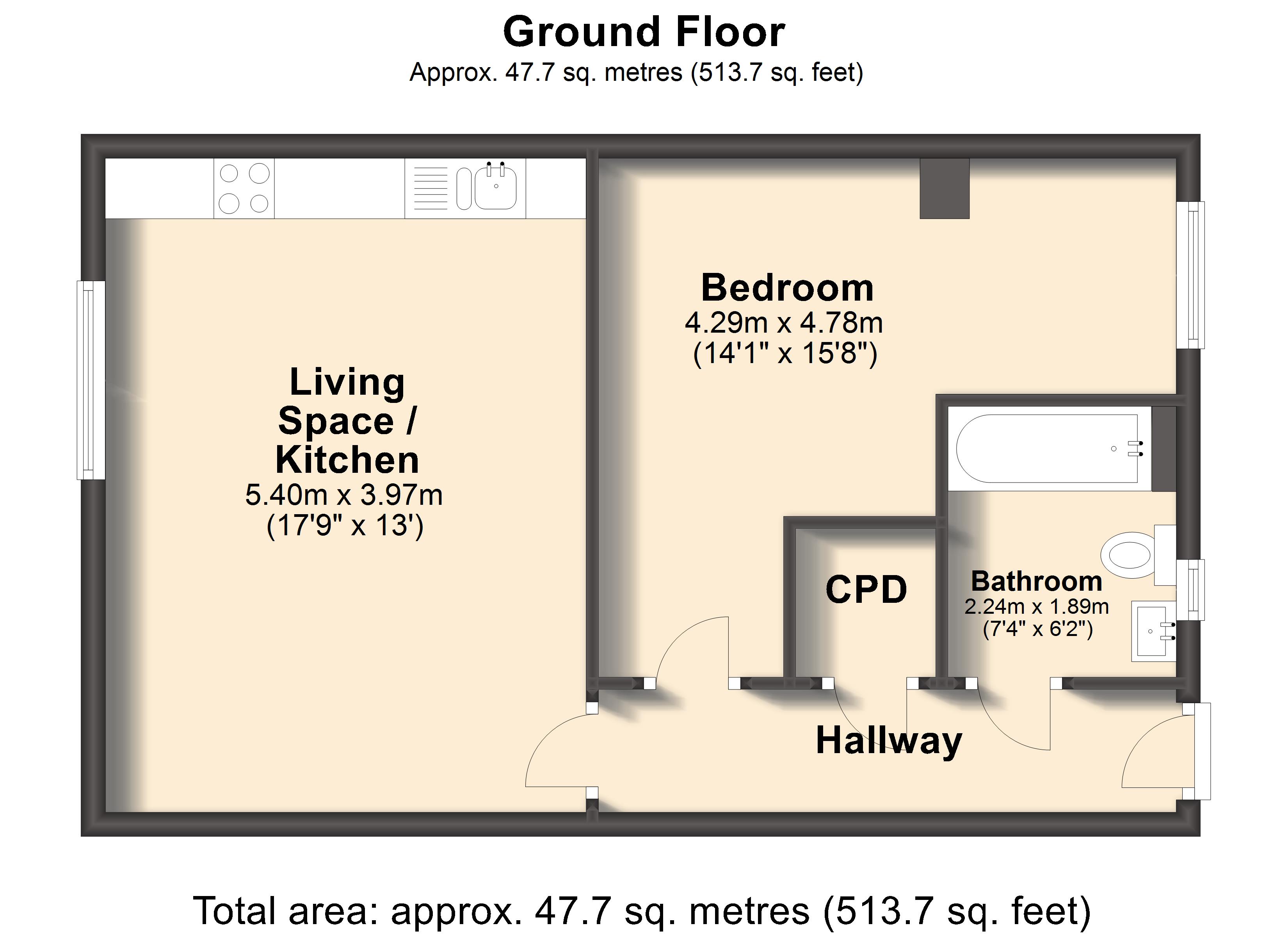 The generous open-plan living space incorporates a stunning kitchen with hi-gloss units, solid Minerva worktops and a range of integrated appliances. A double bedroom and tiled bathroom further enhance this incredibly desirable property.