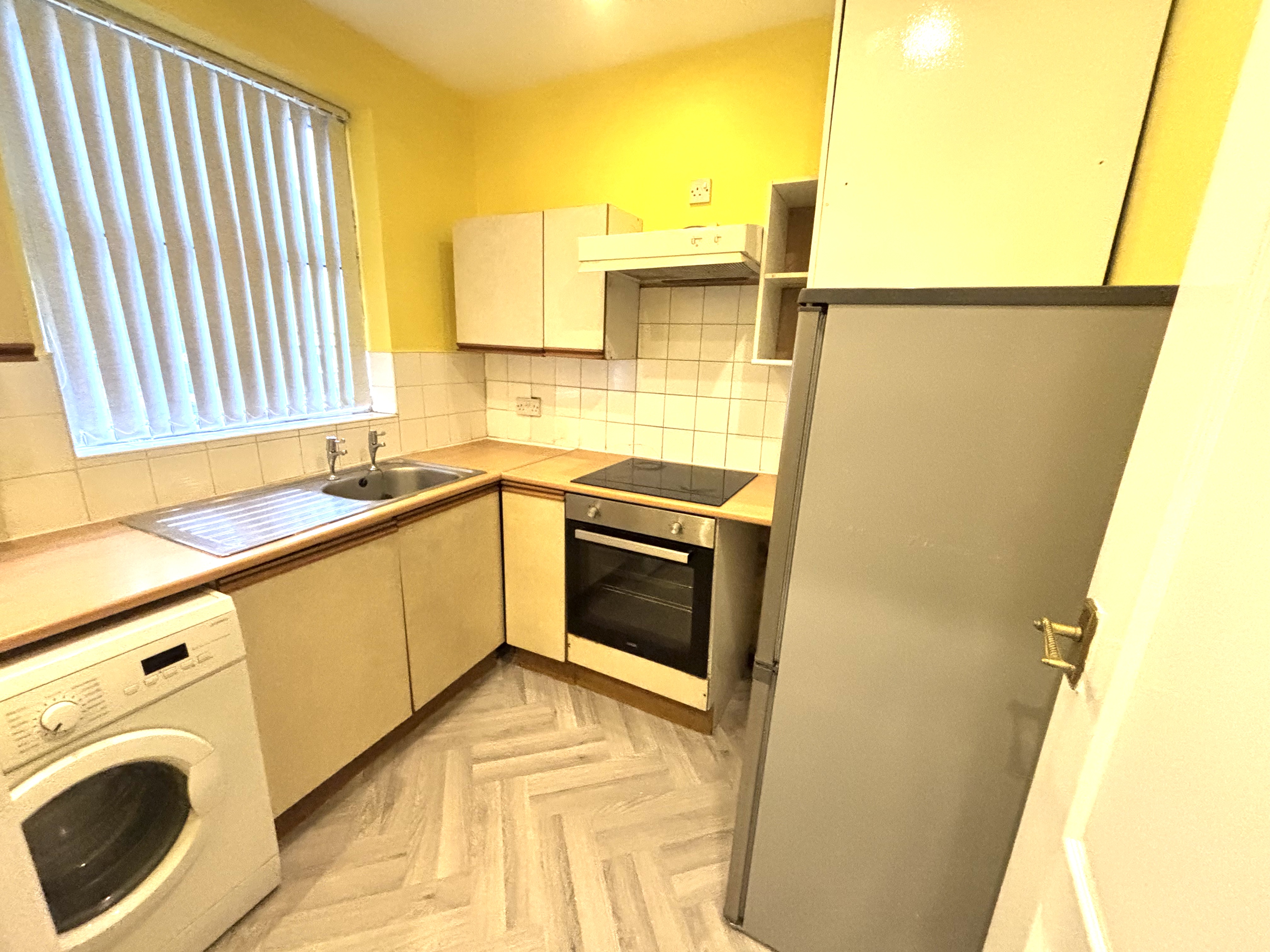 Kitchen with range of wall and base units, new oven and hob, washing machine and fridge freezer.
