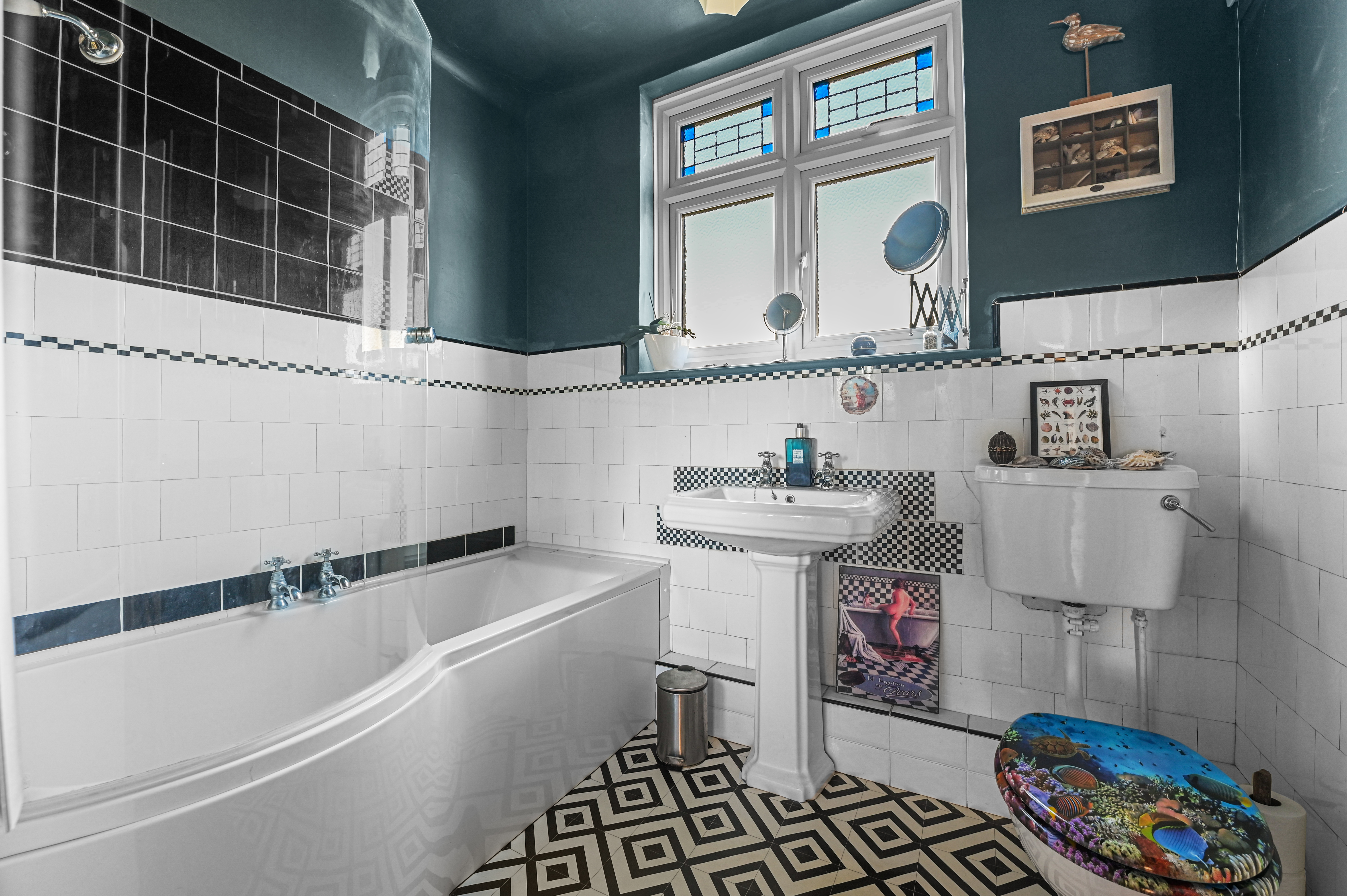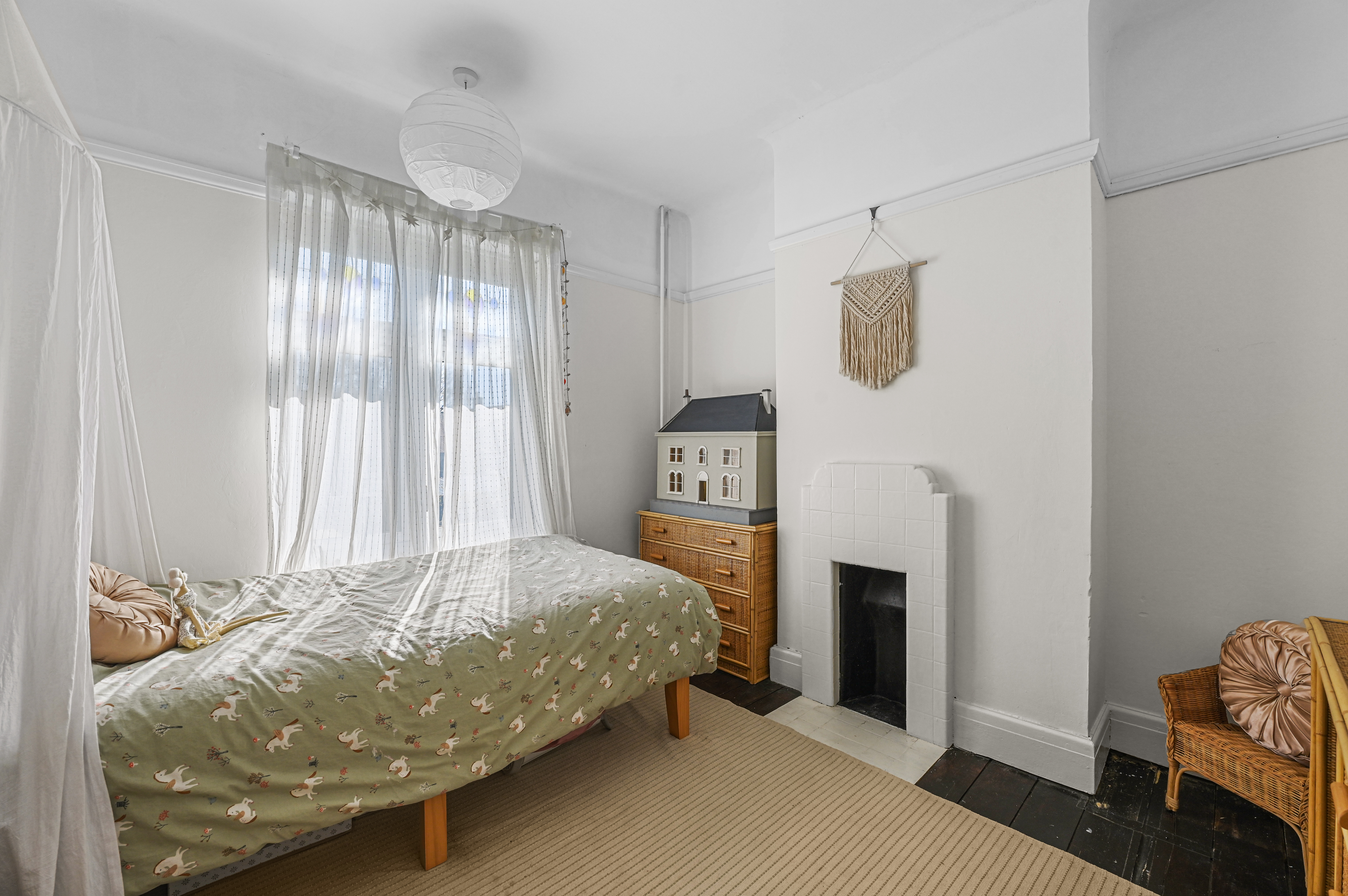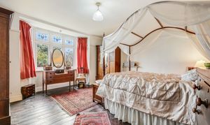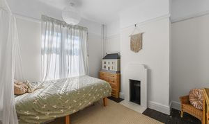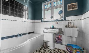 Upstairs, a spacious landing leads to three double bedrooms, each with pretty fireplaces. The impressive principal bedroom to front has another attractive bay window complimented by original floorboards. These are served by a super family bathroom comprising of a panel enclosed bath with glass screen and overhead rainfall shower, low level WC and wash hand basin. There is also an additional loft room.