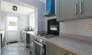 Beautifully updated in September 2025, this contemporary kitchen delivers a fresh and sophisticated look. The soft reed-green cabinetry pairs effortlessly with sleek brushed-steel handles and light concrete-style worktops, creating a calm and modern aesthetic. A black composite sink, matching tap, and built-in oven with gas hob add practicality and style, while the striking glass canopy extractor provides a bold focal point. Natural light pours through the window and half-glazed back door, giving the space a bright, welcoming atmosphere, ideal for everyday living and home cooking alike.