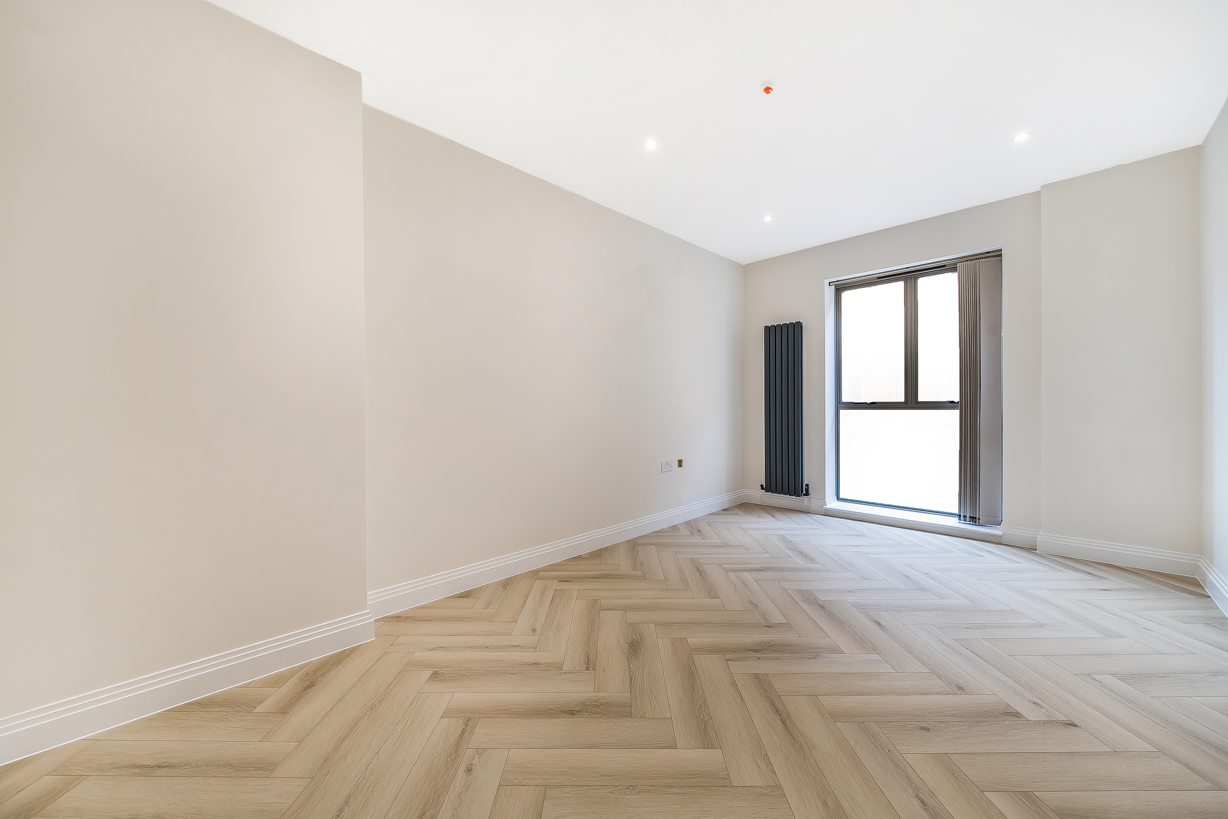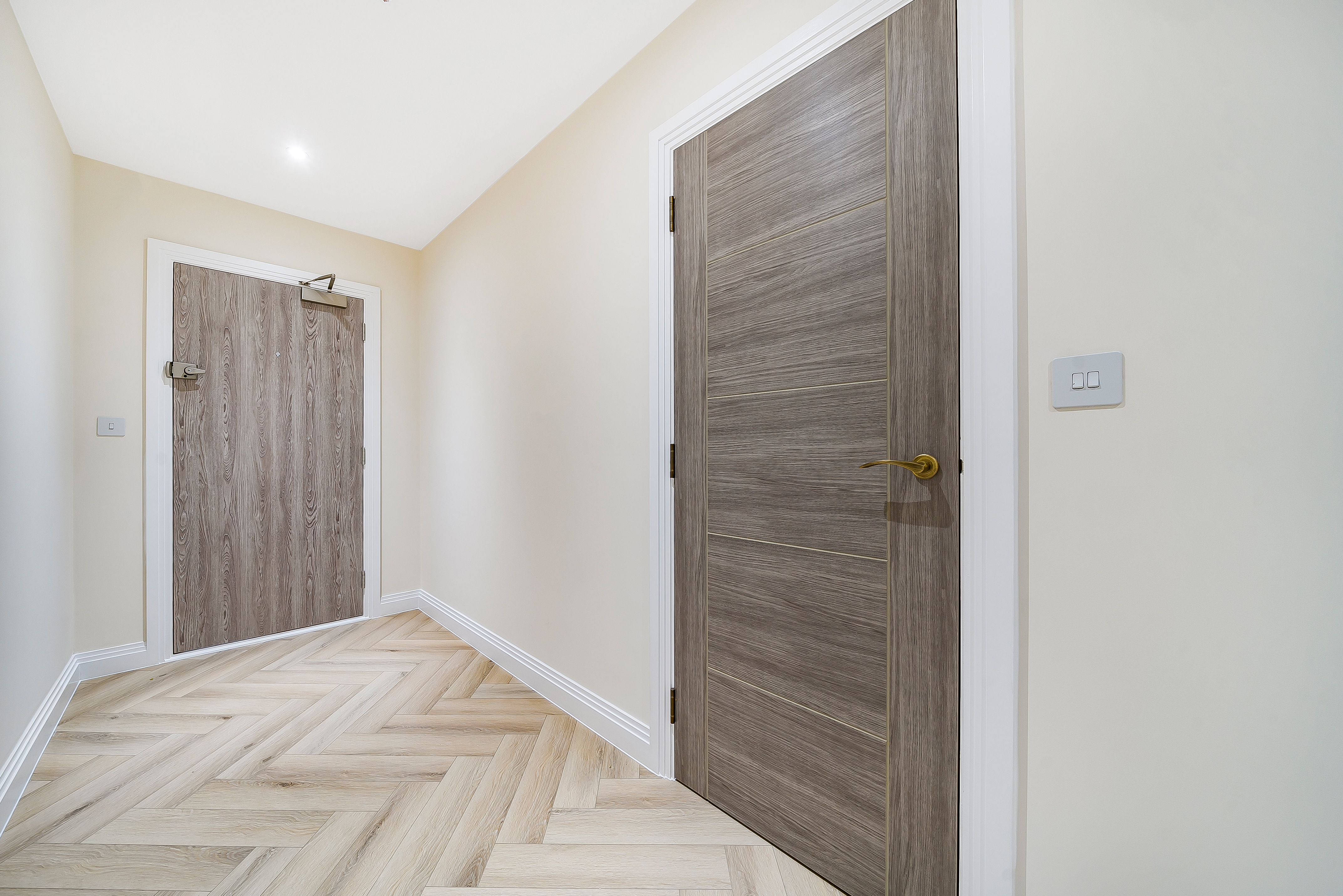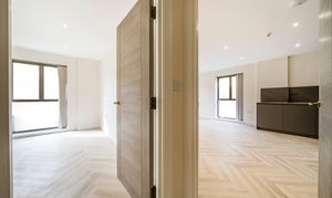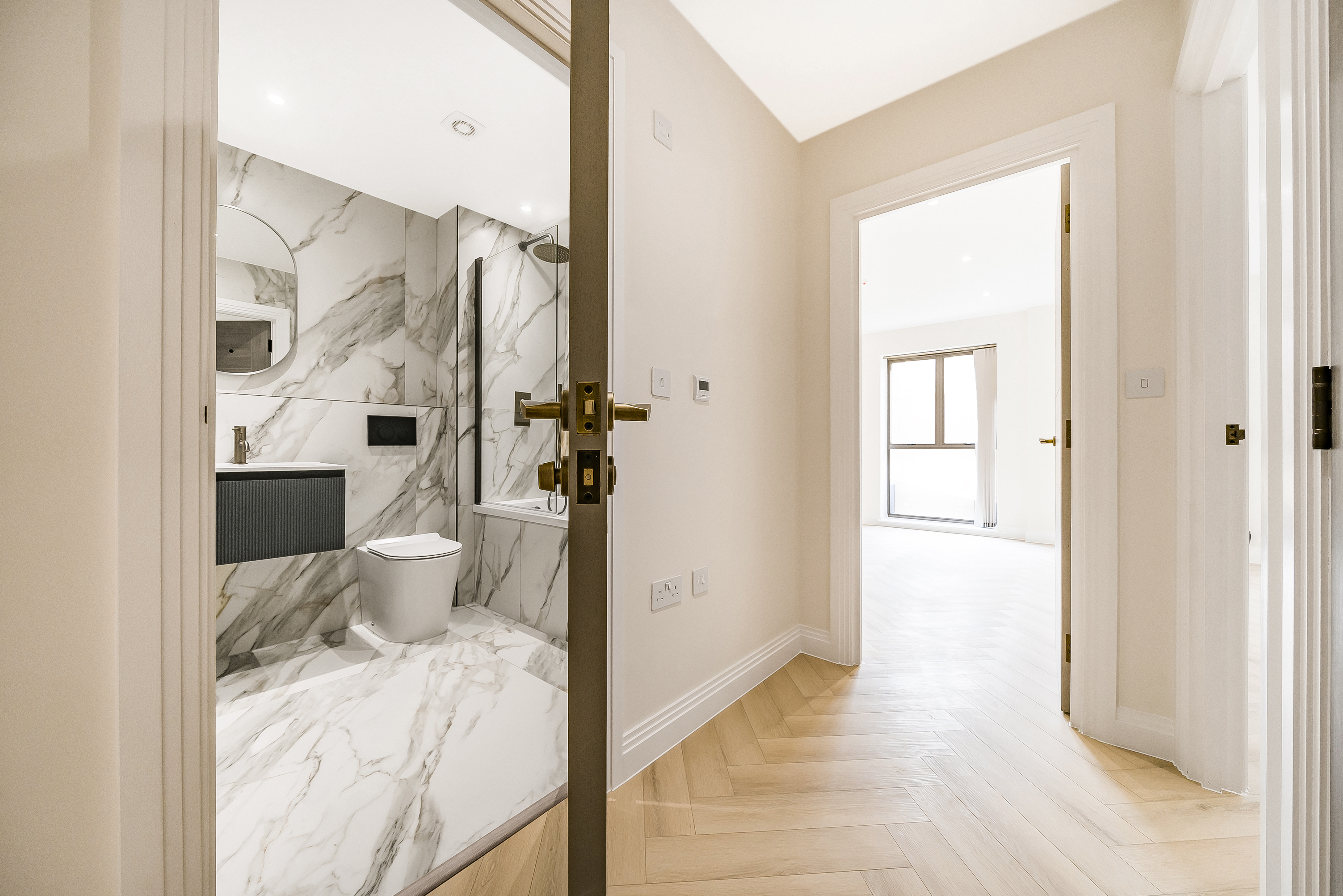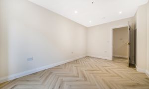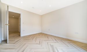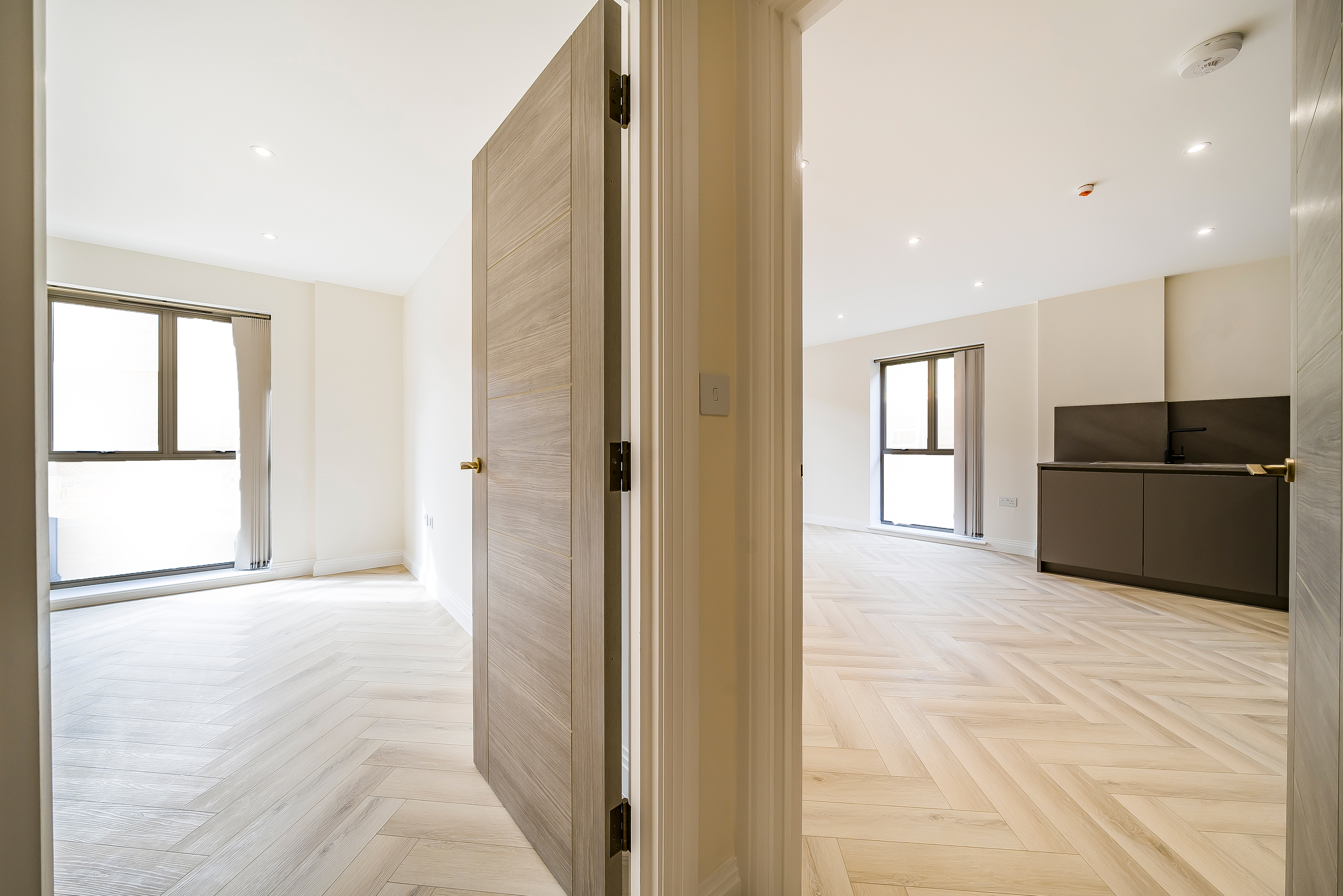 Both bedrooms are spacious and filled with natural light, offering a calm retreat from the lively city atmosphere. The stylish herringbone flooring adds a sophisticated touch, combining elegance with practicality.