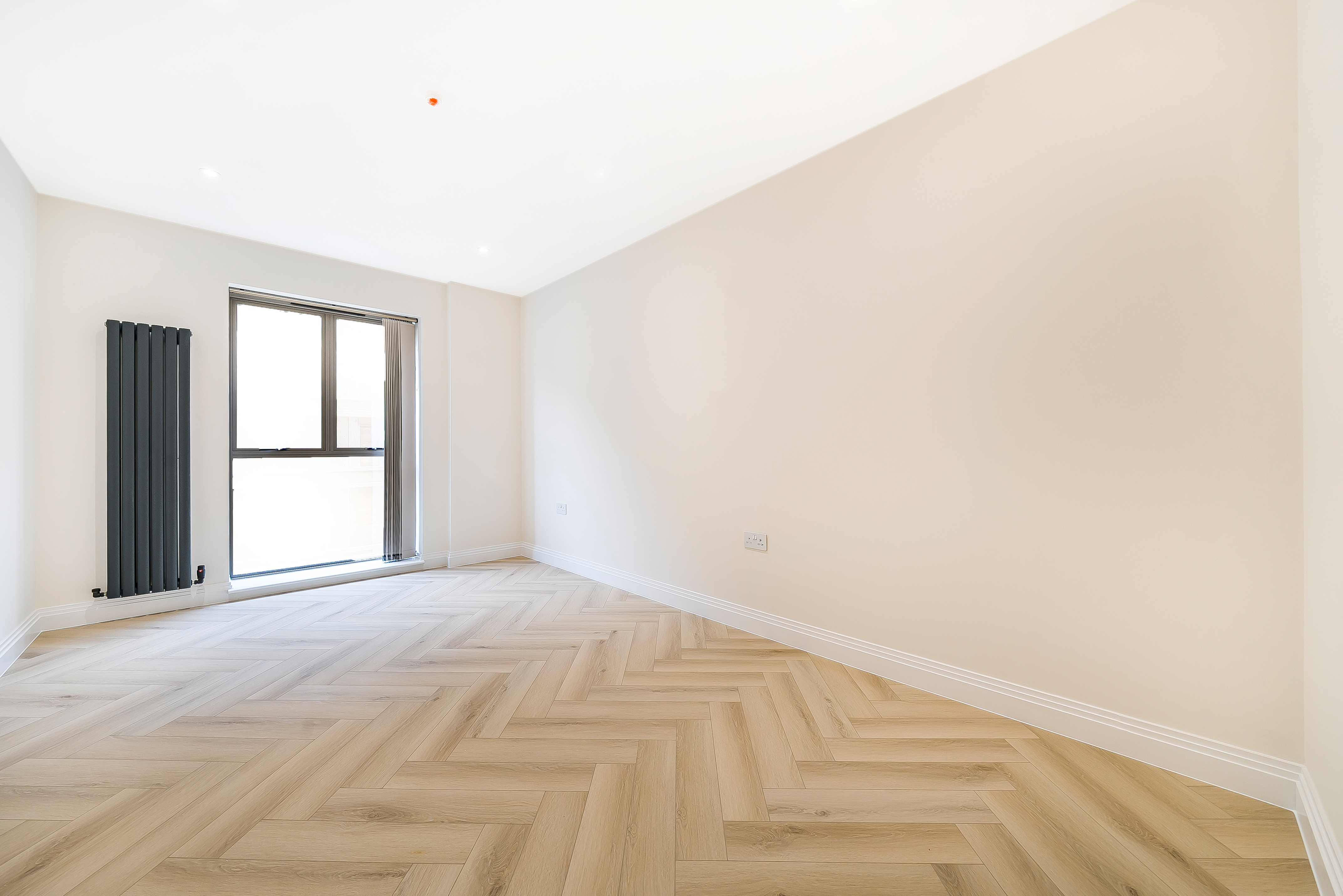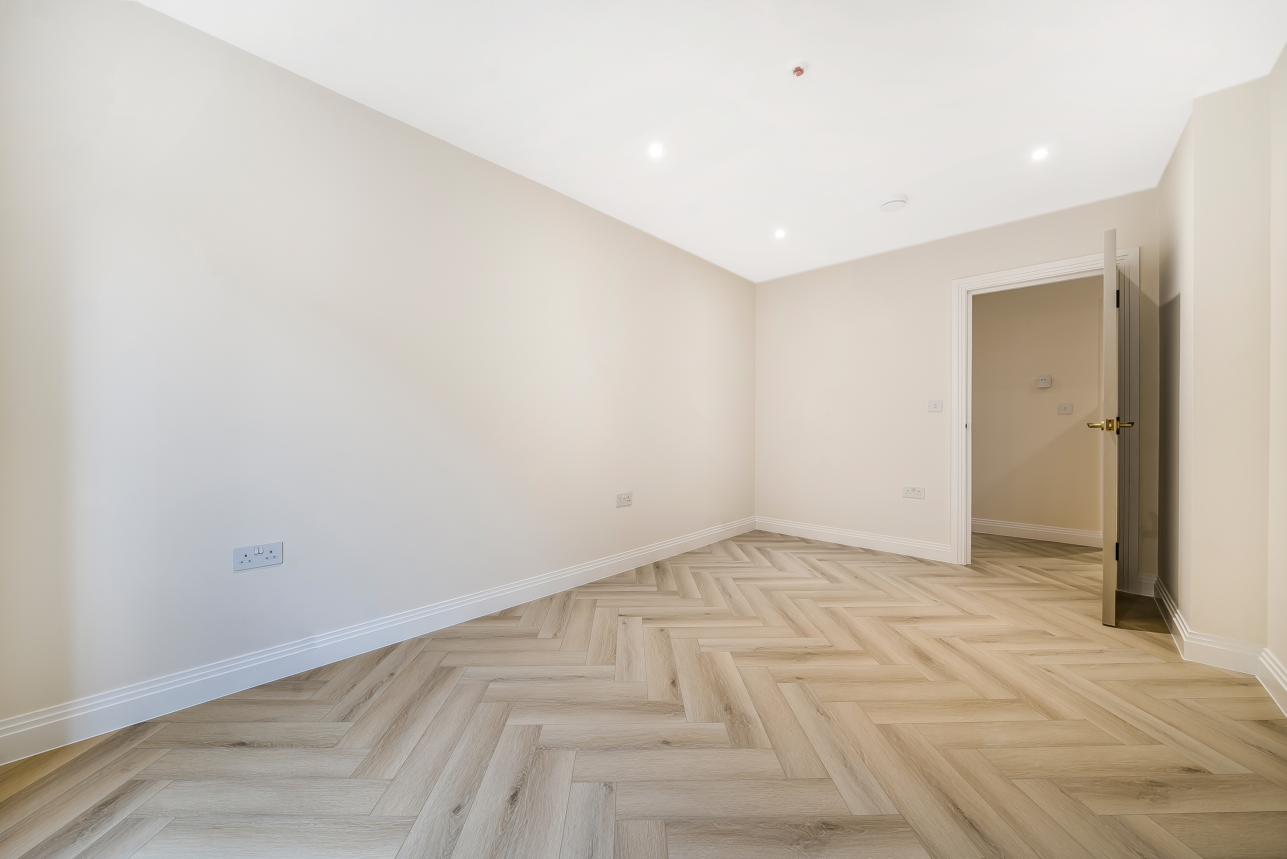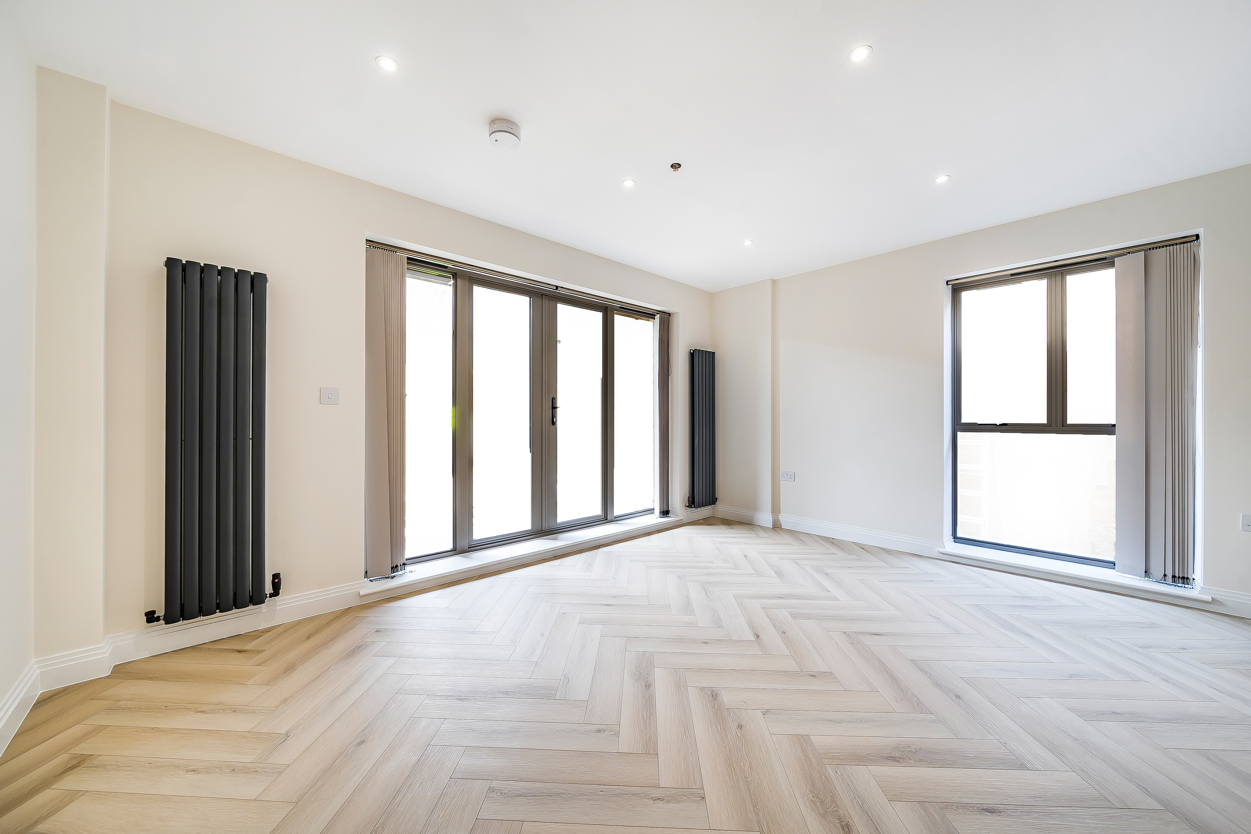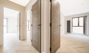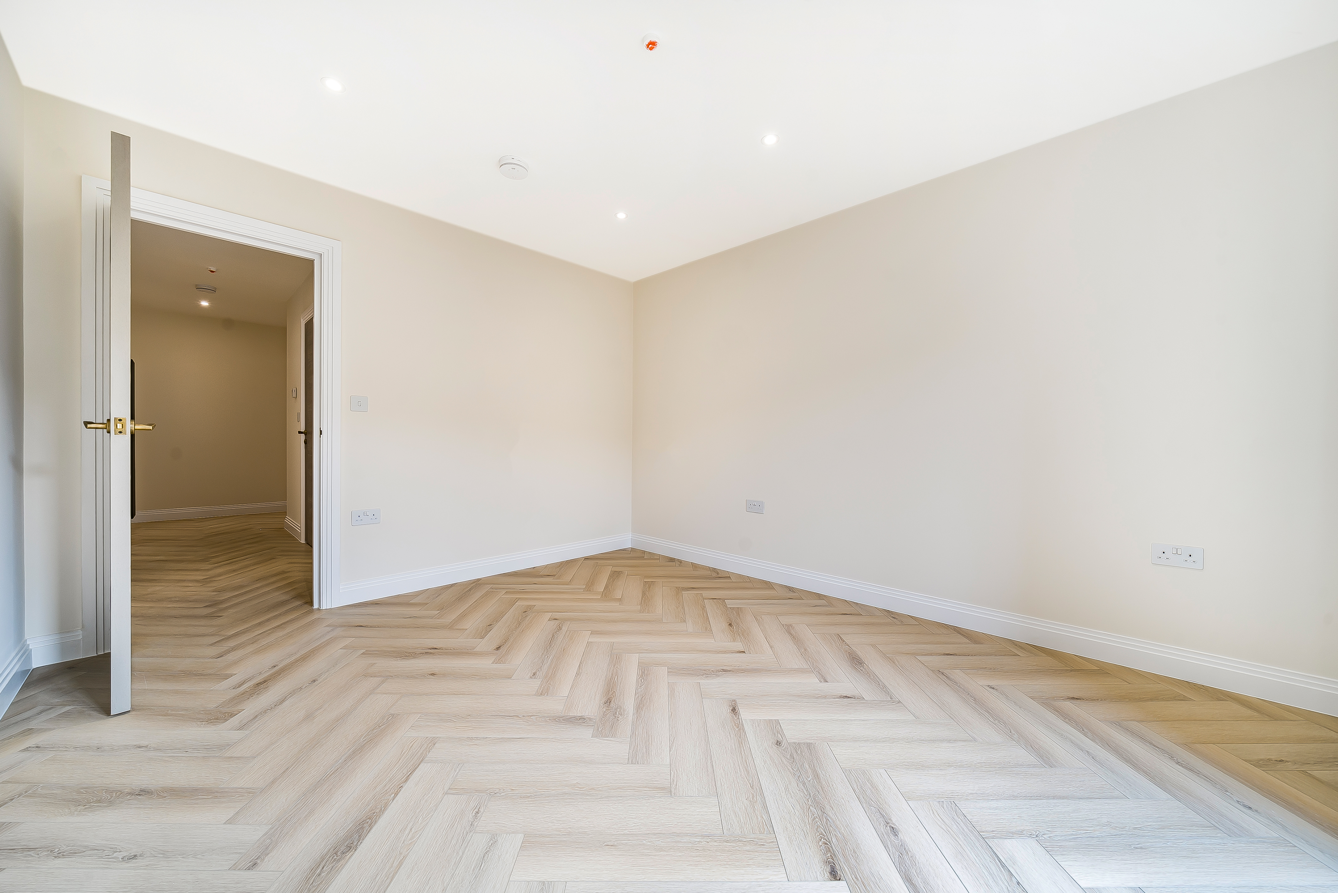 Both bedrooms are spacious and filled with natural light, offering a calm retreat from the lively city atmosphere. The stylish herringbone flooring adds a sophisticated touch, combining elegance with practicality.