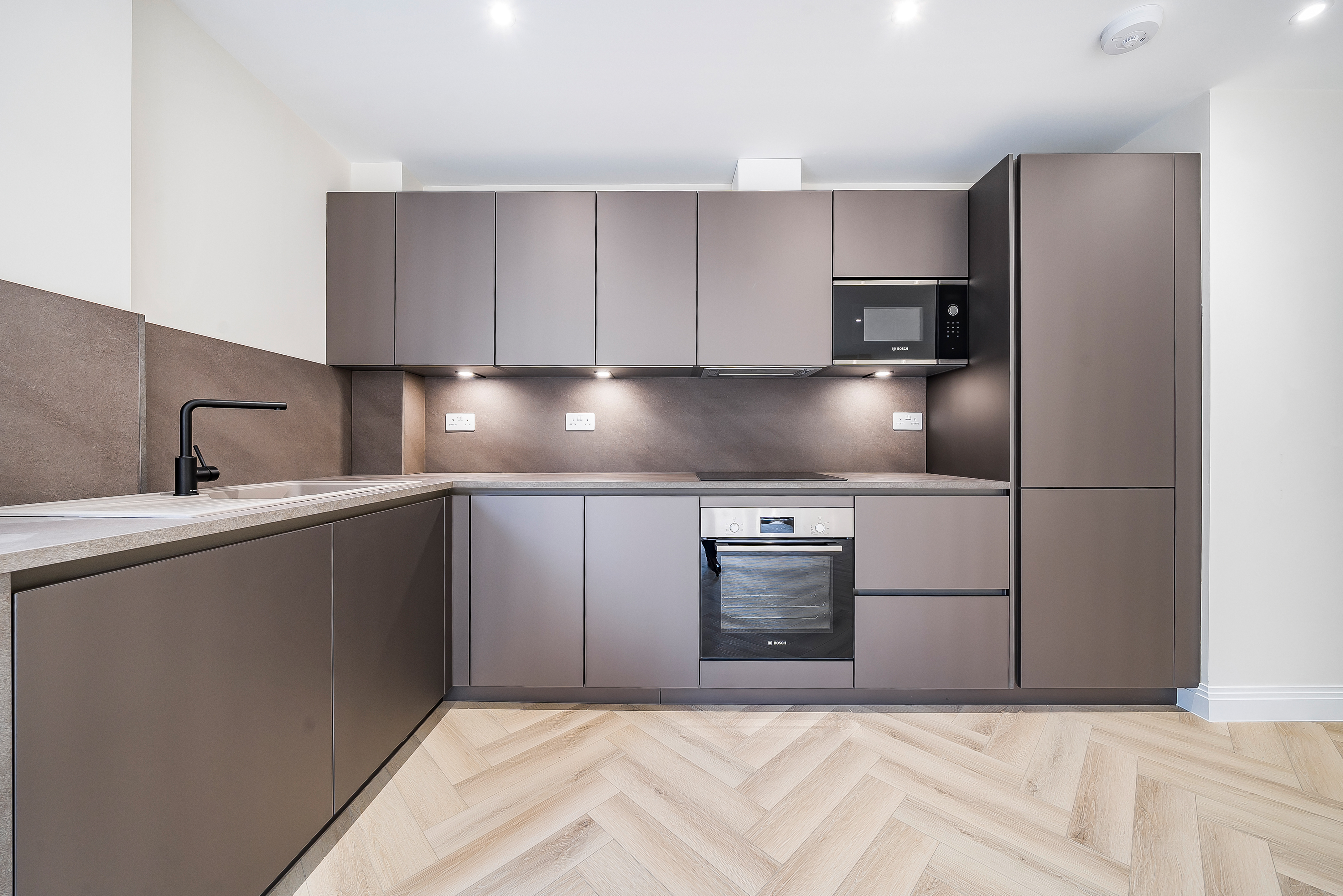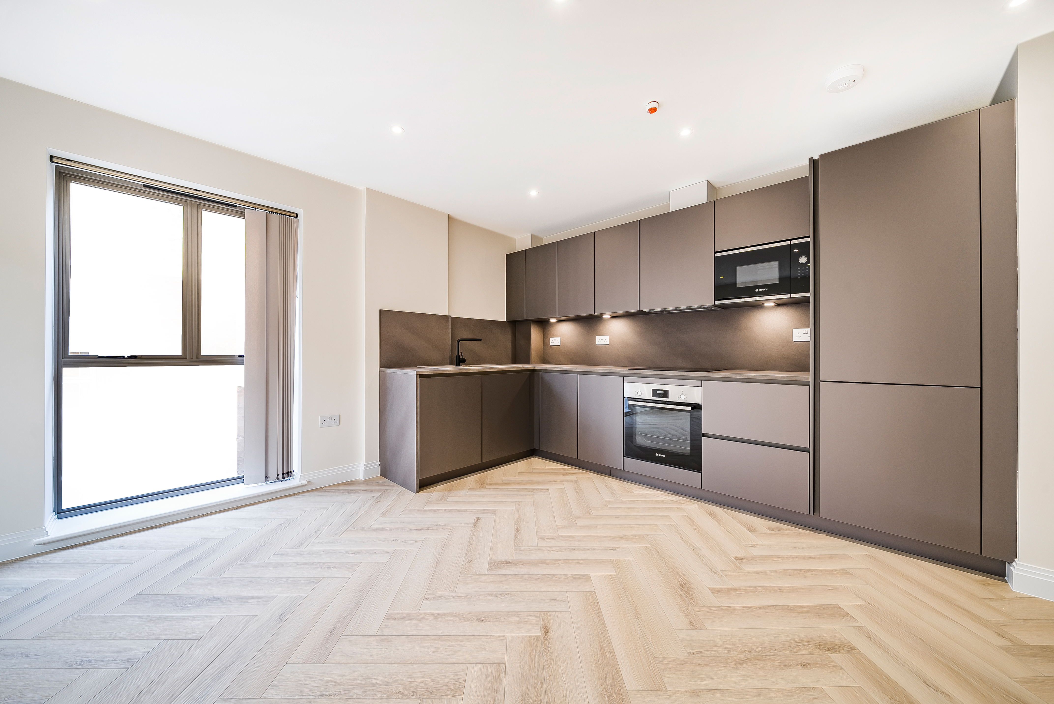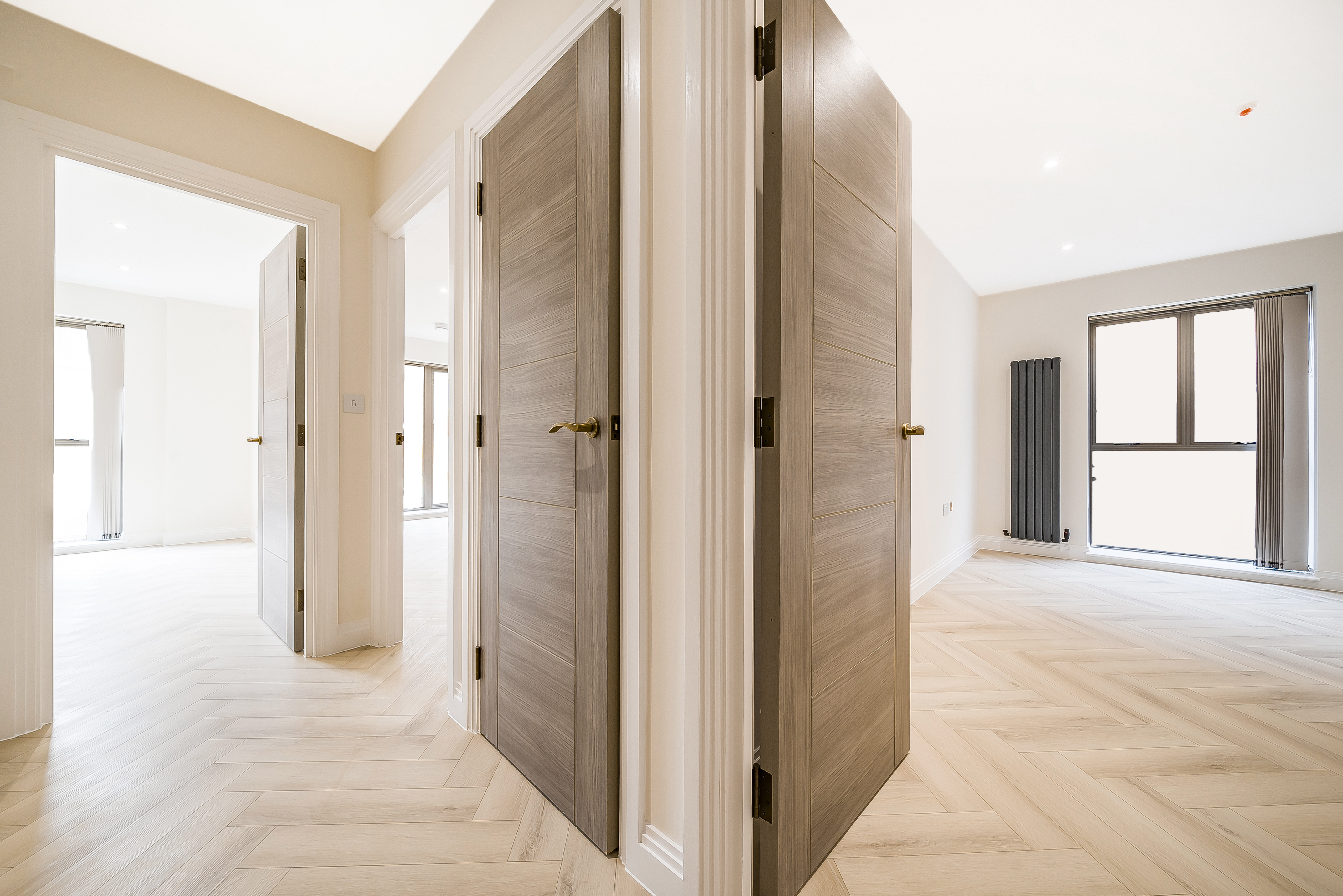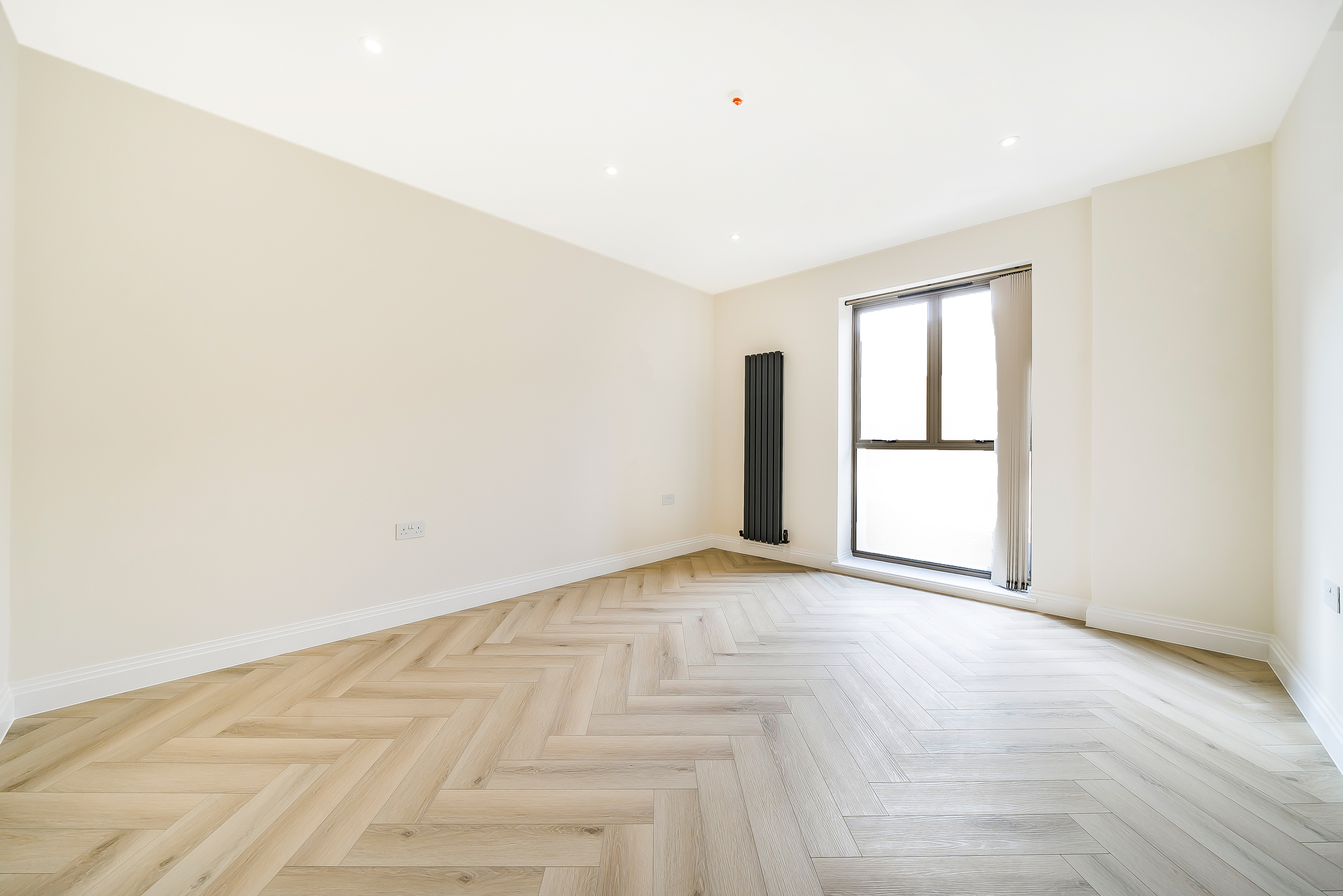 Both bedrooms are spacious and filled with natural light, offering a calm retreat from the lively city atmosphere. The stylish herringbone flooring adds a sophisticated touch, combining elegance with practicality.