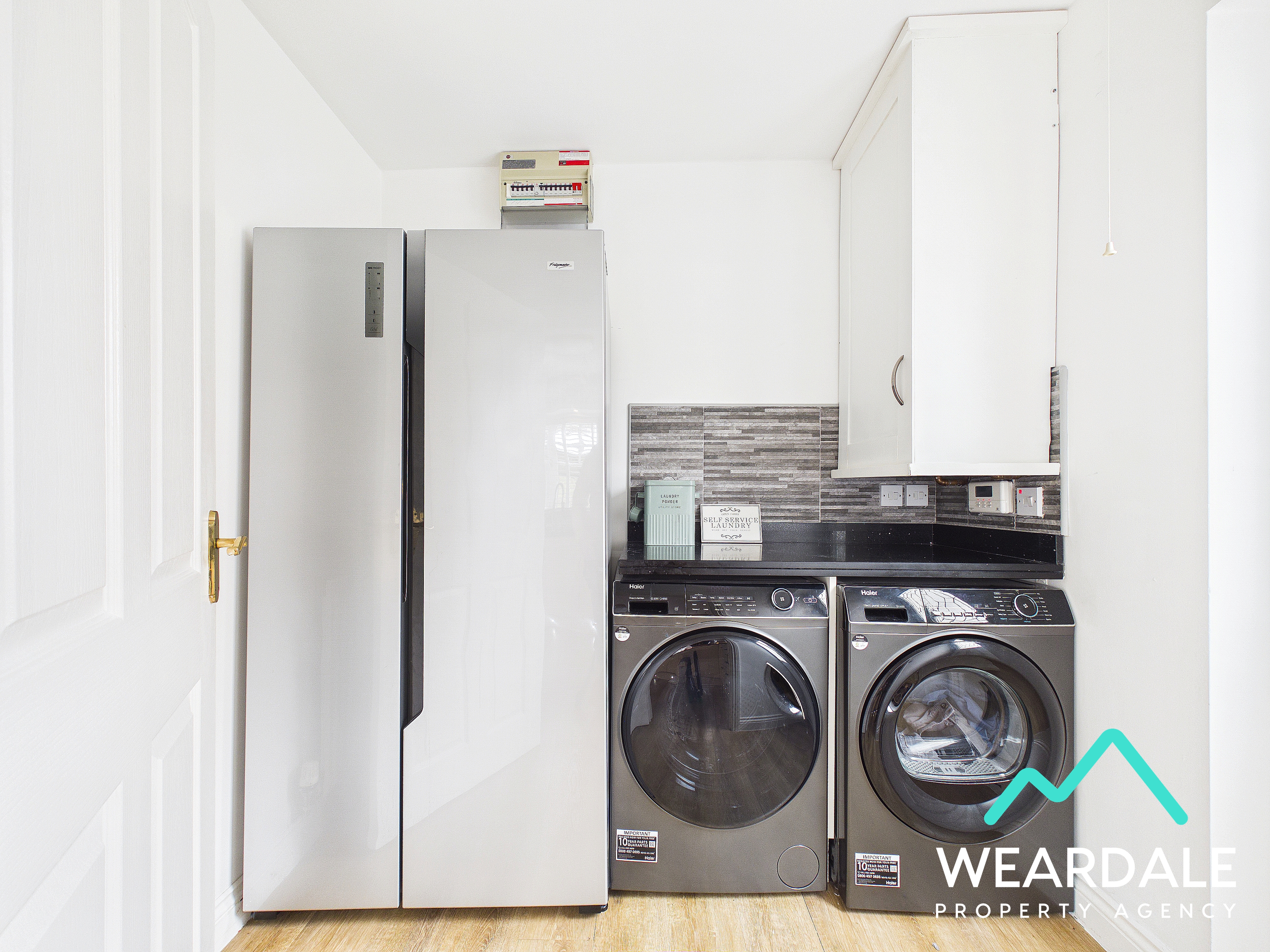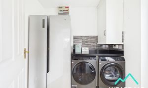 - Positioned to the rear of the property on the Western side, accessed internally from the kitchen, and externally via a double-glazed composite door with frosted pane from the driveway located to the Western side of the property - LVT flooring - Neutrally decorated - Quartz worktop with tiled splashback - Plumbing for washing machine and tumble dryer - Space for free-standing fridge freezer - Central ceiling light fitting - Radiator - Extractor fan - The property’s electrical consumer unit is located in this room - The property’s Oil Combi boiler is located in a cupboard in this room