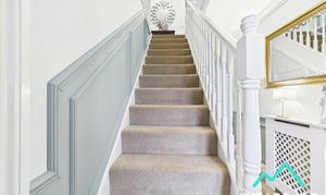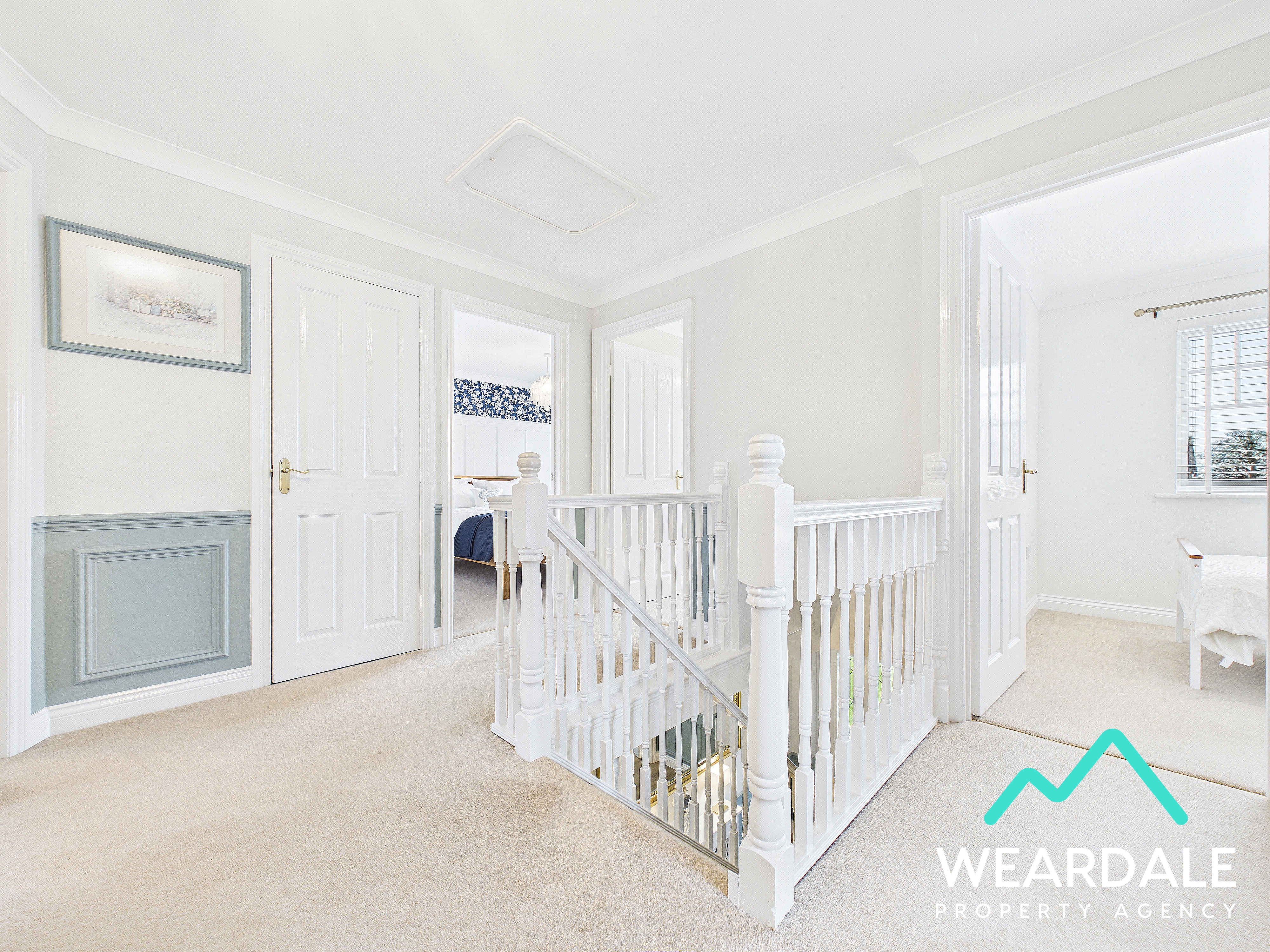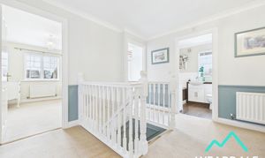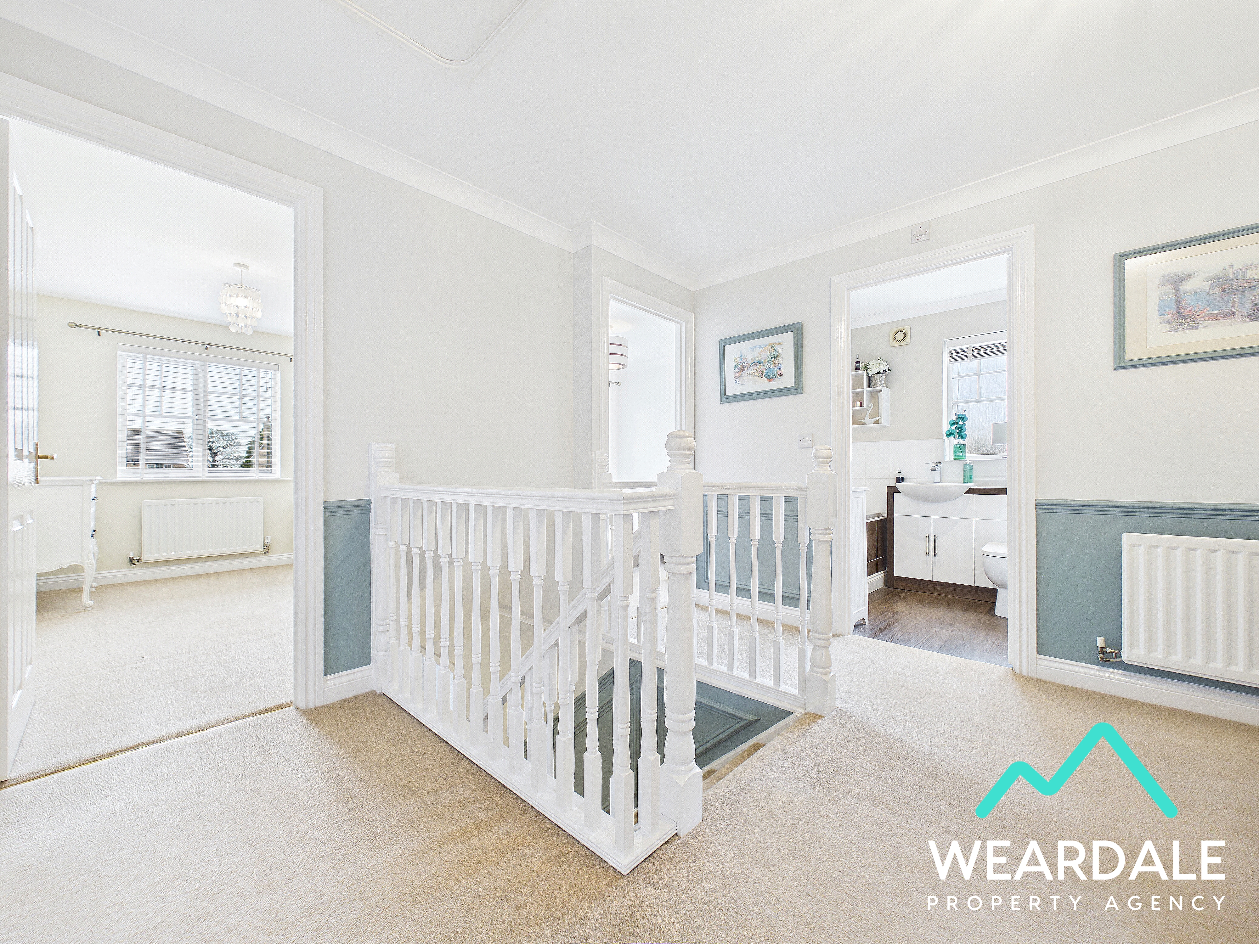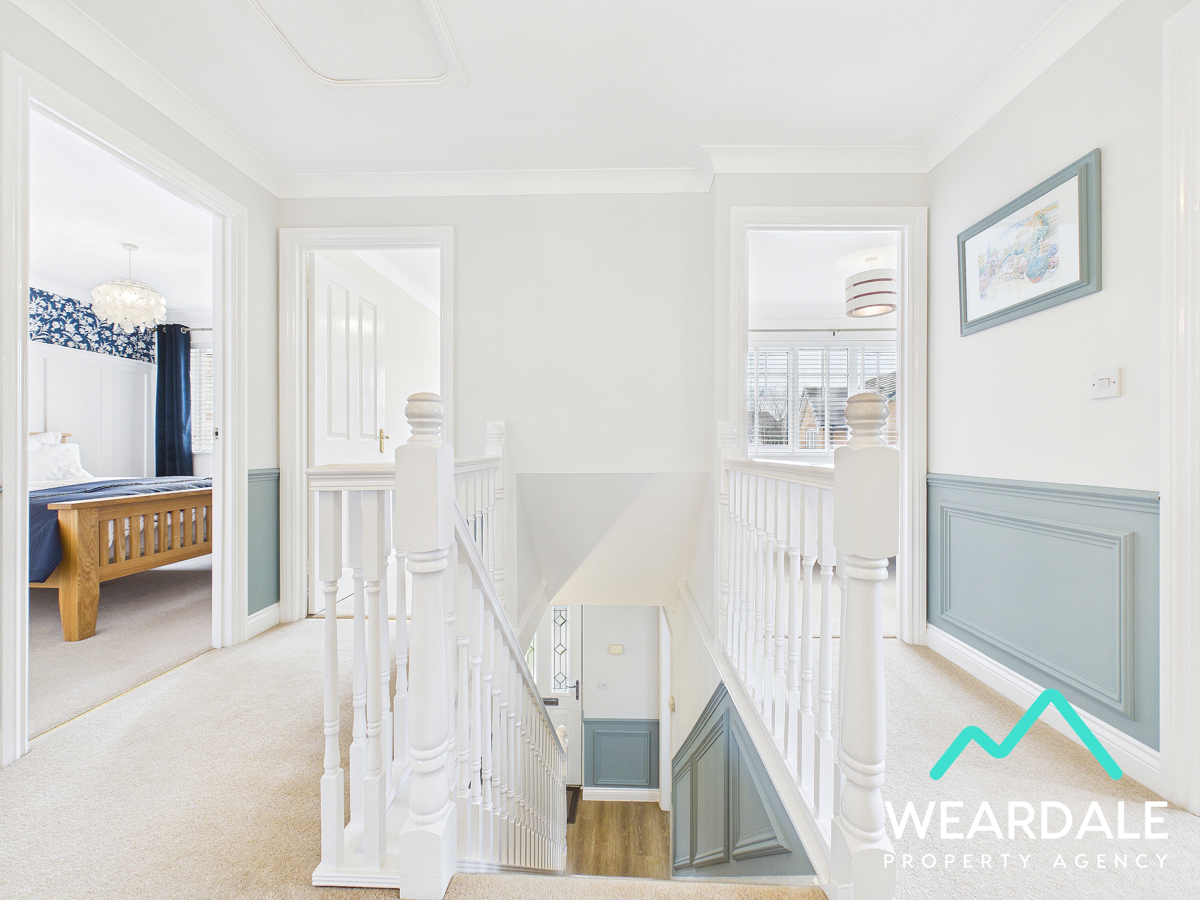 - A carpeted staircase with a decorative wood panelled wall rises from the entrance hallway to the large landing area which provides access to the property’s four bedrooms and family bathroom - Carpeted - Neutrally decorated - Decorative wood panel walls - Ceiling light fitting - Radiator - Built-in airing cupboard that houses the property’s water cylinder - Access hatch to the property’s roof space (8.20m x 2.50m), which has a pulldown ladder, is partially boarded, features built-in shelving, and is equipped with power and lighting