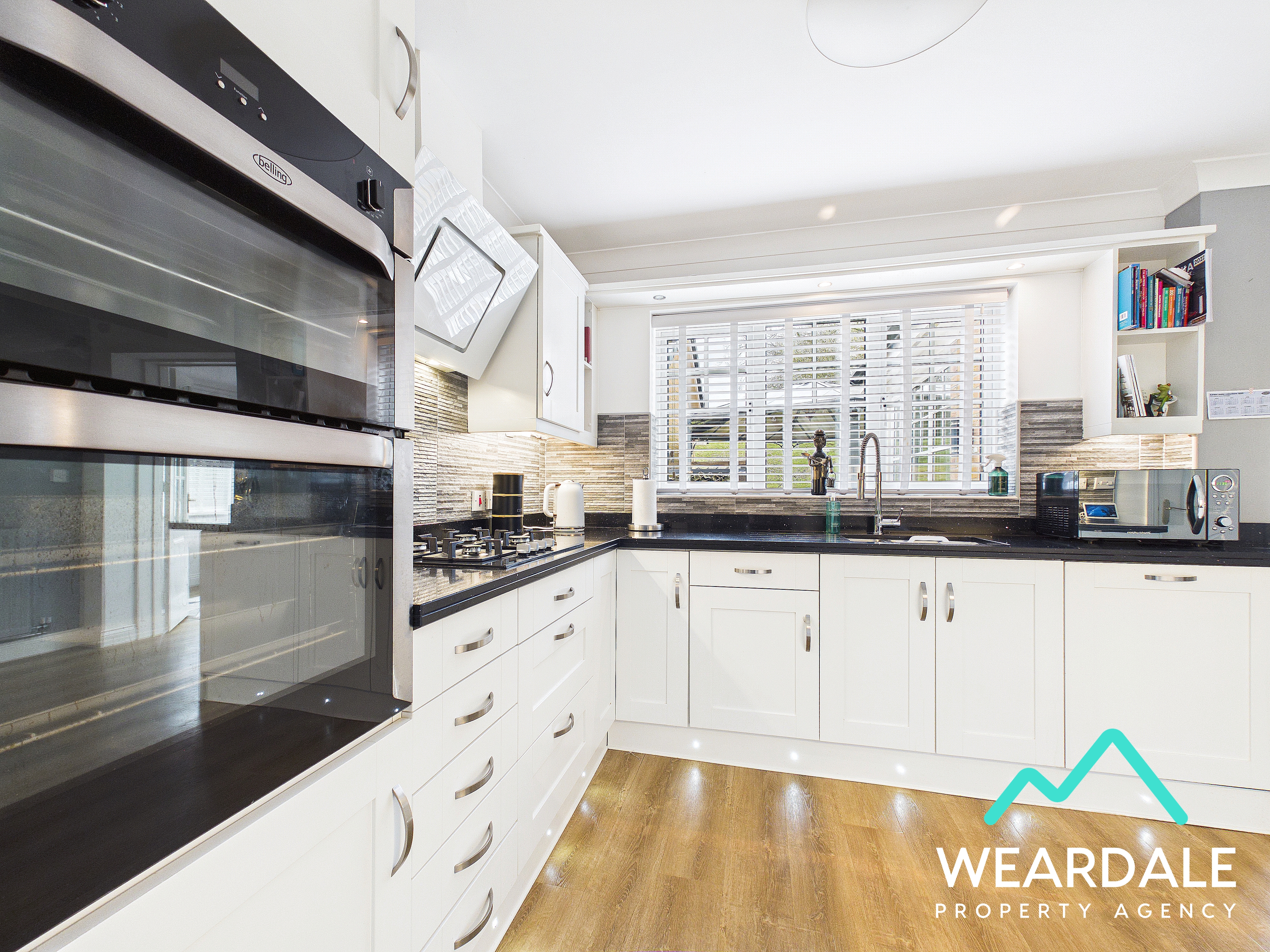 - Positioned to the rear of the property, accessed from the entrance hallway and living room, and providing onward internal access to the garden room and utility room - Well-proportioned kitchen - Double-glazed uPVC window to the North-East aspect, looking over the rear garden - LVT flooring - Neutrally decorated - Half tiled walls to the Northern, Western, and Southern sides - Range of over/under the counter storage units - Quartz worktops - 1.5 stainless steel sink with mixer tap - Built-in double electric oven - Built-in hob with overhead extractor - Integrated dishwasher - Two ceiling light fittings - Kitchen cupboard downlights and plinth spotlights - Radiator