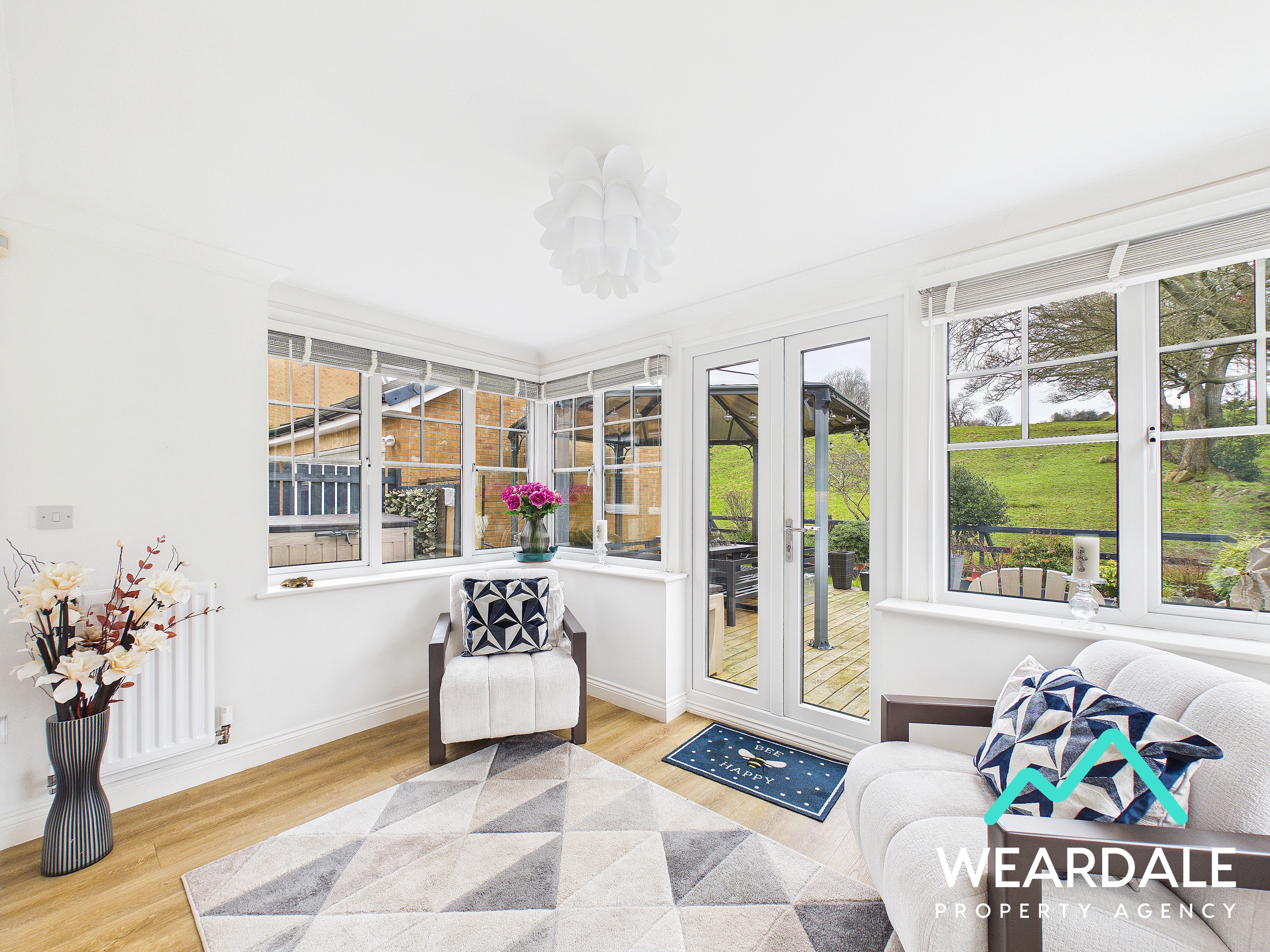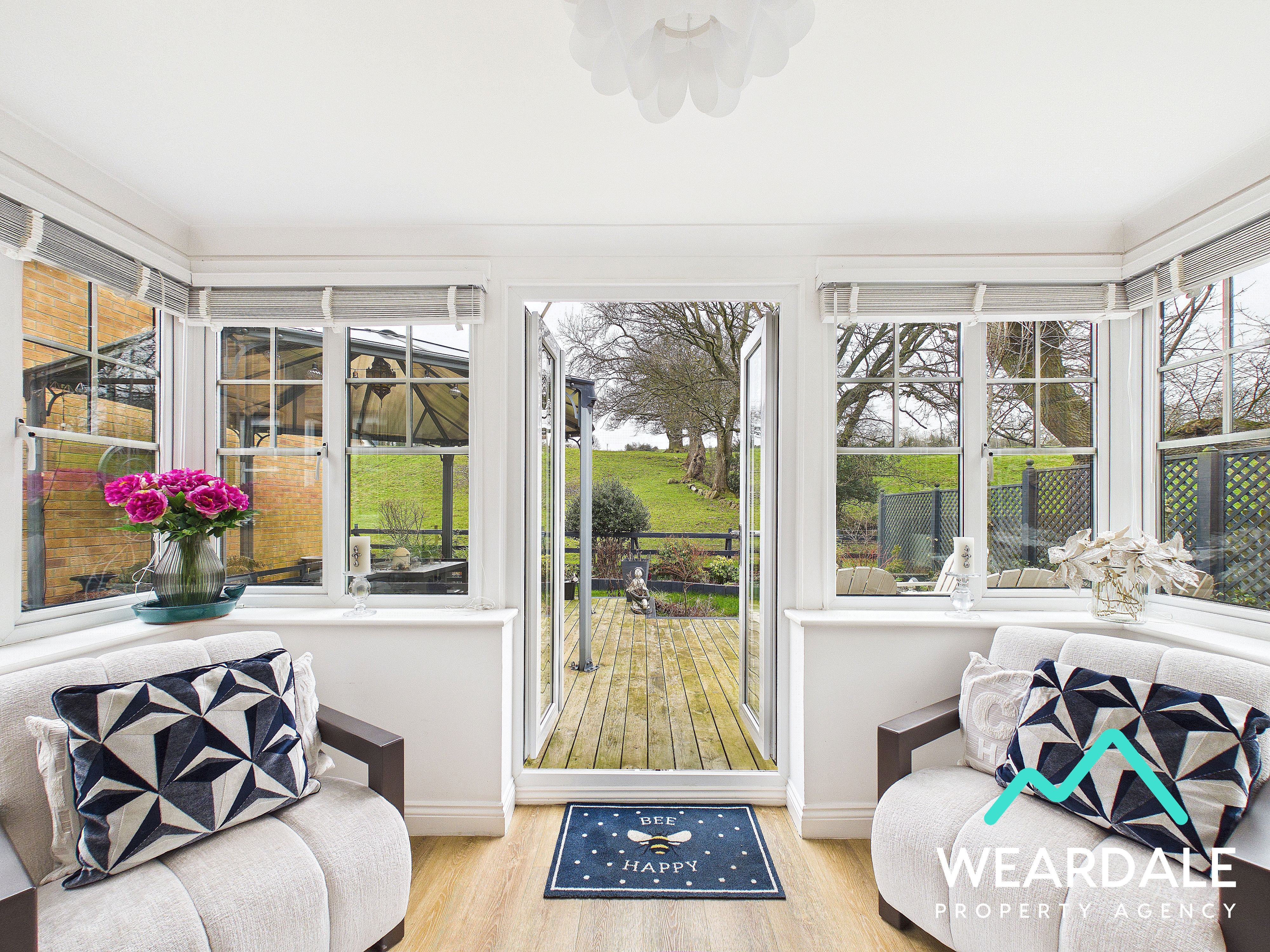 - Positioned to the rear of the property, accessed from the kitchen and dining room, and providing external access to the rear garden via double uPVC doors with clear panes - Triple aspect with double-glazed uPVC windows to the Northern, Eastern and Western sides, providing stunning views of the surrounding hillsides - LVT flooring - Neutrally decorated - Central ceiling light fitting - Two radiators - Space for garden room furniture