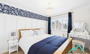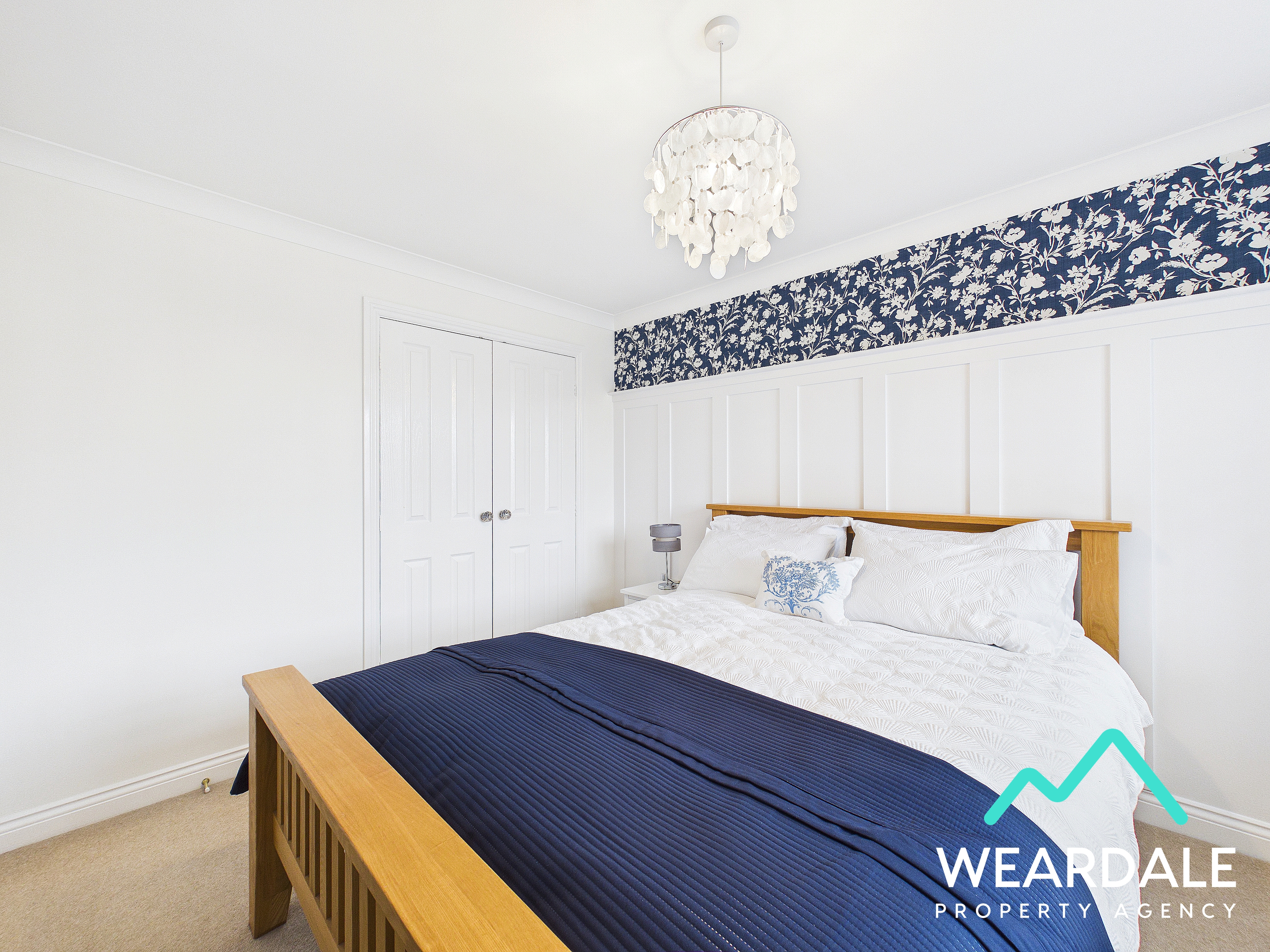 - Positioned to the front of the property and accessed from the landing - Well-proportioned double room - Double-glazed uPVC window to the South-West aspect, looking over the front of the property - Carpeted - Decorative wood panelled wall to the Eastern side - Built-in double wardrobe - Central ceiling light fitting - Radiator - Space for free-standing storage furniture