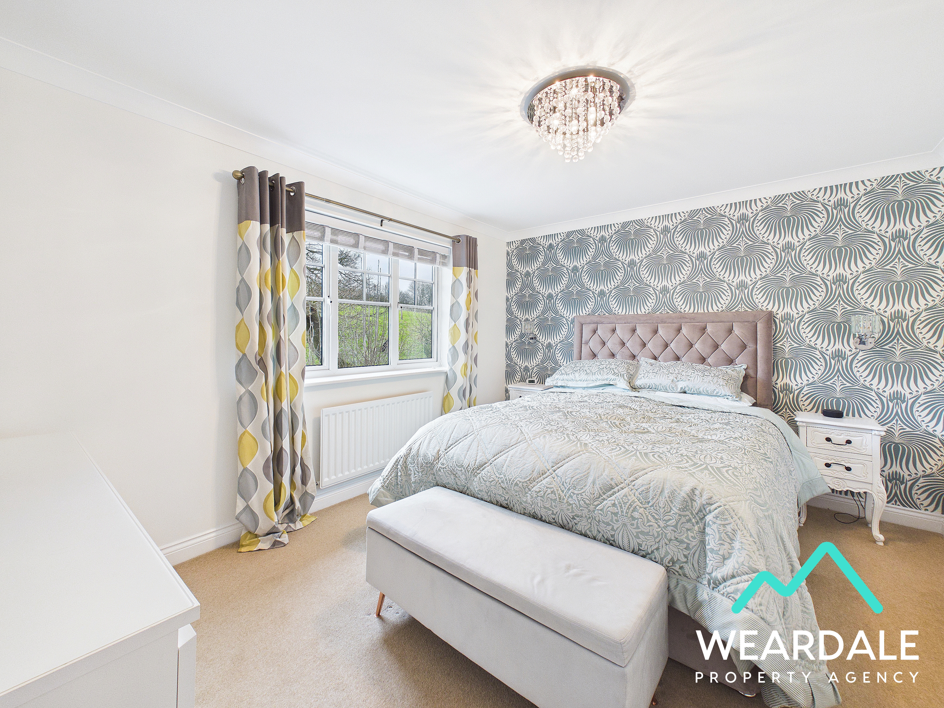 - Positioned to the rear of the property and accessed from the landing - Well-proportioned double room with En-suite - Double-glazed uPVC window to the North-East aspect, looking over the rear of the property, and providing beautiful views of the surrounding hillsides - Carpeted - Neutrally decorated - Central ceiling light fitting and two wall mounted light fittings - Radiator - Two built-in double wardrobes - Space for free-standing storage furniture