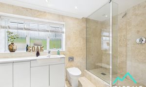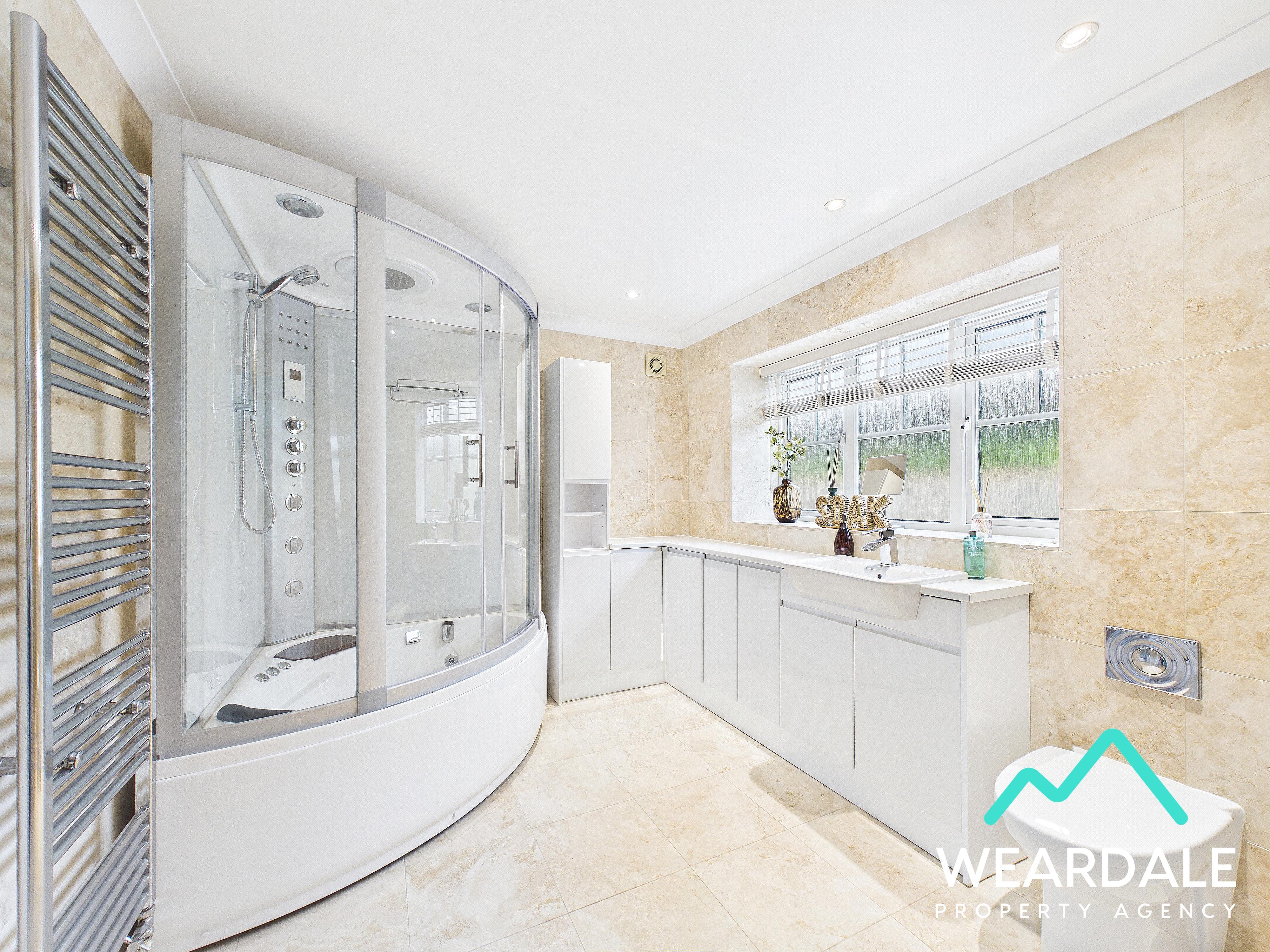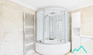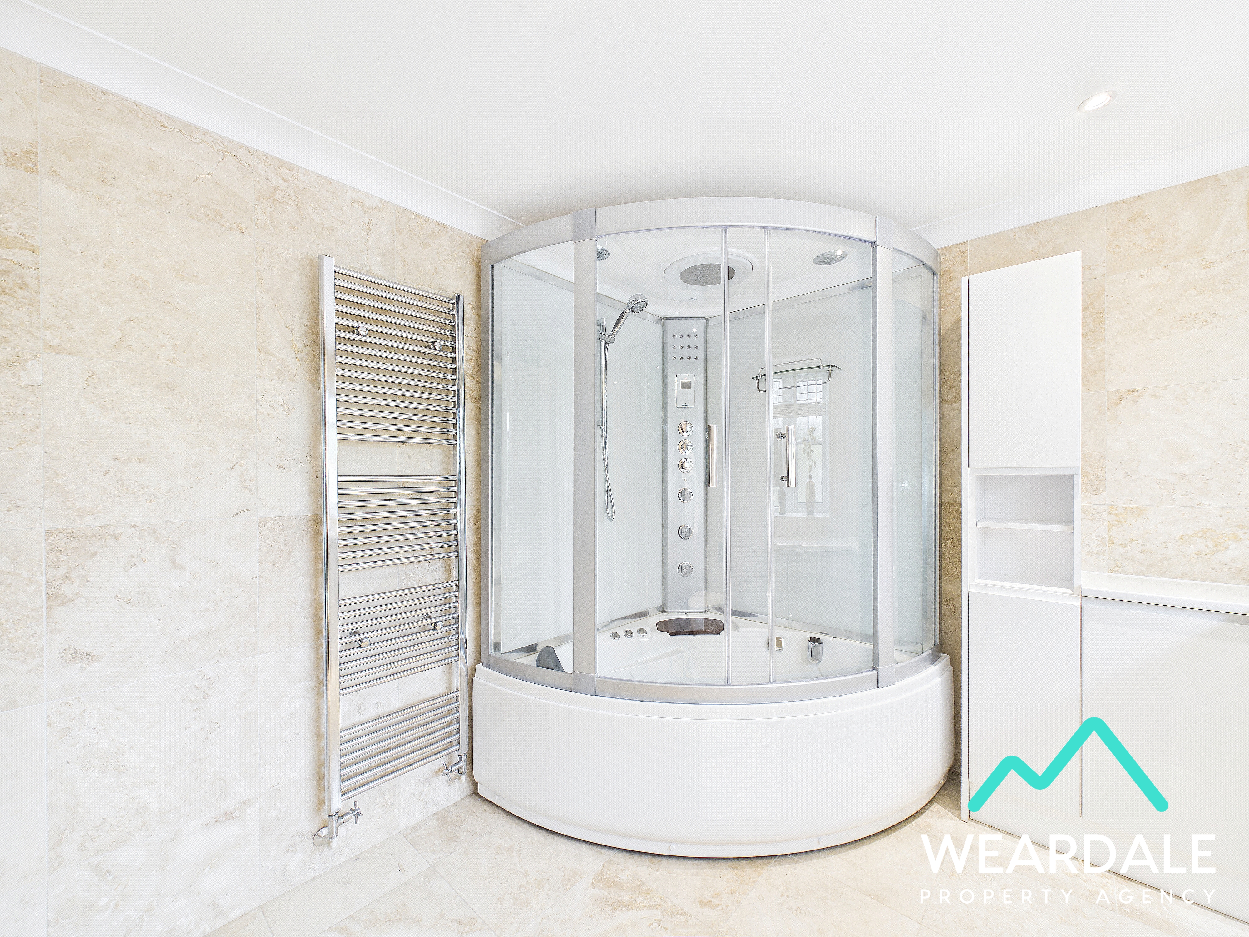 - Positioned to the rear of the property and accessed from bedroom 1 - Large En-suite - Double-glazed uPVC window with frosted panes to the North-East aspect - Tiled flooring - Fully tiled walls - Fully remote controlled Bluetooth whirlpool bath, with sliding glass doors, steam feature, body jets, mood lighting, and overhead shower - Corner walk-in shower, accessed via one step up, with a fully tiled enclosure, glass screen, and mains-fed shower - WC - Hand-wash basin set on a large corner vanity unit with multiple under counter storage cupboards - Ceiling spotlights - Vertical heated towel rail - Extractor fan
