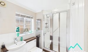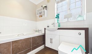 - Positioned to the Western side of the property and accessed from the landing - Double-glazed uPVC window with frosted pane to the Western aspect - Laminate flooring - Neutrally decorated - Half tiled walls to the Eastern, Southern and Western sides - Panel bath - Corner shower cubicle accessed via one step up, with a fully tiled enclosure, folding glass door, and mains-fed shower - WC - Hand-wash basin set on a vanity unit with under counter storage cupboards - Ceiling spotlights - Vertical heated towel rail - Extractor fan