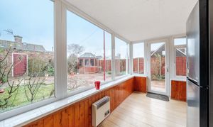 The accommodation starts with a welcoming entrance hall leading to a front-facing sitting room, which flows gracefully into the dining area and through to a well-arranged galley kitchen. To the rear, a bright and versatile sun-room enhances the sense of space, offering an appealing spot for year-round enjoyment with doors opening directly onto the garden.