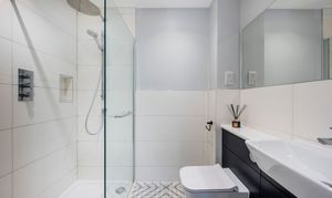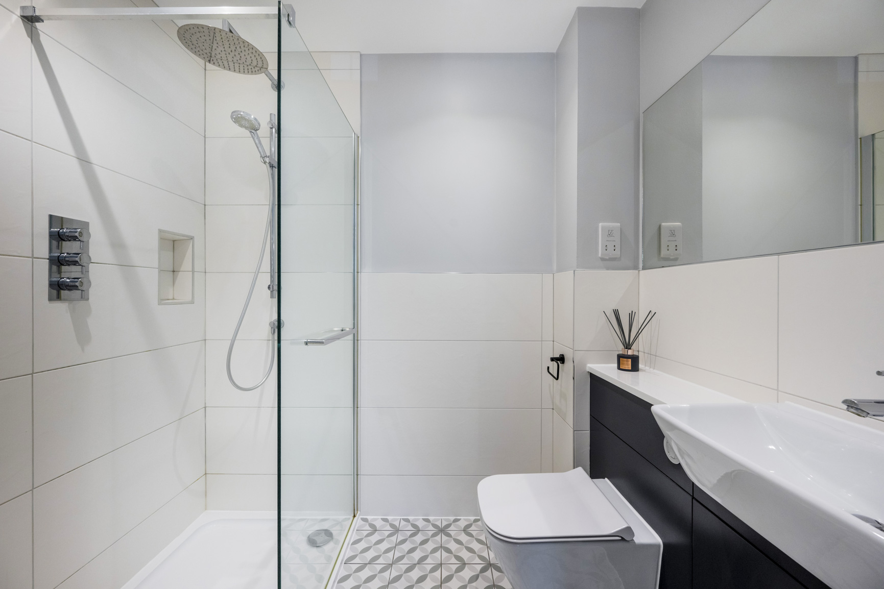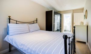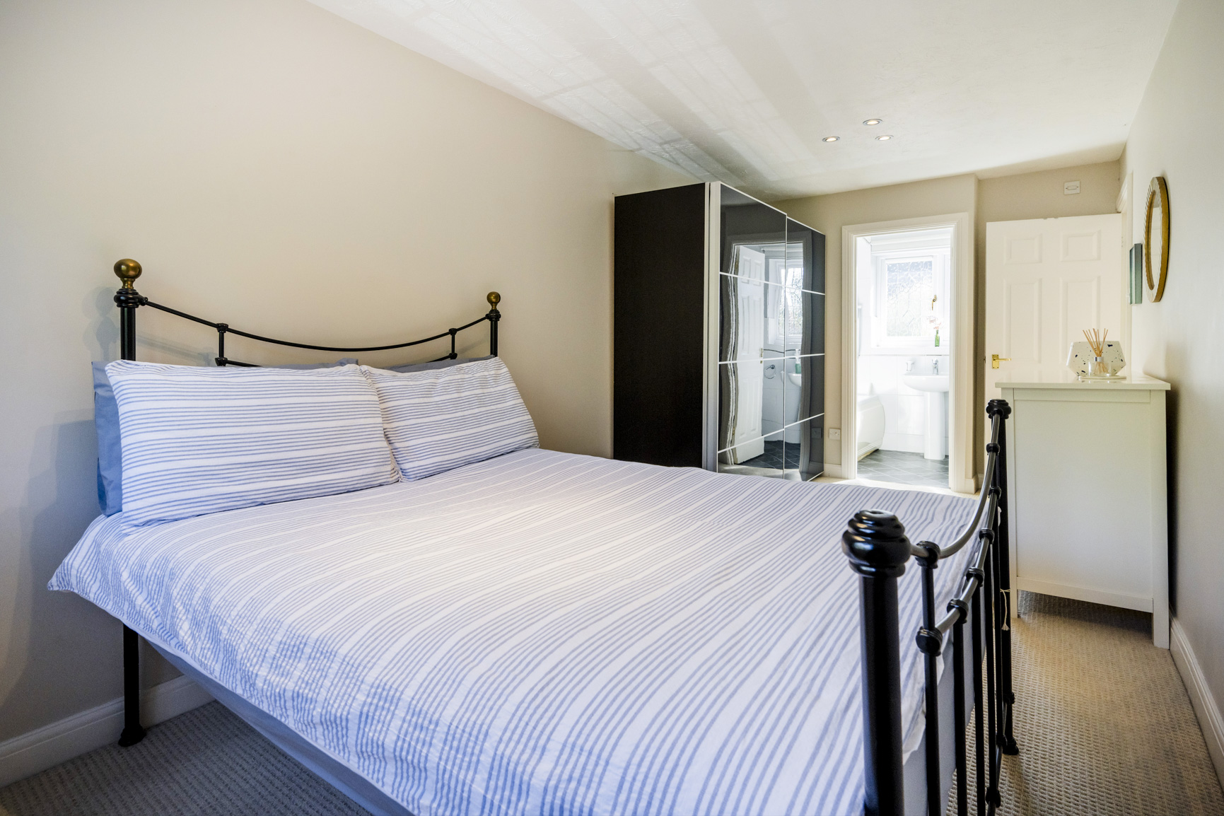 The second double bedroom is fresh and inviting, with a bold gloss-blue wardrobe. Its private ensuite includes a bath, providing a calm retreat.