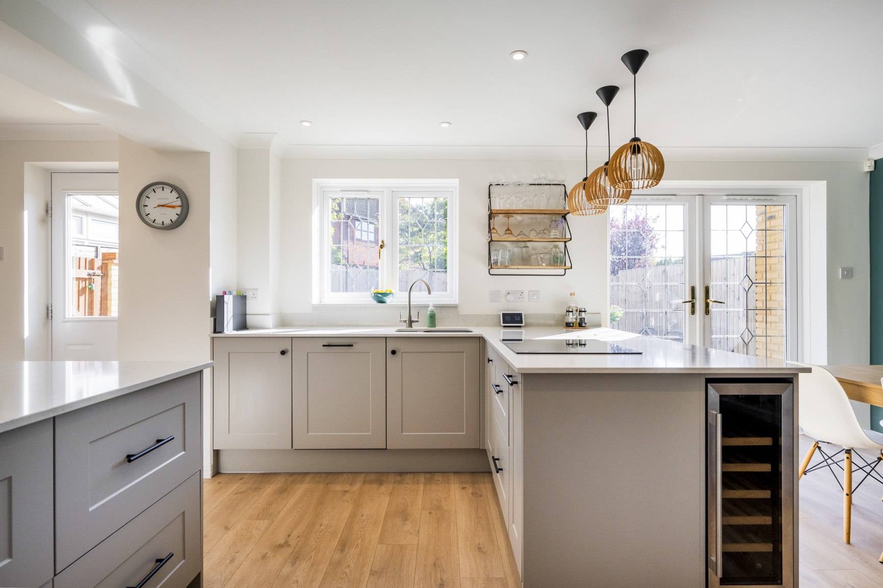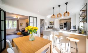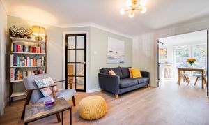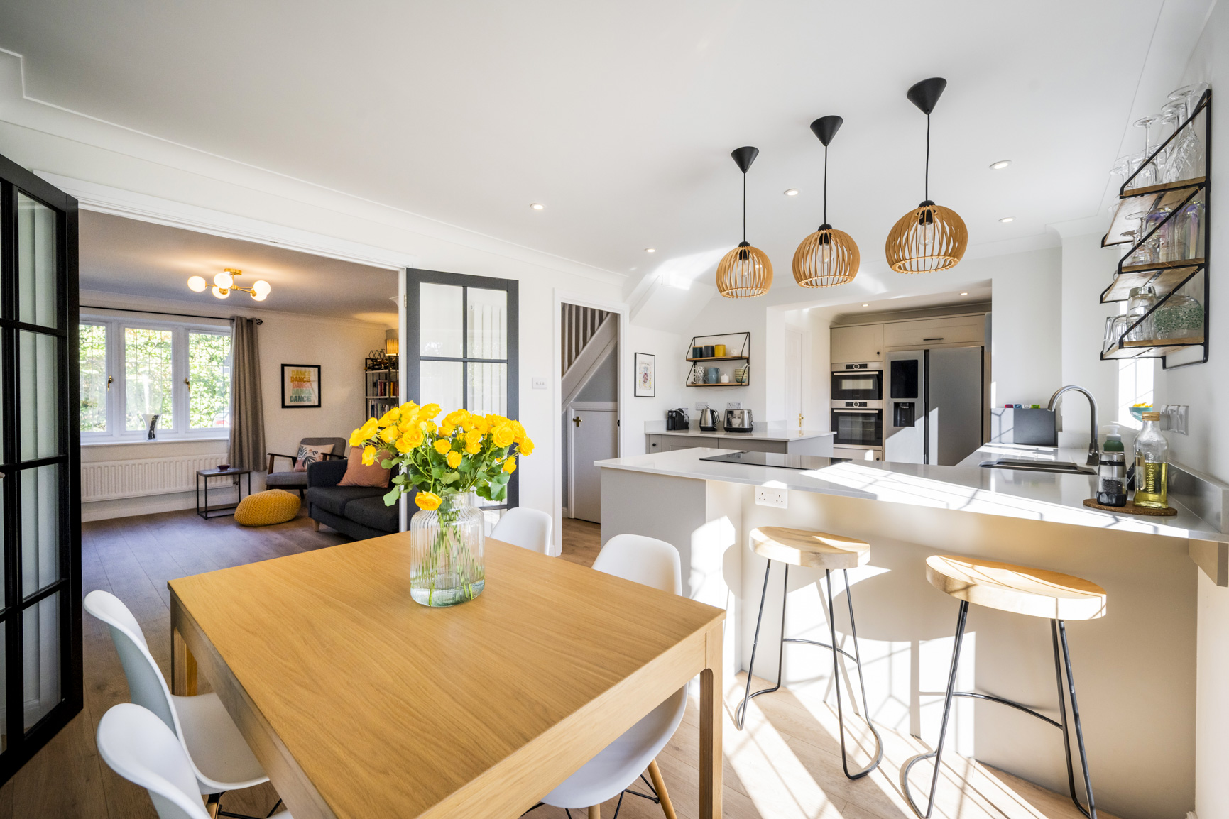 The living room takes its cue from Scandinavian design, with light wood-effect flooring, white and sage-green walls, and soft furnishings that add warmth and colour. Black-framed double doors open seamlessly into the kitchen-diner, creating a free-flowing space ideal for family life and entertaining.