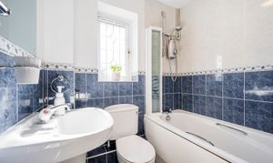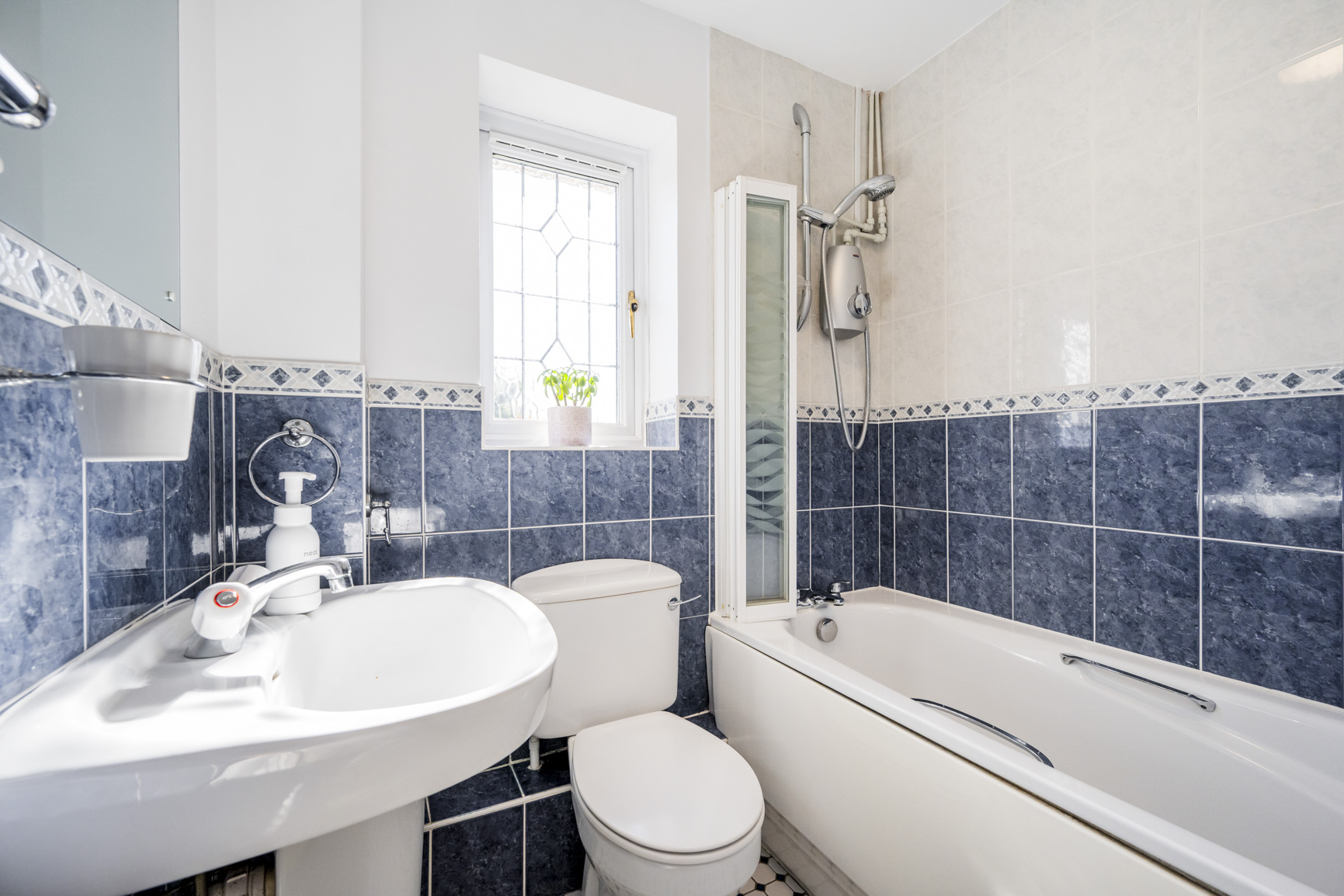 The third bedroom is bright and playful, complemented by the nearby family bathroom in cool blue-and-white tones with both bath and shower facilities.