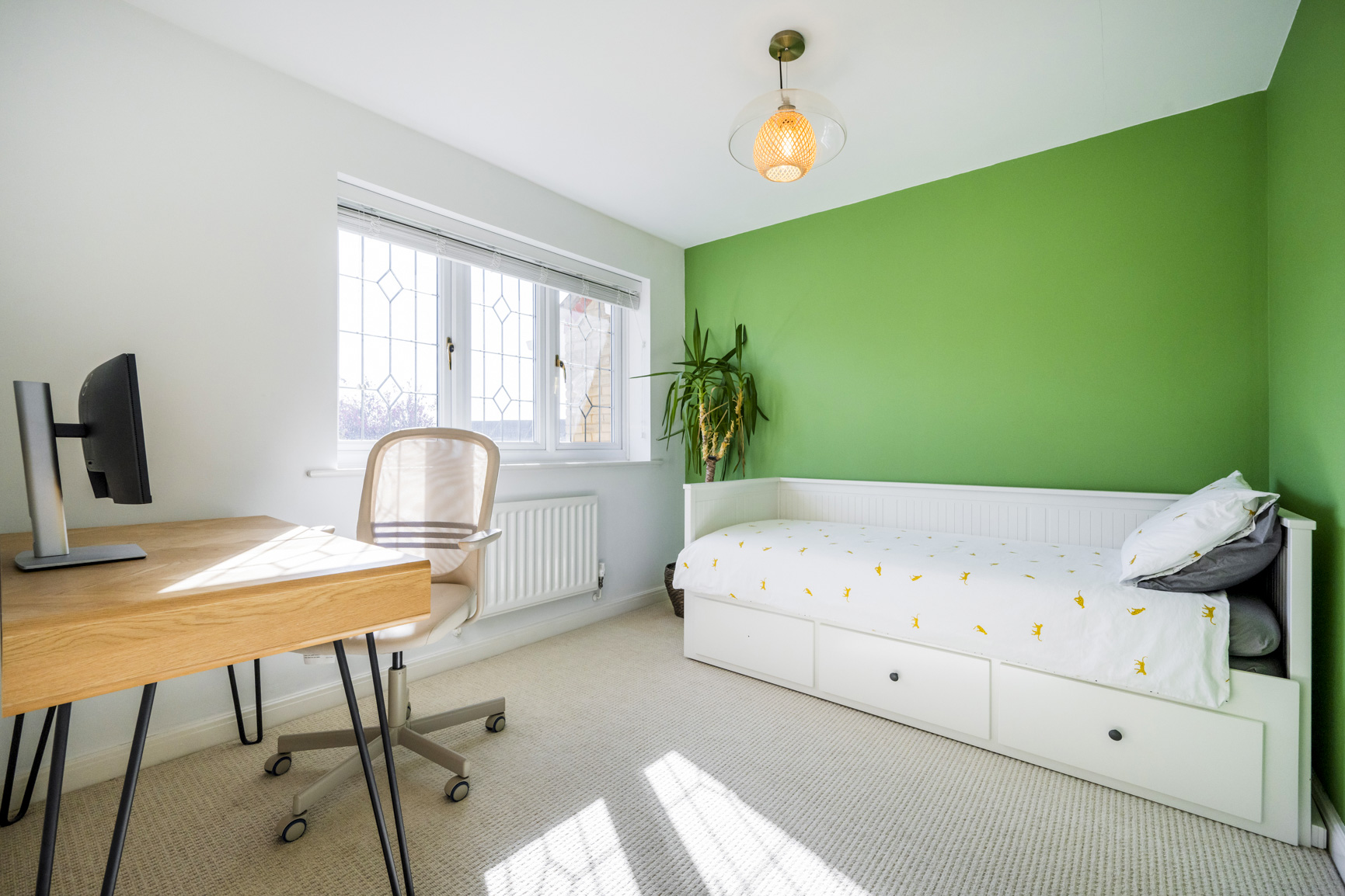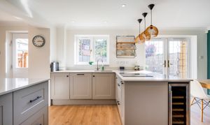 The kitchen continues the natural theme with wood-effect flooring and sleek ‘neutral’ cabinetry. Designer lighting, a bold green feature wall, and a spacious dining area set the stage for relaxed meals and gatherings. A breakfast bar offers the perfect spot for coffee while looking out over the garden through double patio doors. The kitchen is fitted to a high specification, including a wine cooler, marble effect quartz worktops, Neff dishwasher, Bosch double oven with integrated microwave, Bosch induction hob, and space for a large fridge-freezer.
