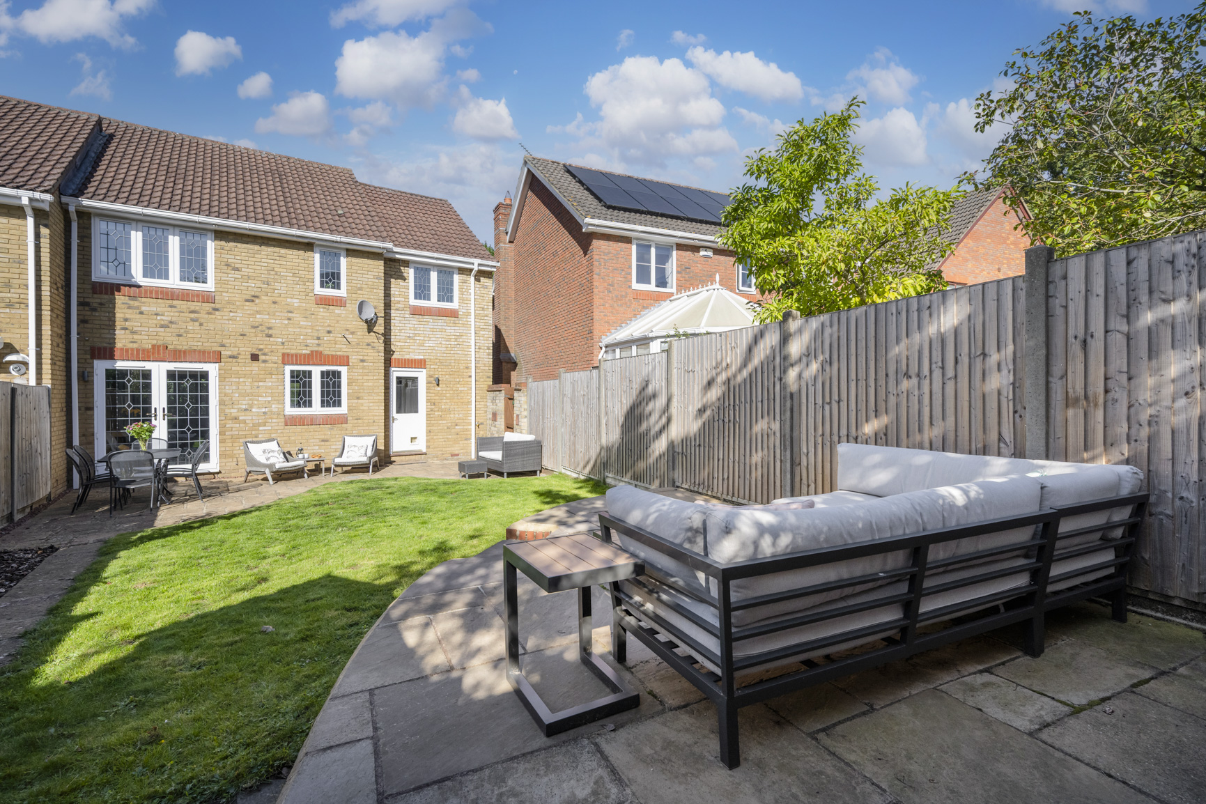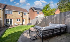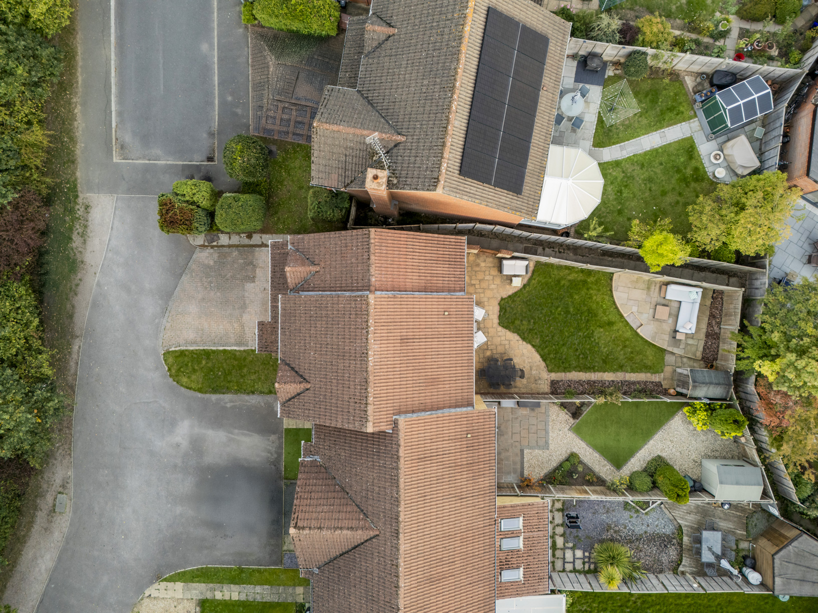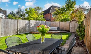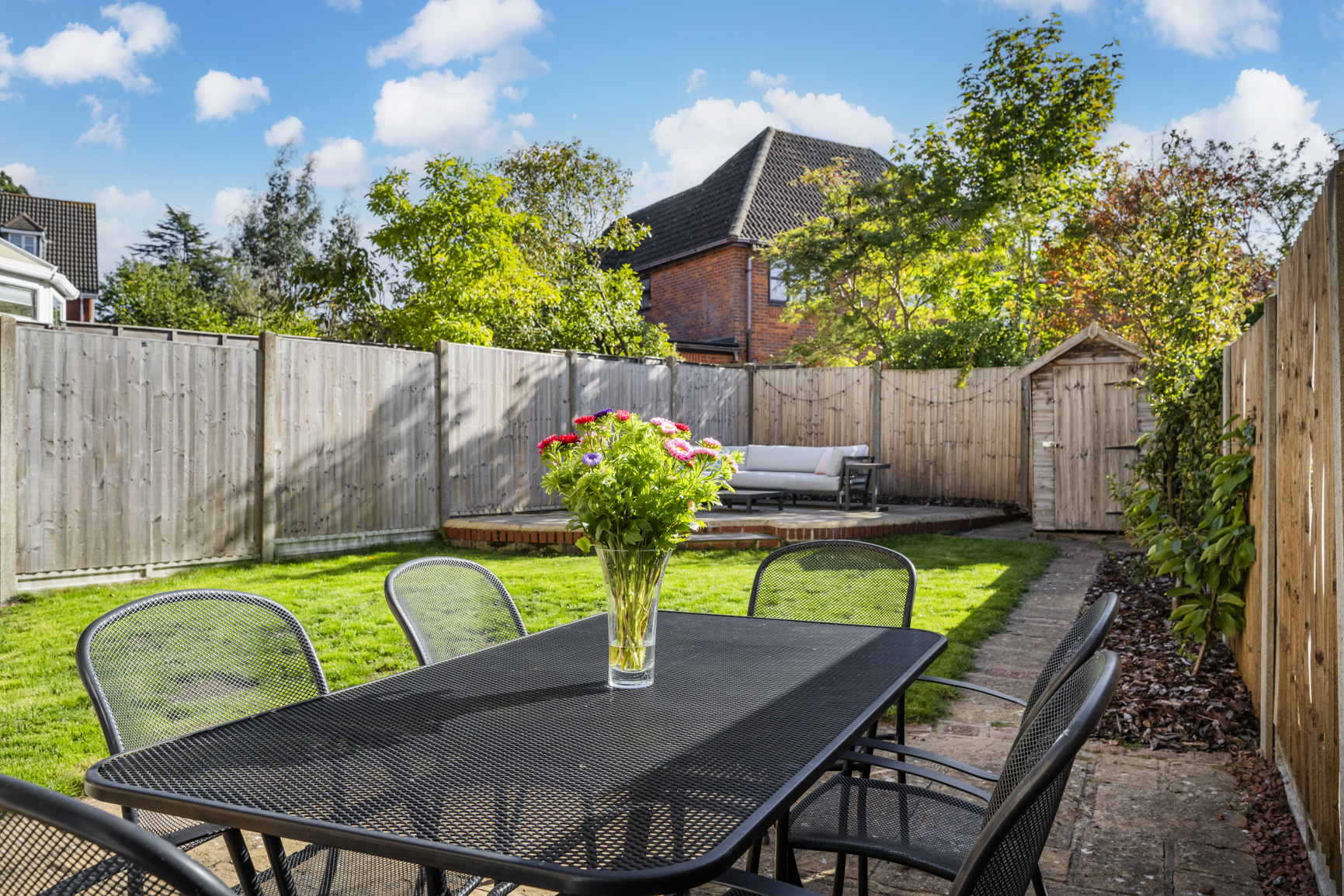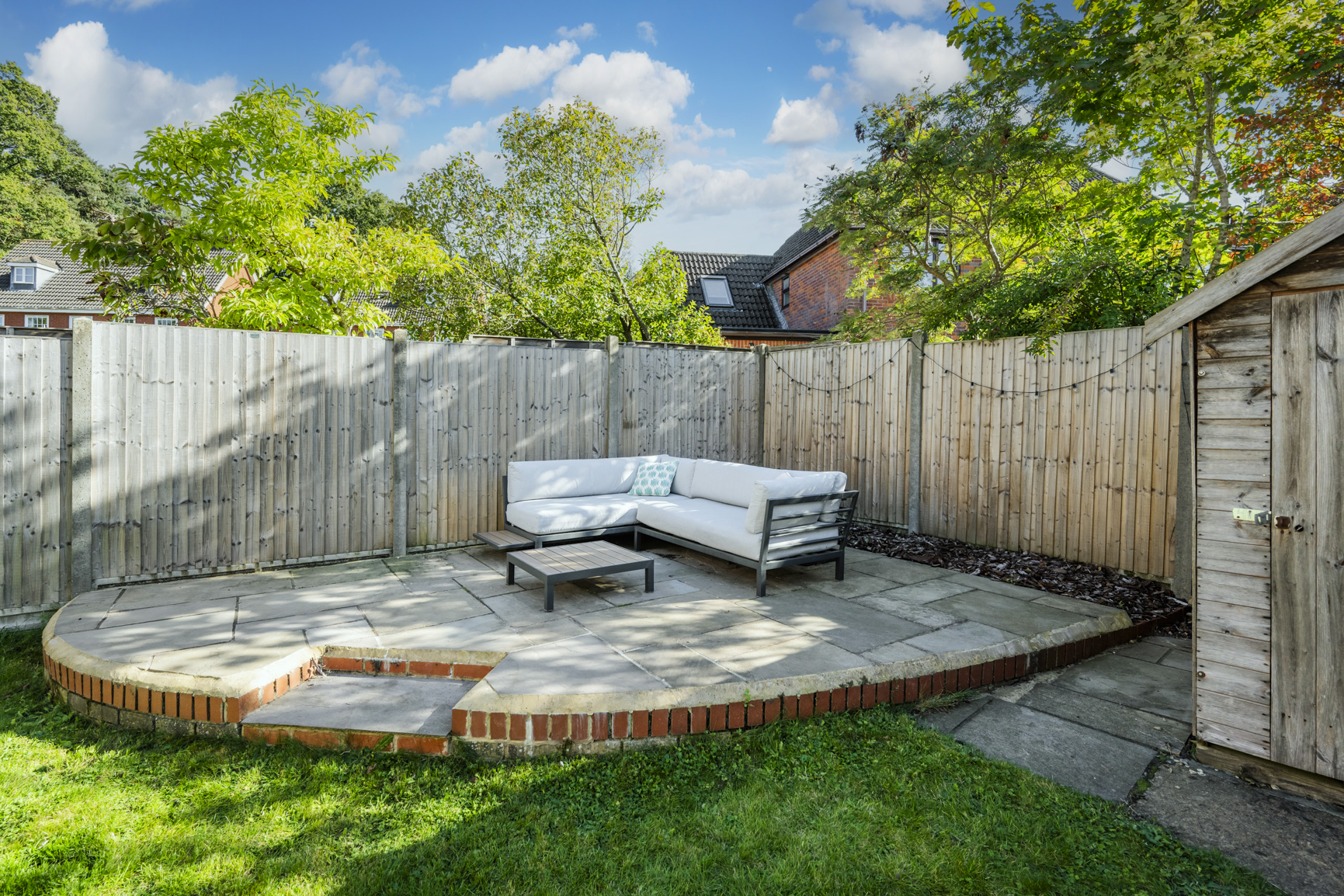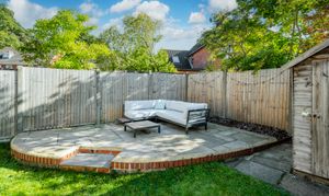The south facing garden has been landscaped to maximise enjoyment throughout the day. A curved patio near the house and a second patio at the far end provide multiple spots for dining and relaxation, while a neatly placed shed keeps equipment out of sight.