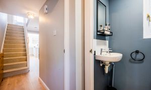 Step inside through a smart grey front door into a bright hallway with an understairs cupboard and a chic cloakroom. Striking windows and glazed internal doors with black surrounds set a contemporary tone throughout the ground floor.