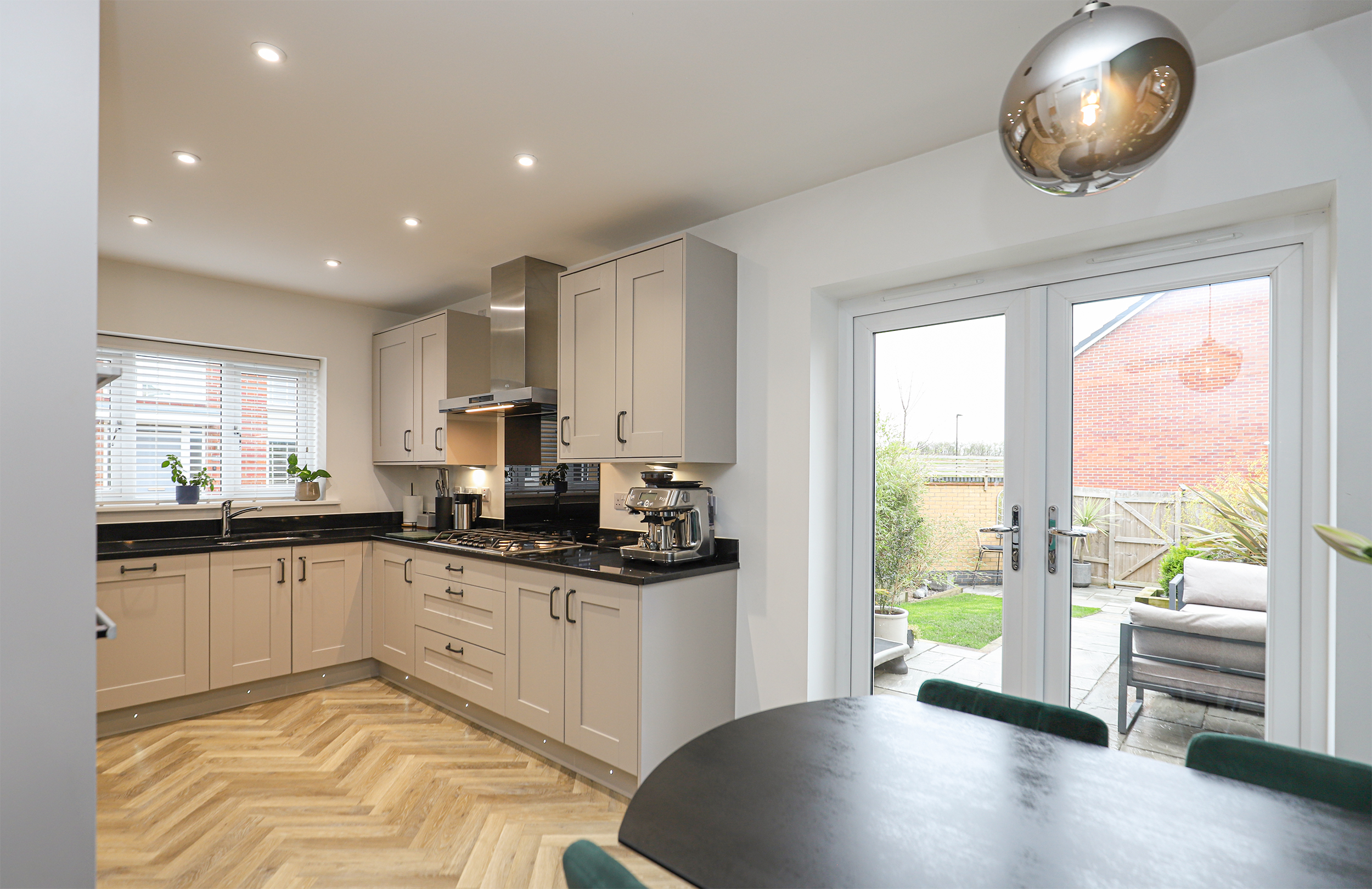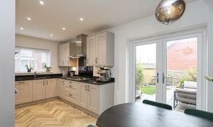 - An Open Plan Kitchen & Dining Room With Doors Opening Onto The Landscaped Rear