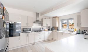 The ground floor is arranged in a double-fronted layout and comprises an entrance hall with stairs to the first floor and a cloakroom. To the left is a twin-aspect living room, while to the right is a well-appointed kitchen/dining room. The kitchen is fitted with a range of modern units complemented by upgraded granite worktops, a five-ring gas hob with extractor hood, integrated double oven and dishwasher, and upgraded lighting including inset spotlights and pendant fittings.
