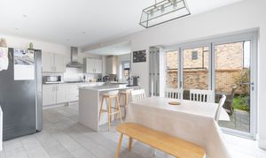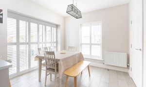 The dining area provides space for a six-seater table and features bi-folding doors opening onto the rear garden, with bespoke fitted shutters to both the front window and the bi-folding doors. A separate utility room provides additional granite worktop space with room for appliances beneath, access to an understairs storage cupboard and an external door to the garden.