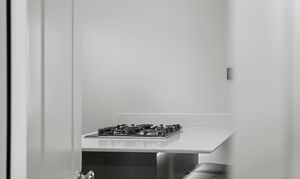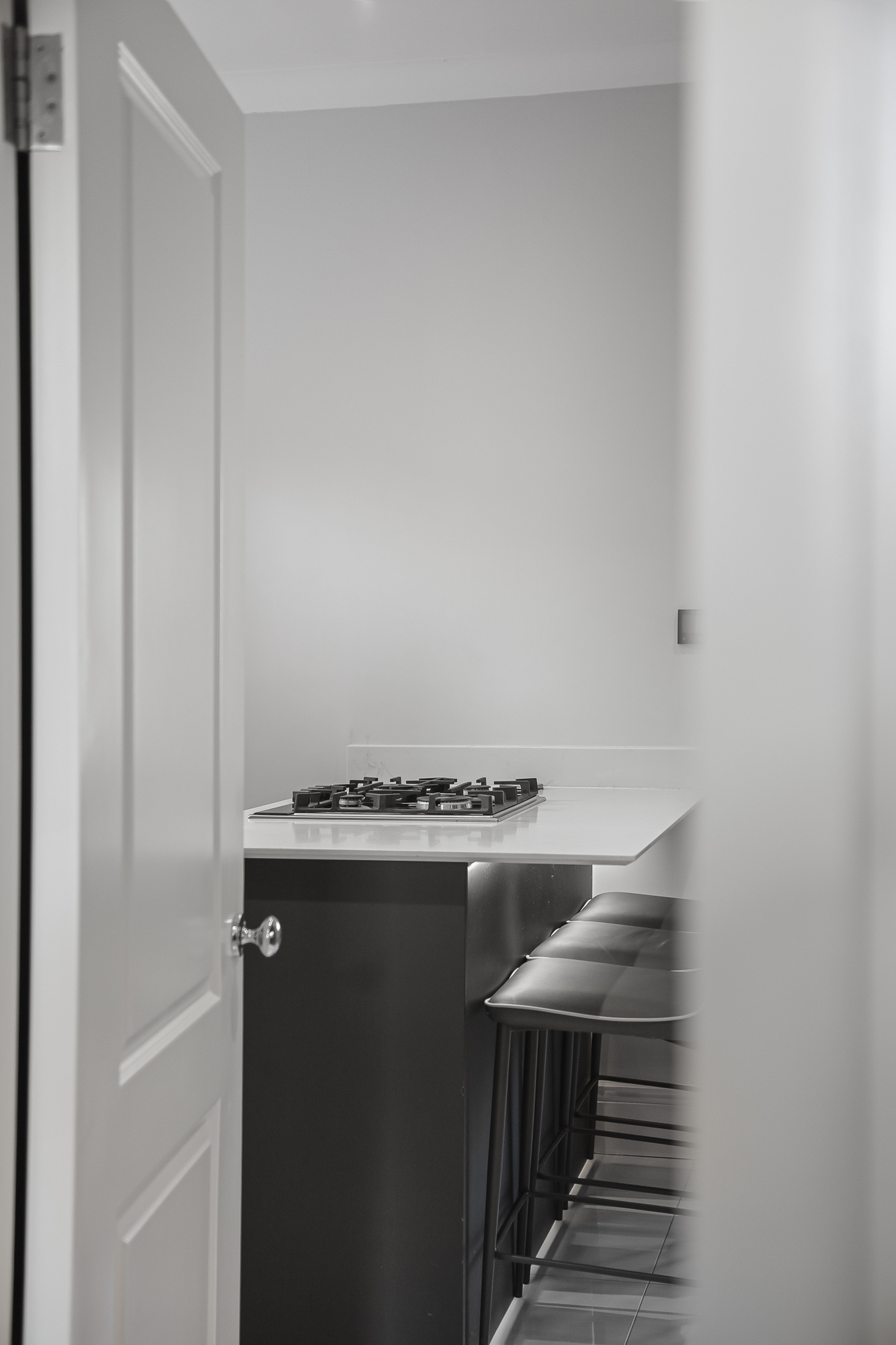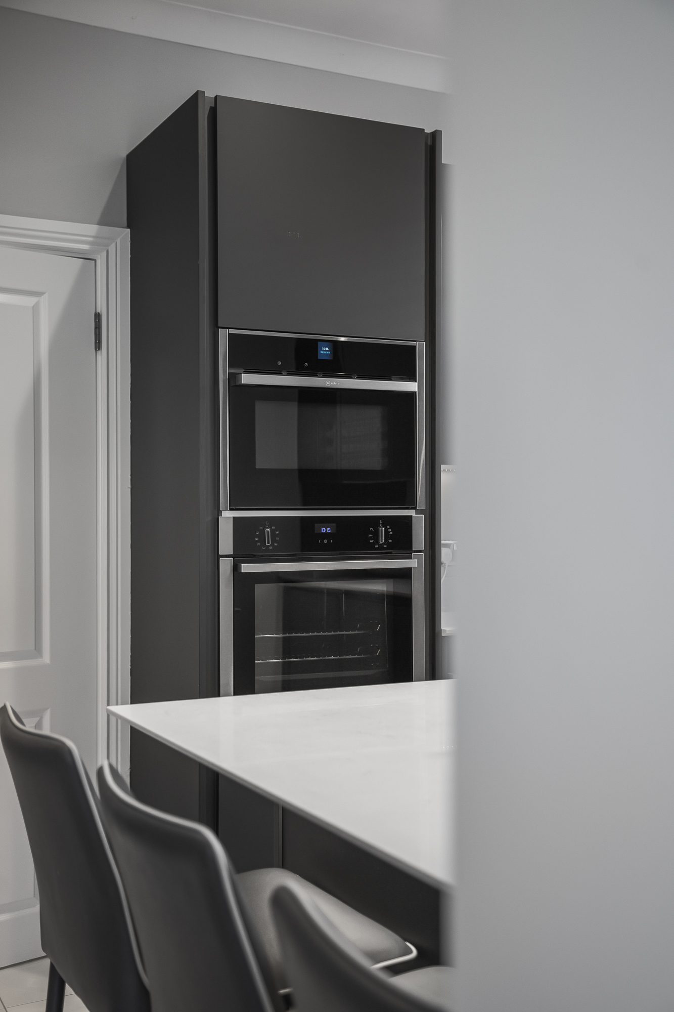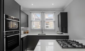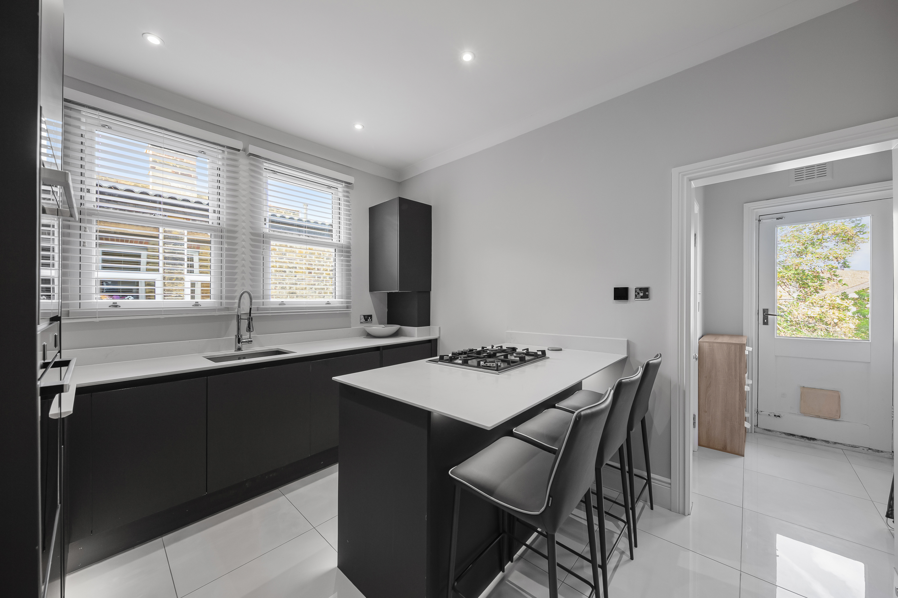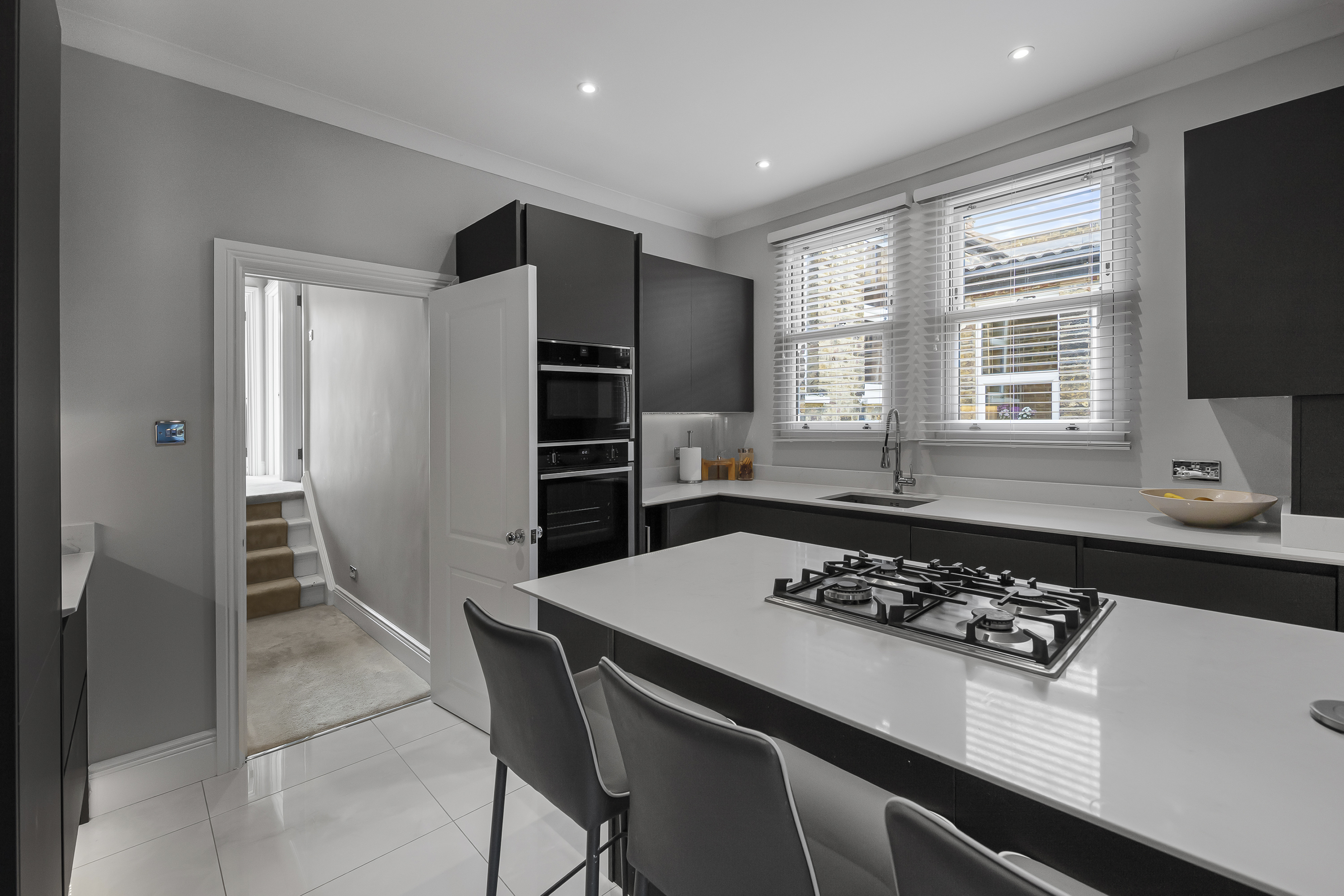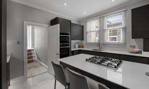 To the rear of the flat is the kitchen, which is just stunning. It has been recently fitted with dark grey handleless units, solid white worktops, and a central island with a gas hob. All the appliances are integrated, and the island doubles as a breakfast bar with seating for a few. It’s a bright space, too, owing to the two large west-facing windows, which get the light from early afternoon into the evening.