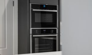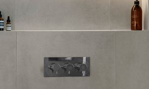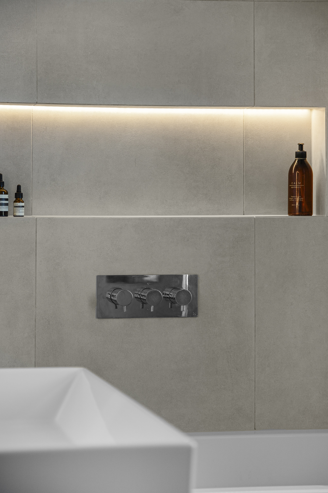 The bathroom is modern and finished to a high standard. Large-format grey tiles cover the walls and floor, there's a full-size bath with a shower over it, integrated shelving with LED strip lighting, and a window that brings in natural light—something you don't always get in a flat bathroom. It's spacious enough to move around comfortably and is genuinely finished beautifully.