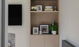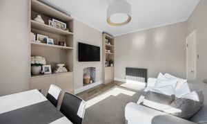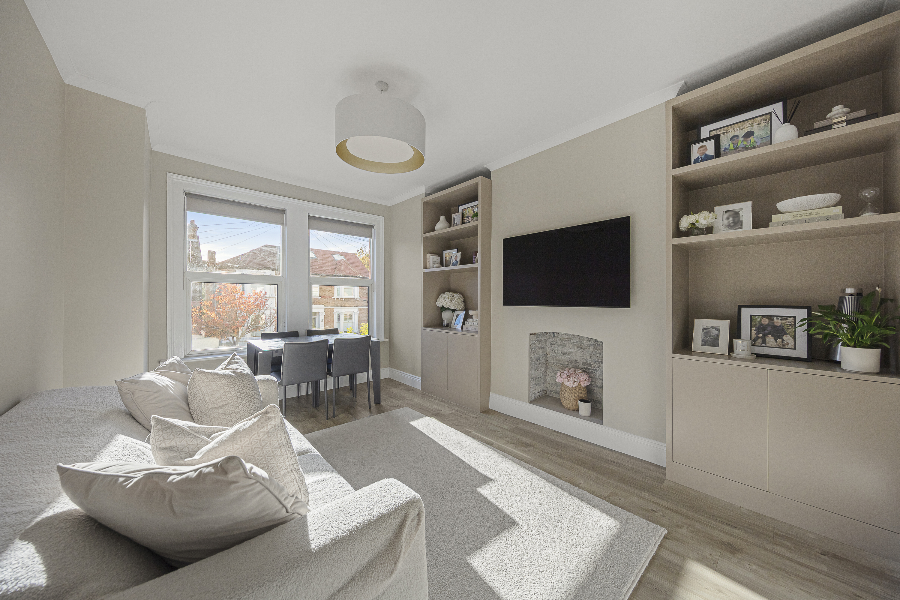 This beautiful flat is on the first floor of a well-maintained period building and is accessed via its own front door on the ground floor. The first-floor landing leads to a layout that's been clearly thought through. The reception room sits at the front of the building and is a good size—around 15 feet by 12 feet—with fitted storage units flanking the fireplace alcove and built-in shelving that adds useful storage without eating into the floor space. There’s space for a pair of sofas if wanted, or a larger sofa and a dining table, as it is set up currently. The light here is fantastic, as it faces south; this room gets incredible light in the first half of the day.