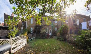 The kitchen opens onto the garden, which is a genuine asset here—it's a shared space but a generous one, stretching back around 34 feet. The lawn is established, bordered by mature trees and plantings, and there's plenty of room for a table, chairs, and outdoor storage. It gets the western light, so again, it is bright in the second half of the day, but in peak summer, it will also see that southern sun in the middle of the day.