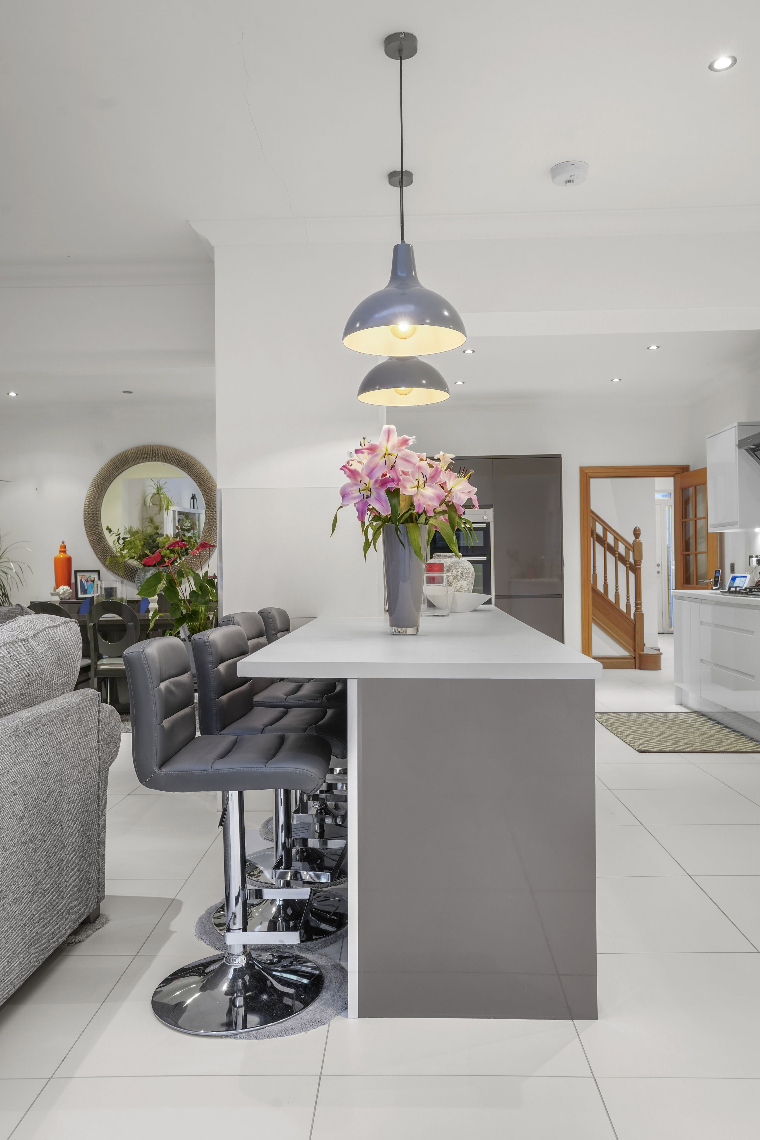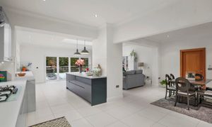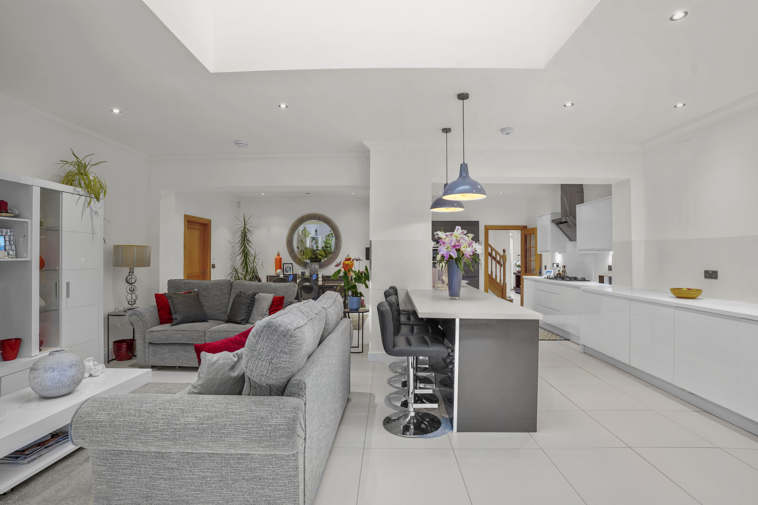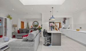 The rear of the home opens into a magnificent open-plan kitchen, dining and living space, created through a thoughtful extension. This spectacular area features a skylight that floods the room with daylight, bi-folding doors that span the width of the extension and extend the living space seamlessly into the garden, and underfloor heating for a feel of real luxury and year-round comfort.