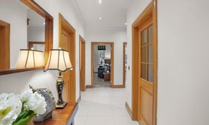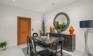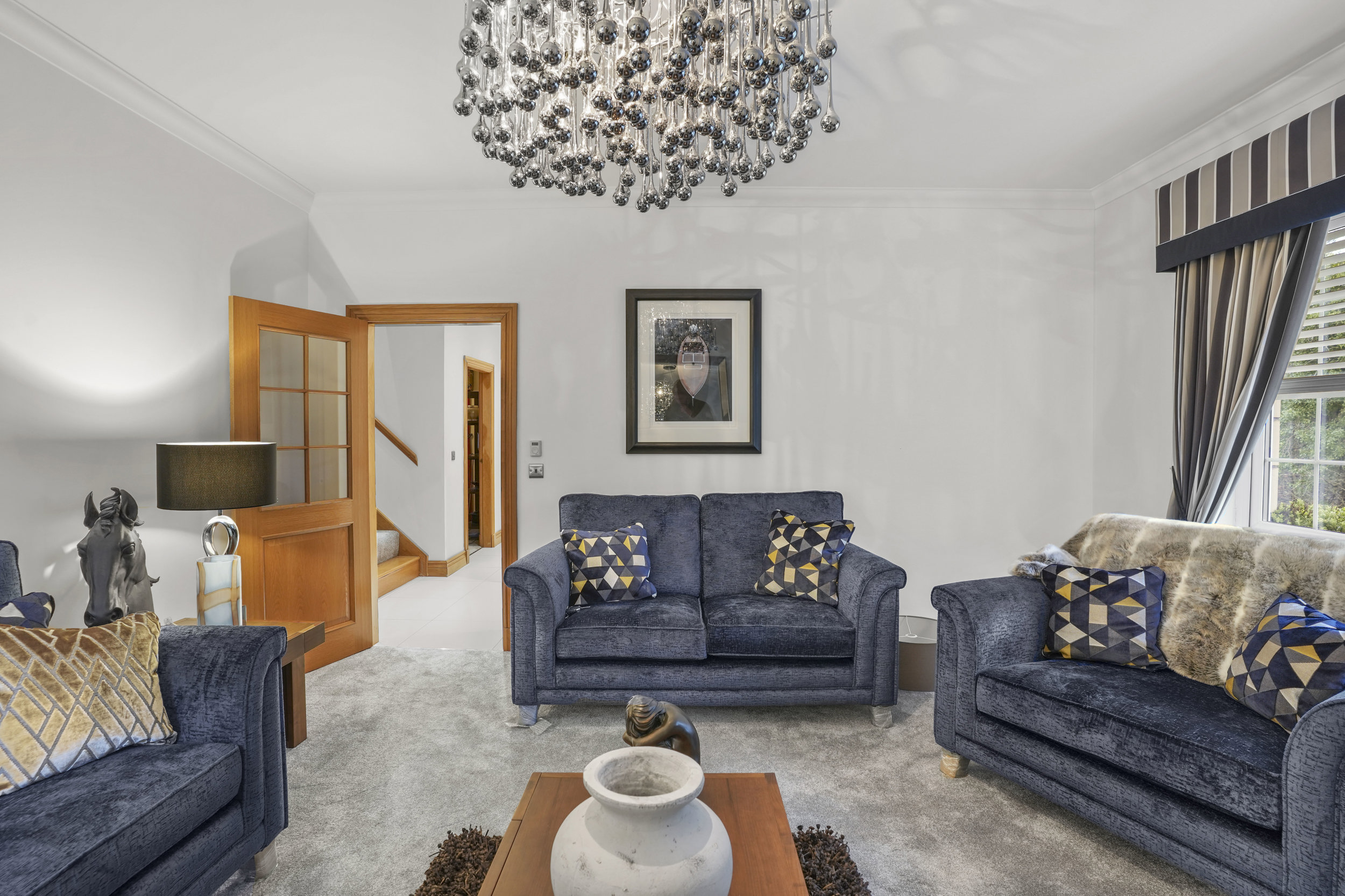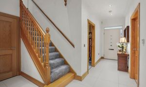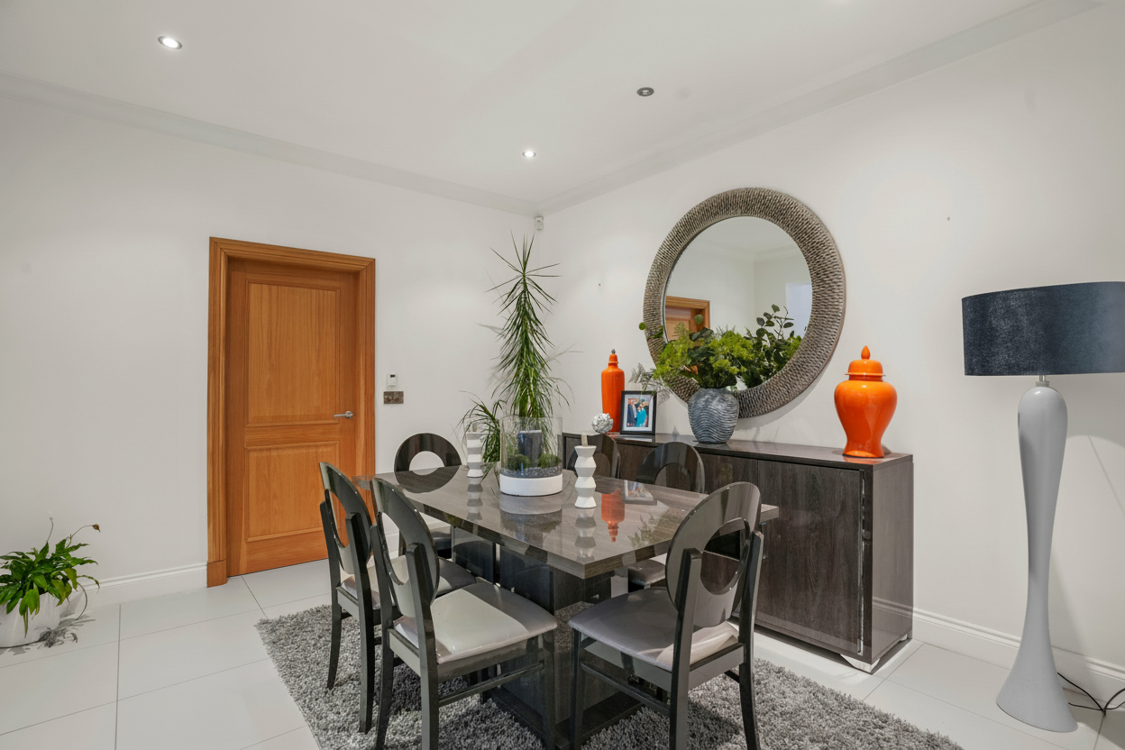 The ground floor is beautifully laid out, beginning with an impressive hallway finished in high-end Porcelanosa tiles that flow throughout the entire level. To the rear is a generous lounge, bright and inviting with newly fitted carpets and dual-aspect windows that allow natural light to pour in. To the front is a dedicated study - ideal for home working or quiet reading. Opposite the hallway sits the formal dining hall, a superbly sized room perfect for formal dining or entertaining.