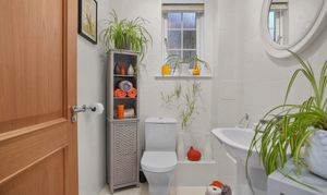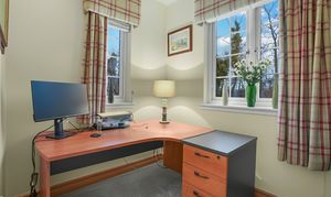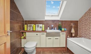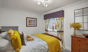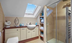 The principal bedroom enjoys a tranquil outlook over the stream, offering a calm and peaceful retreat at the end of the day. This luxurious space is further enhanced by extensive fitted wardrobes and its own beautifully tiled en-suite bathroom, complete with high-quality fixtures and a spa-like feel that elevates everyday comfort.