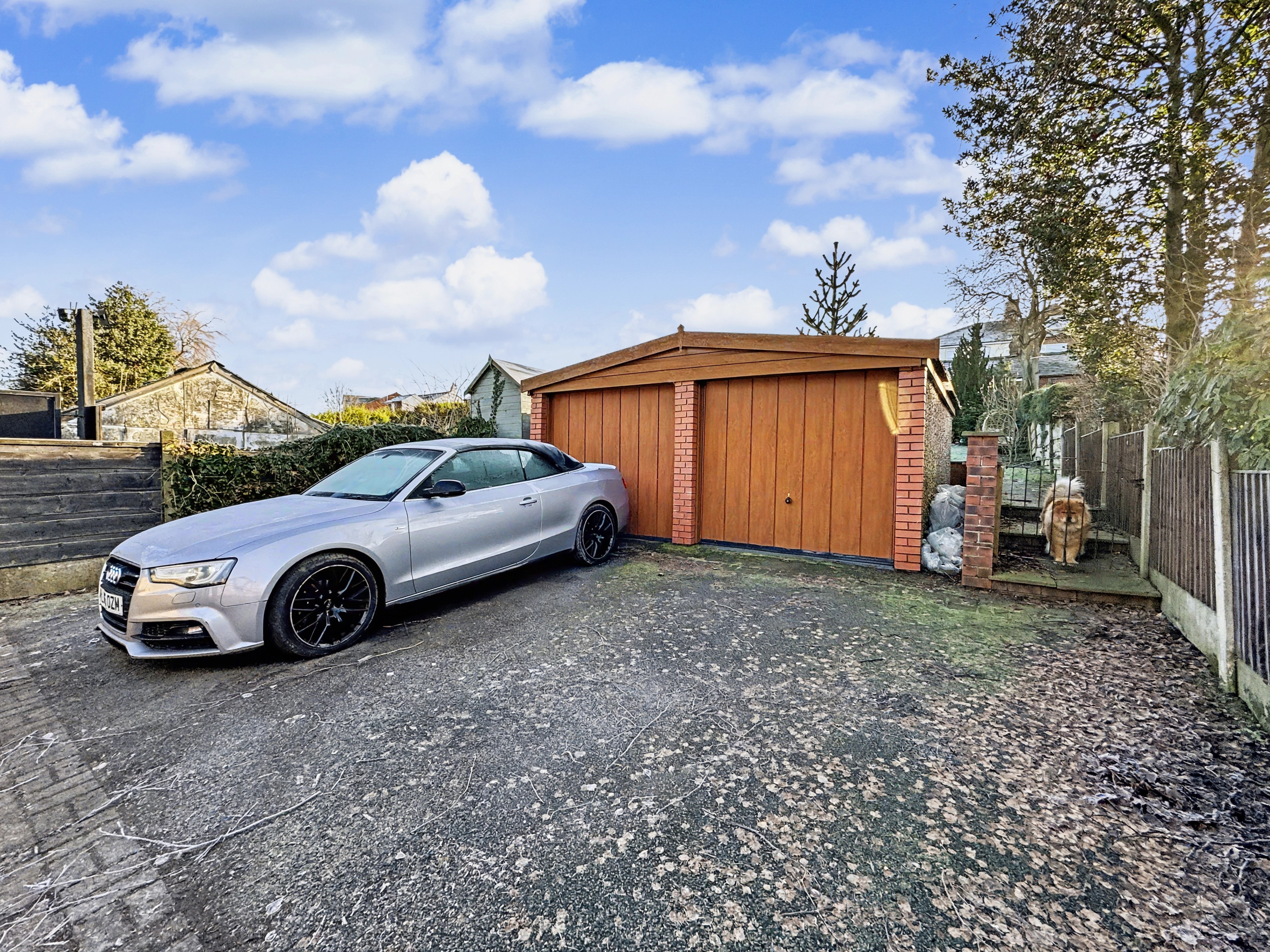 - Detached double garage with driveway parking for two to three vehicles