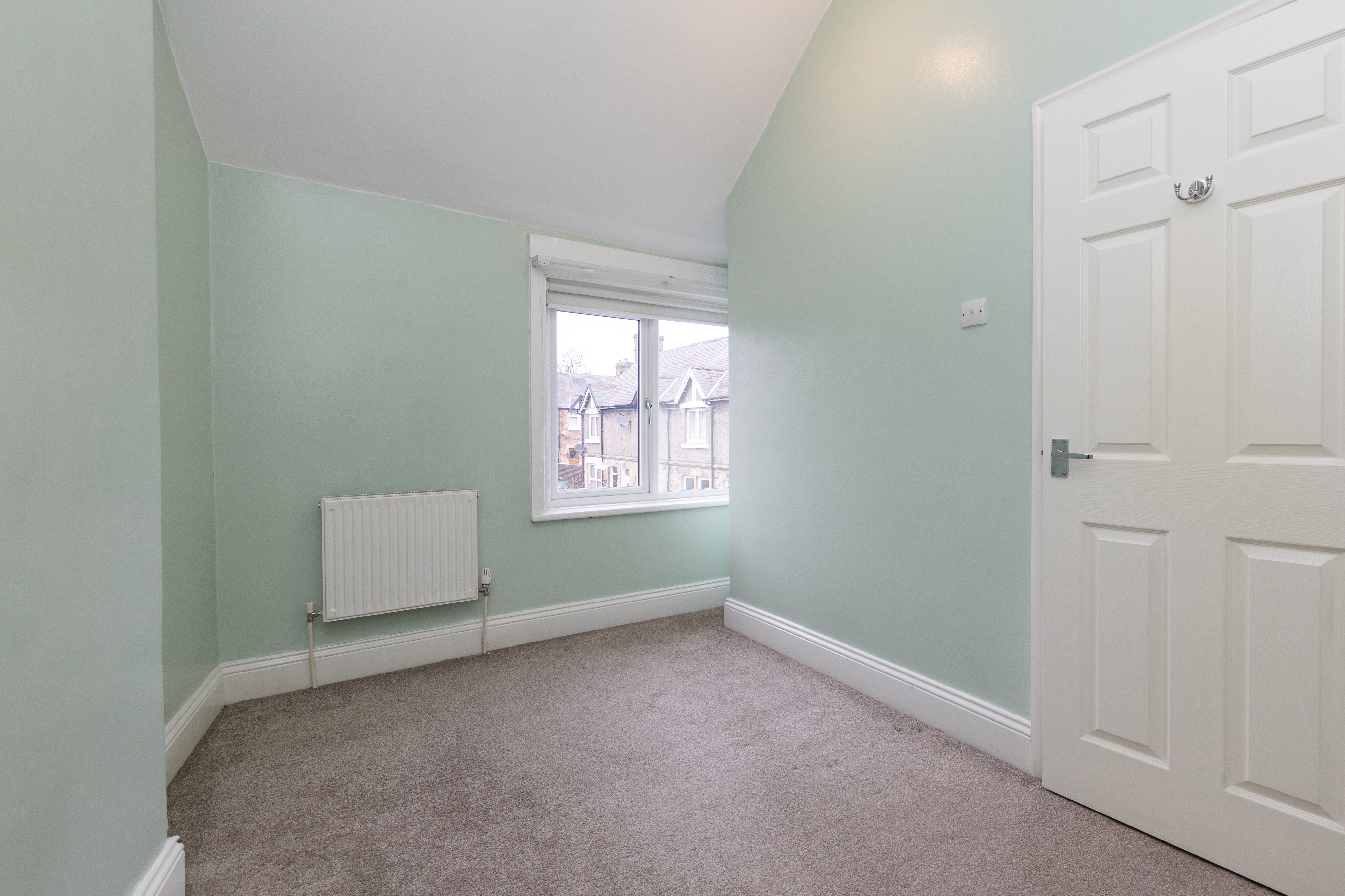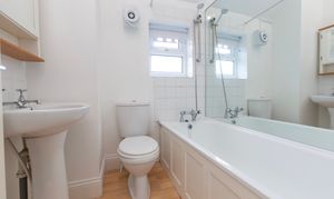 Upstairs, the principal bedroom is a generous double with built in storage, offering plenty of room for furniture and personalisation. The second bedroom is ideal as a guest room, nursery or home office. The bathroom is fitted with a bath and overhead shower, wash basin and WC, with natural light from a frosted window.