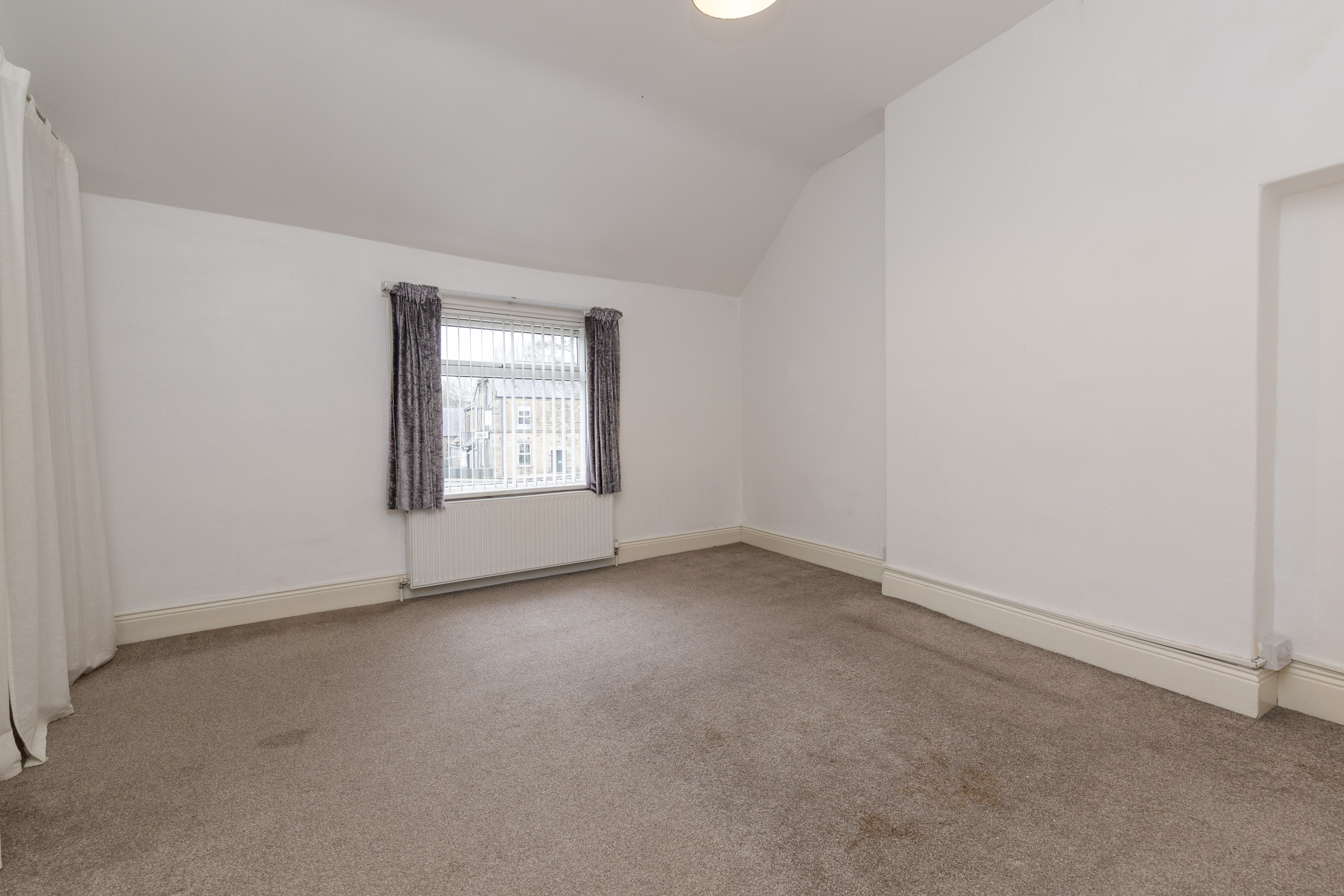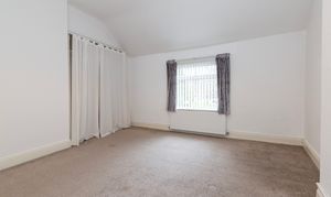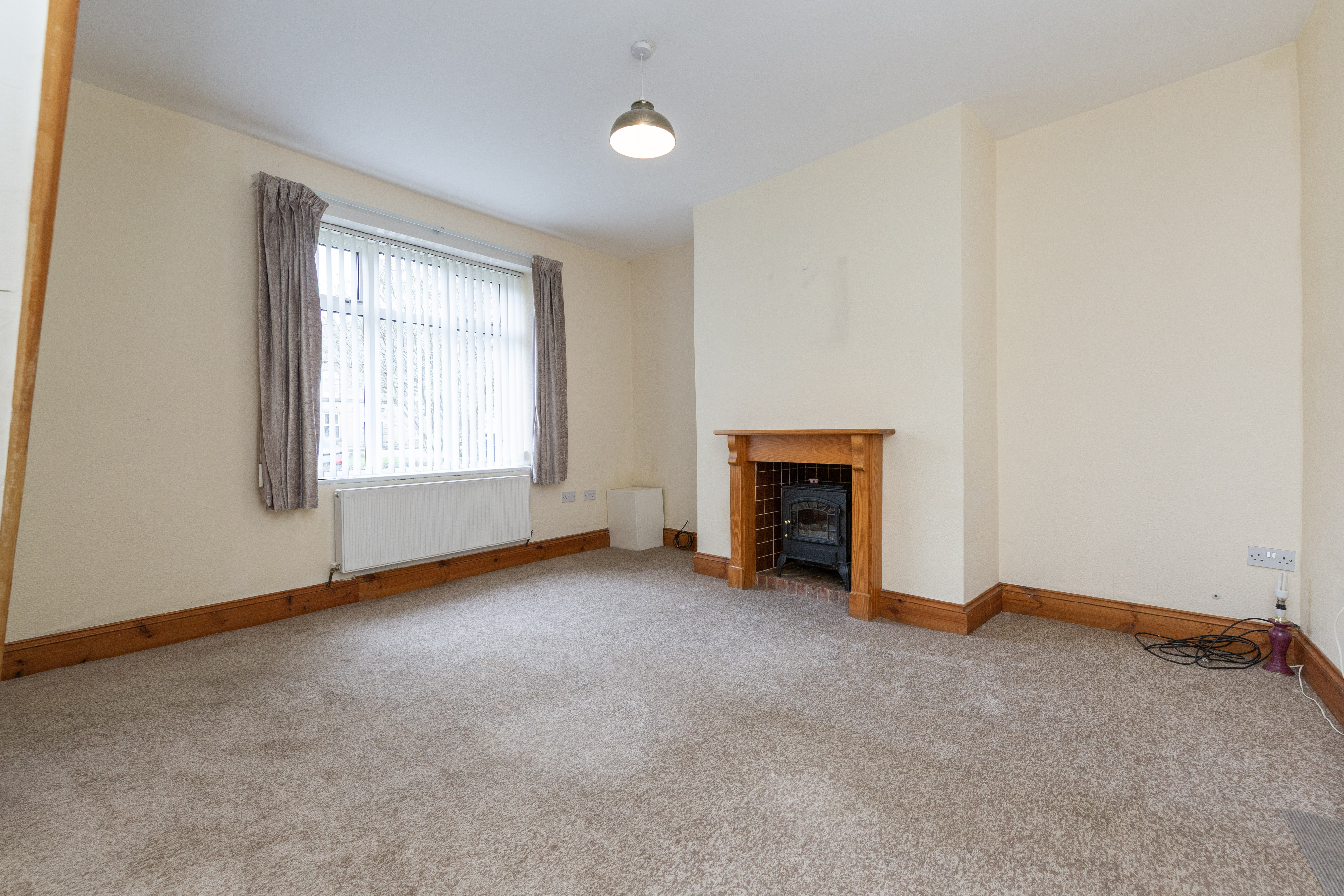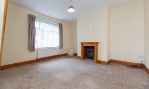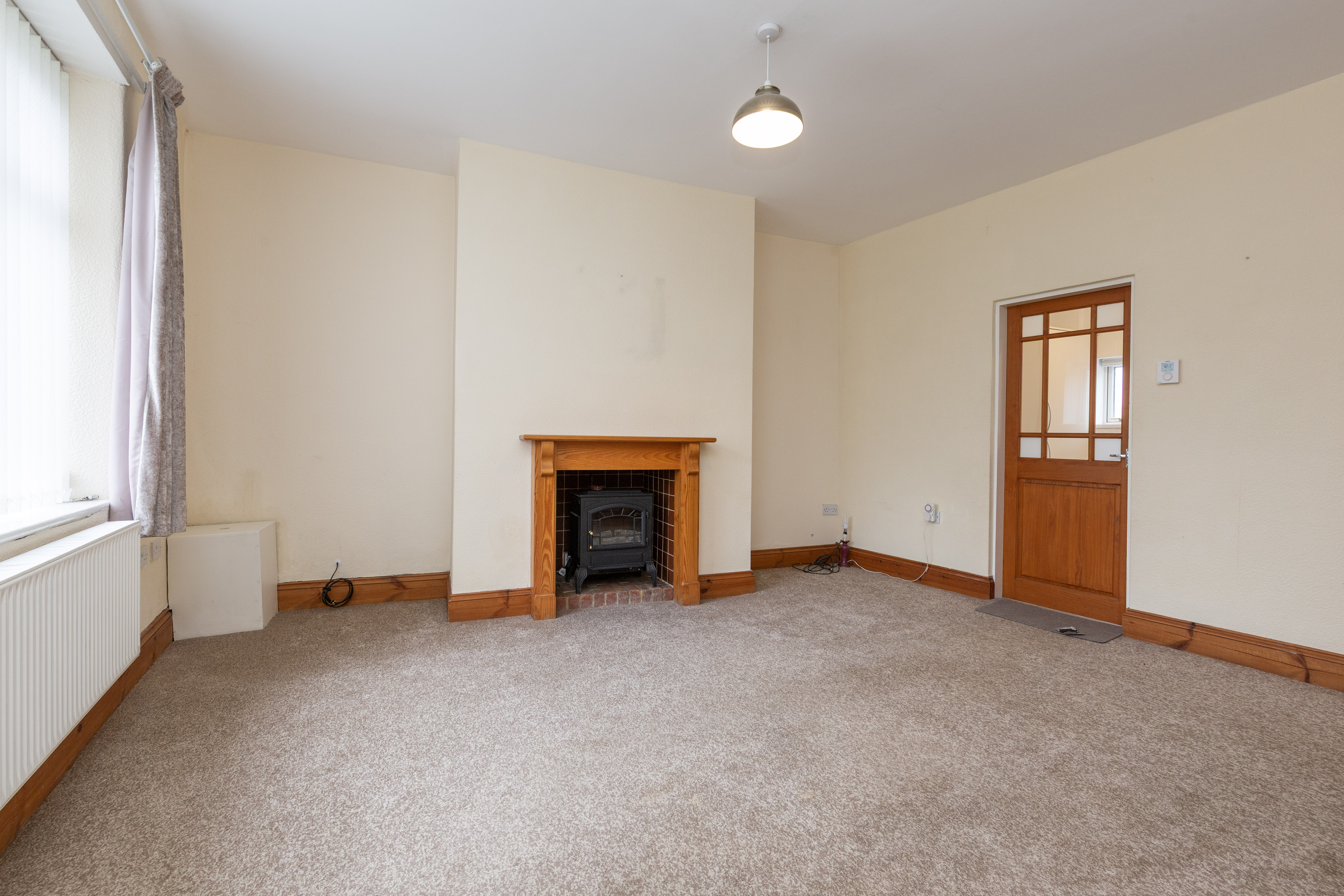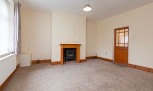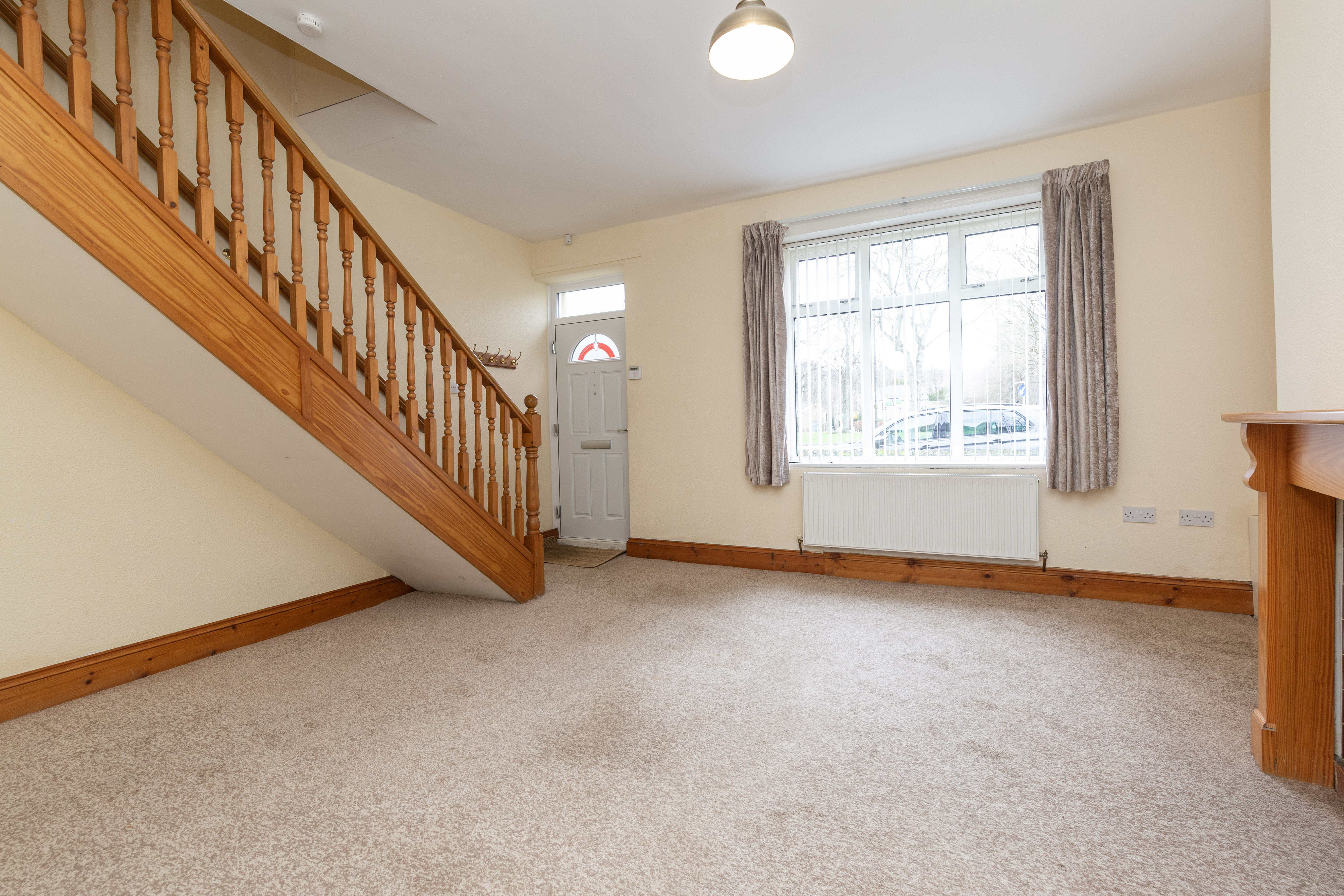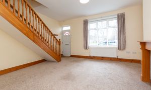 Inside, the main reception room is bright and welcoming, centred around a cosy fireplace and a large window that allows plenty of natural light to flow through the space. Neutral decor and soft flooring create a comfortable setting for relaxing or entertaining, while the wooden staircase adds character and warmth to the ground floor.