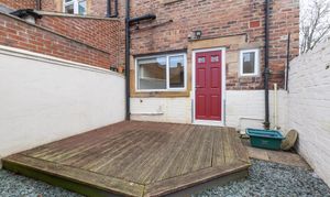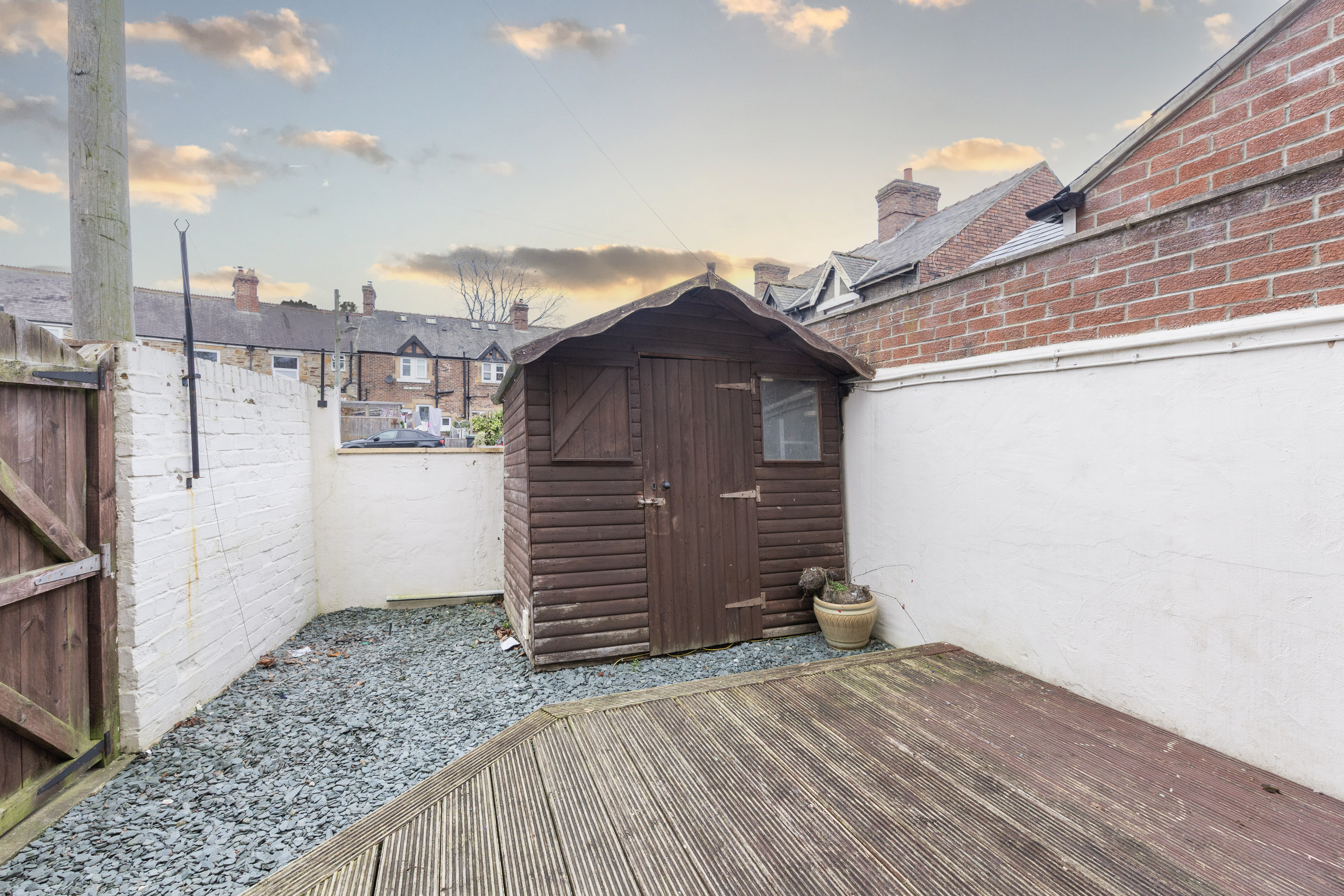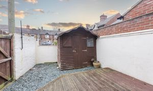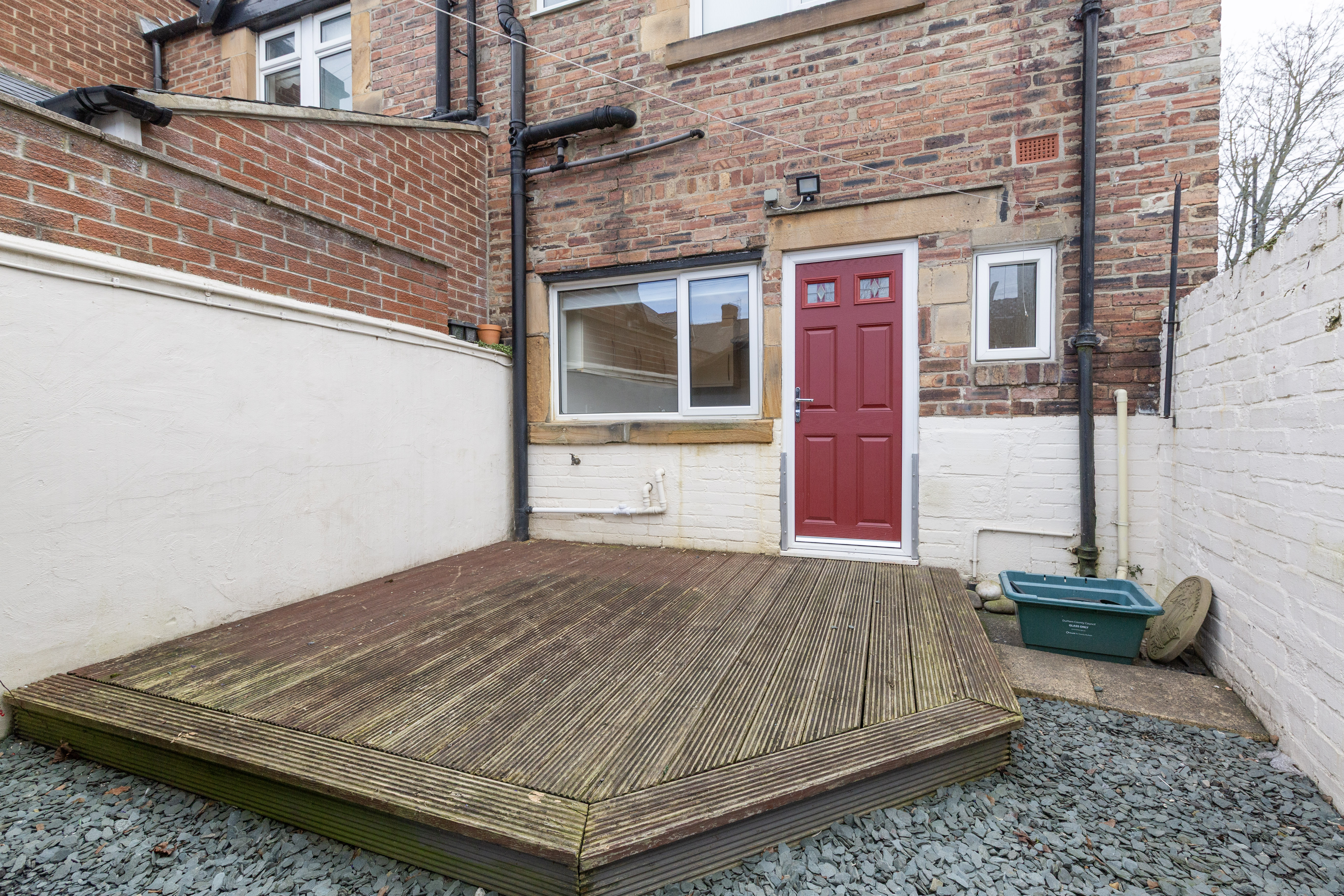Externally, the secure rear garden has been designed for ease of maintenance and enjoyment. A decked patio area offers space for seating and outdoor dining, while the private courtyard with red brick detailing and a vibrant red door adds distinctive character. A gravelled section keeps upkeep simple and enhances usability throughout the seasons.