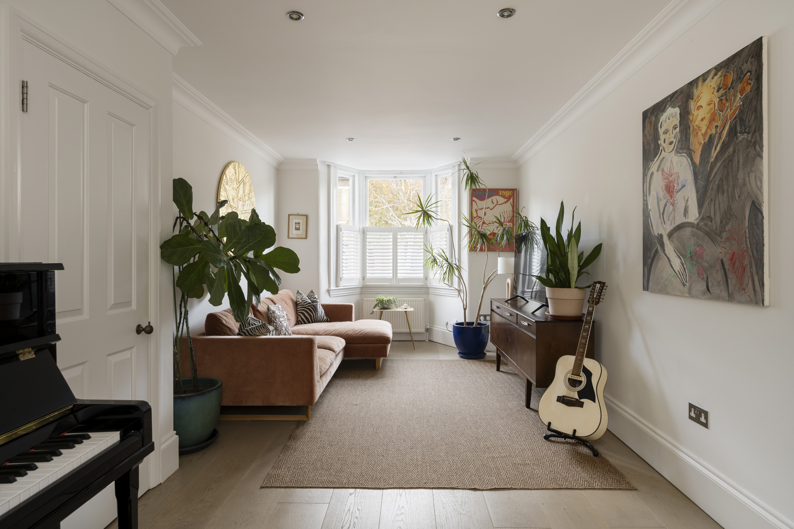 A pair of French doors lead into a double-reception room, also filled with natural light from the front bay window, adorned with bespoke shutters.