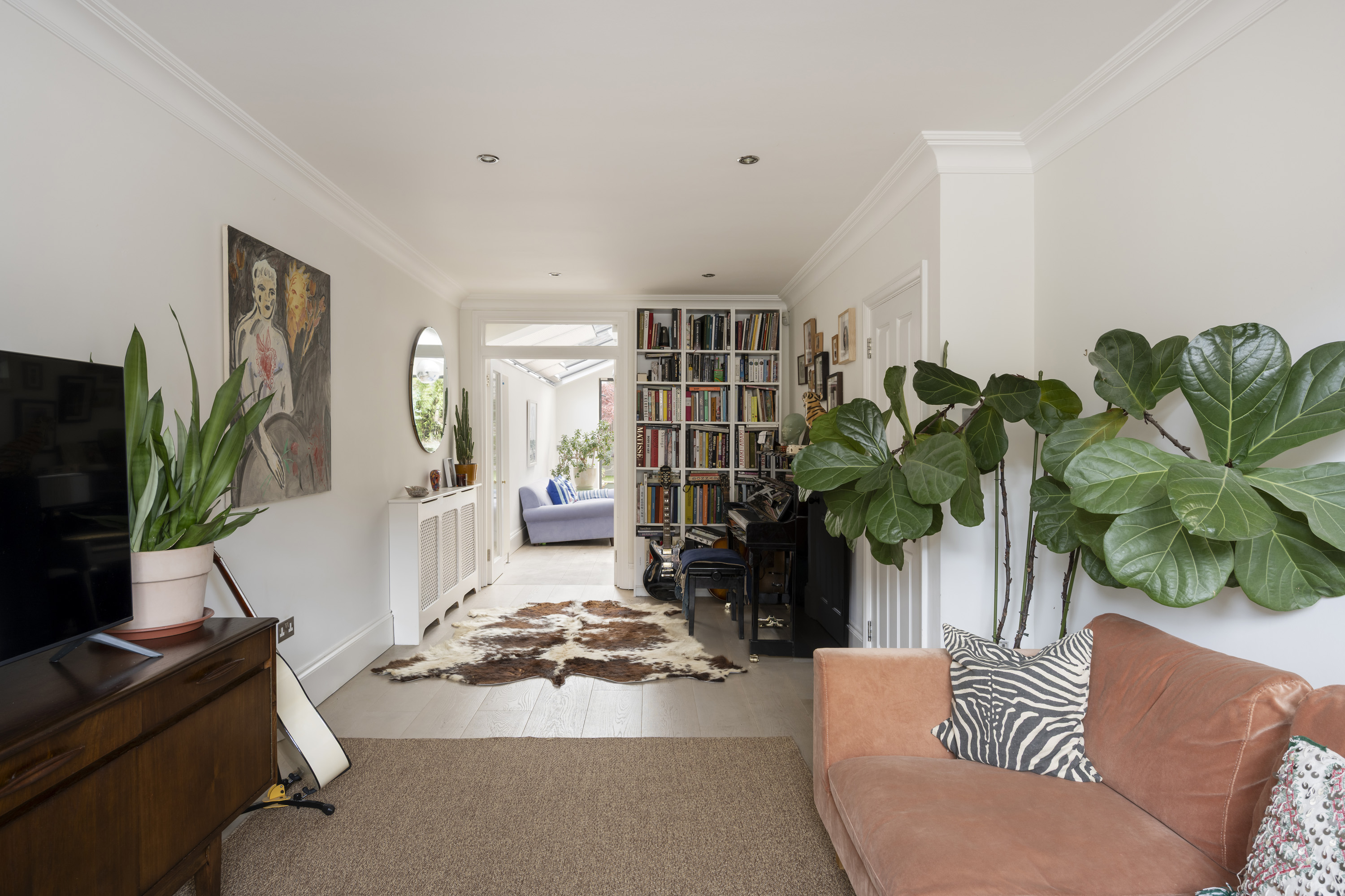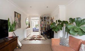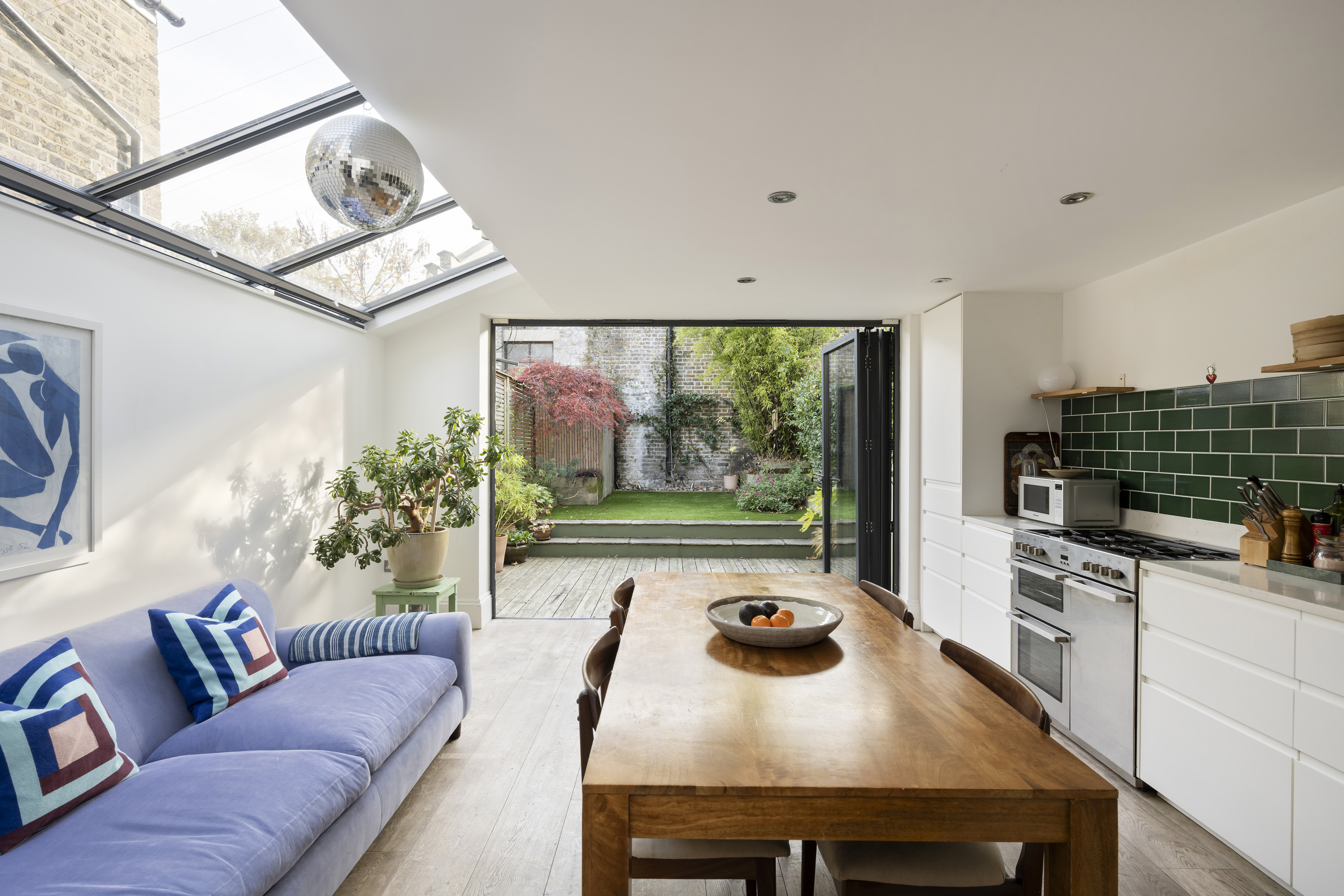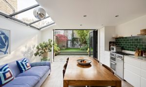 As you step inside, a characterful hallway draws the eye through the ground floor to the open-plan kitchen and dining room. A run of cabinetry lines the right-hand wall, introducing a bright, airy space flooded with natural light from the fully glazed side-return extension. Wide oak floorboards add both character and warmth, while floor-to-ceiling bi-fold doors open directly onto the garden, seamlessly connecting indoor and outdoor living.
