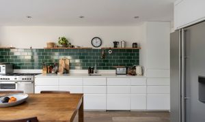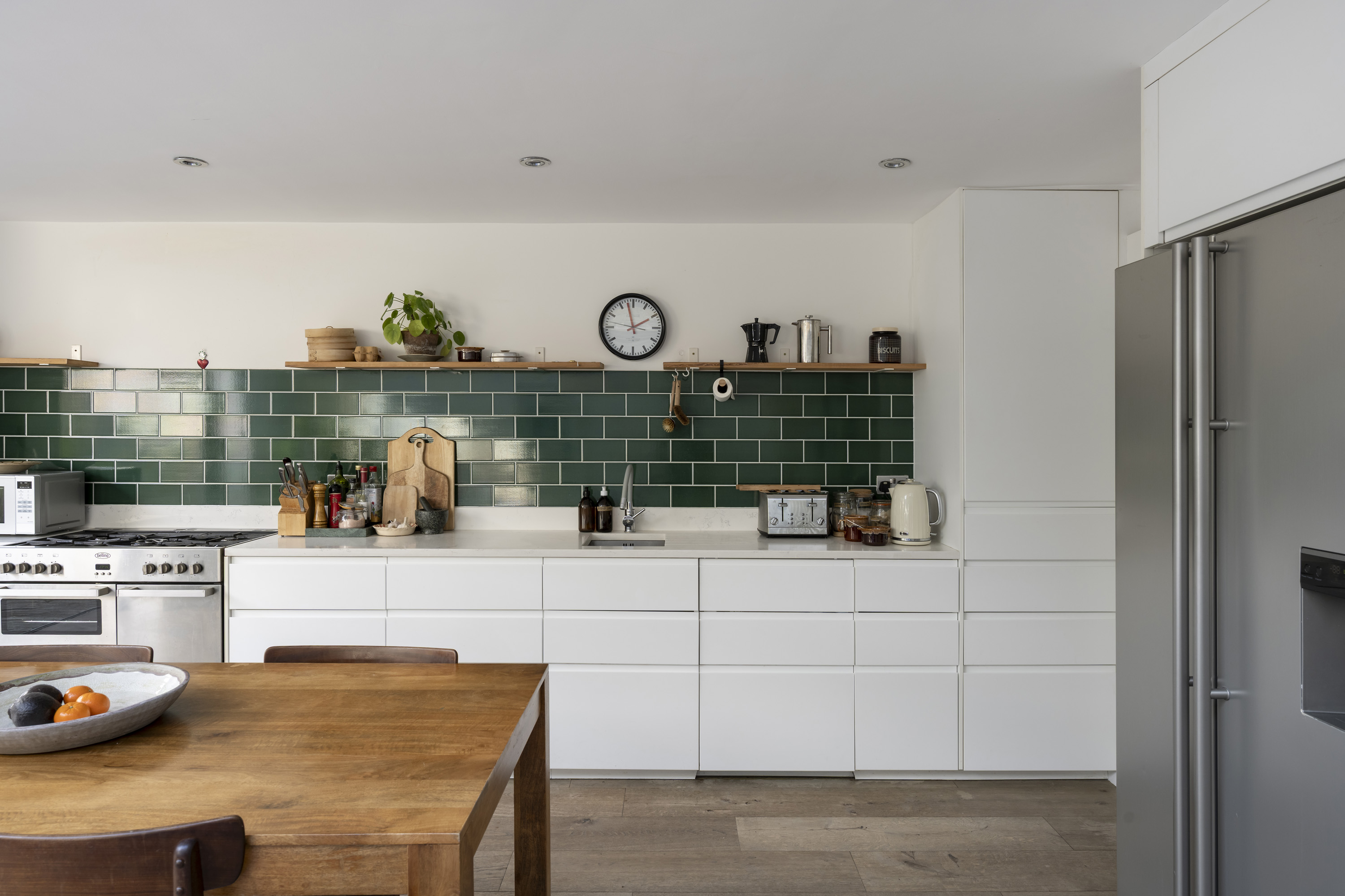 The kitchen is equipped with a Belling range cooker and an American-style fridge-freezer, complemented by ample storage within clean white cabinetry and quartz countertops, beautifully accented by distinctive green tiling.