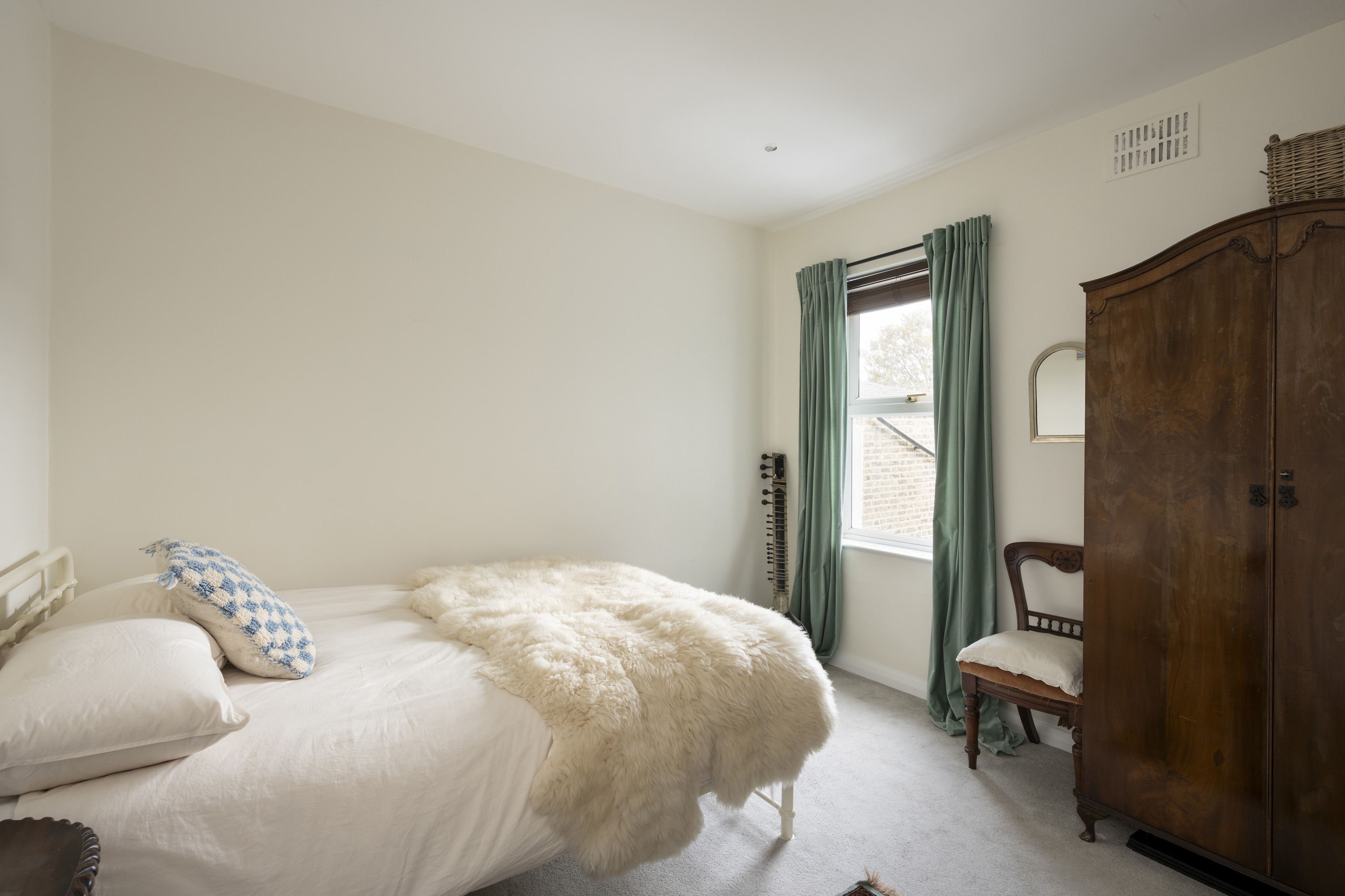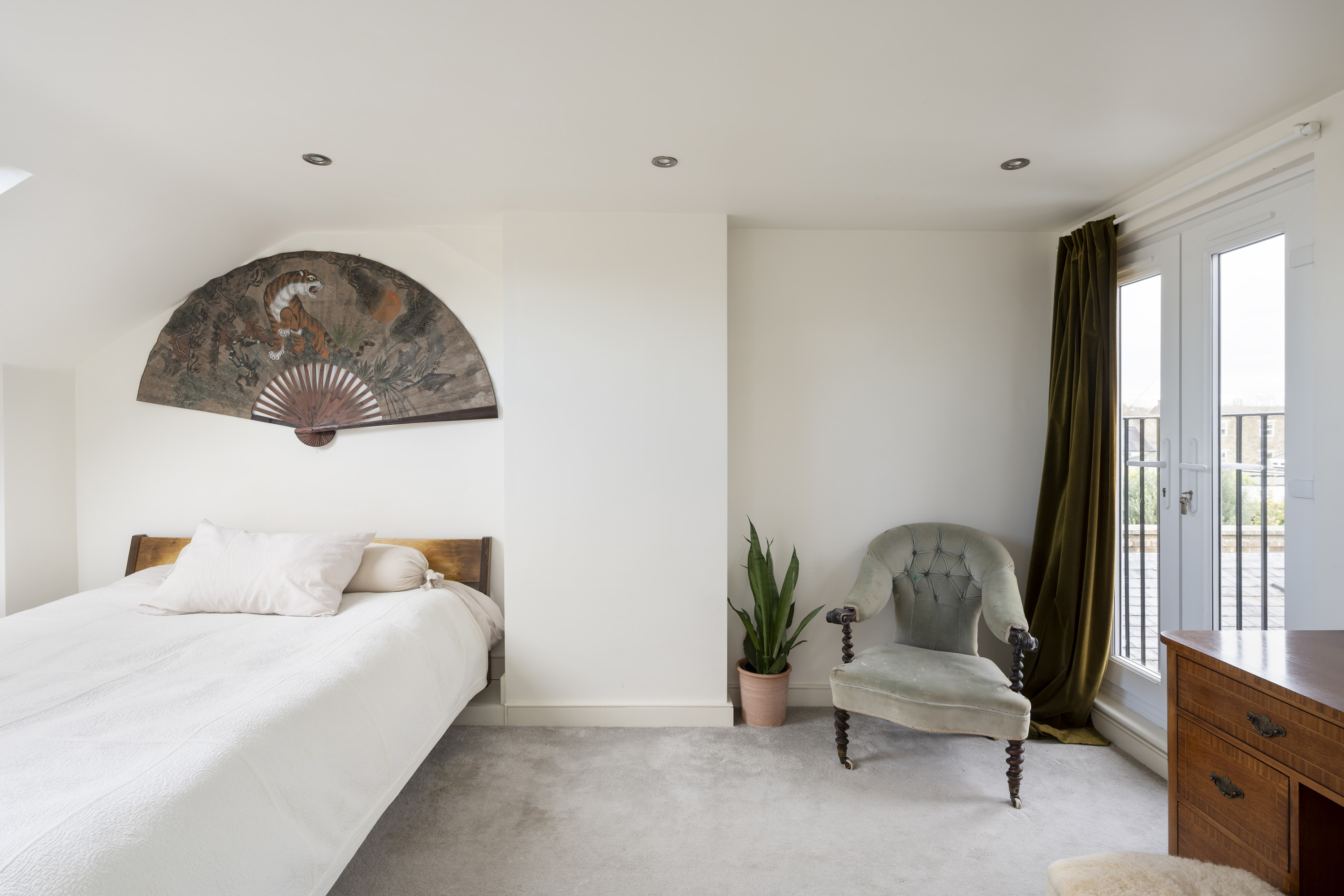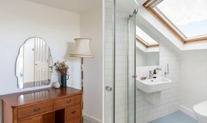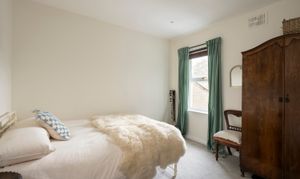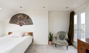 On the top floor, two further bedrooms are arranged, one currently utilised as a dressing room. The larger of the two occupies much of the top floor and features a Juliet balcony, two large skylights, an ensuite shower room, and full-width eaves storage, combining style with practicality.