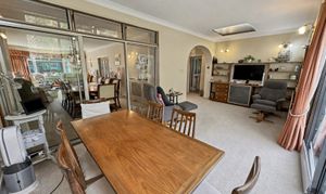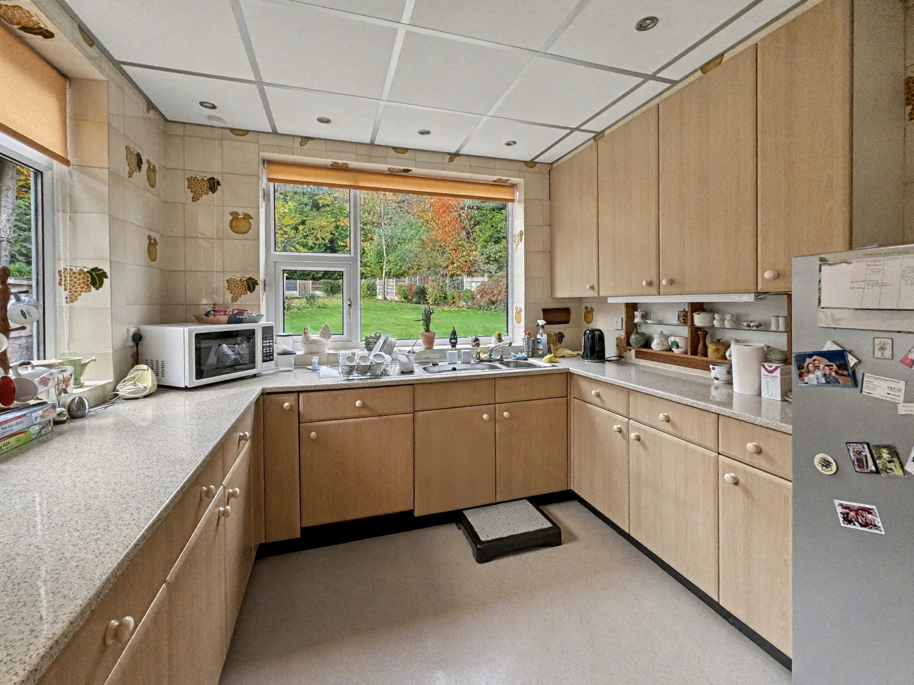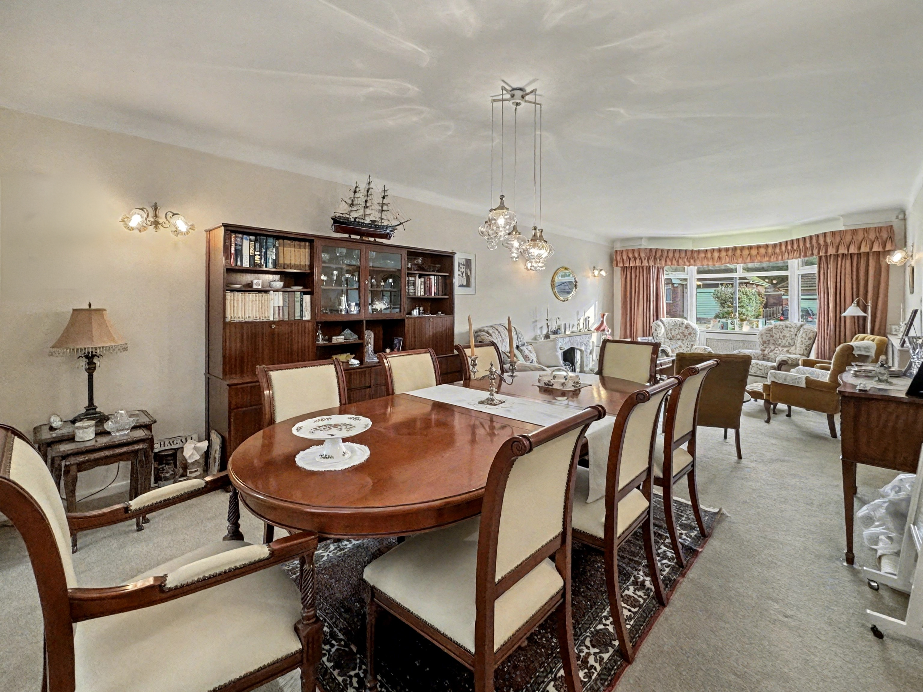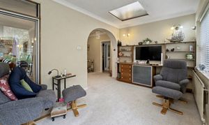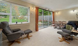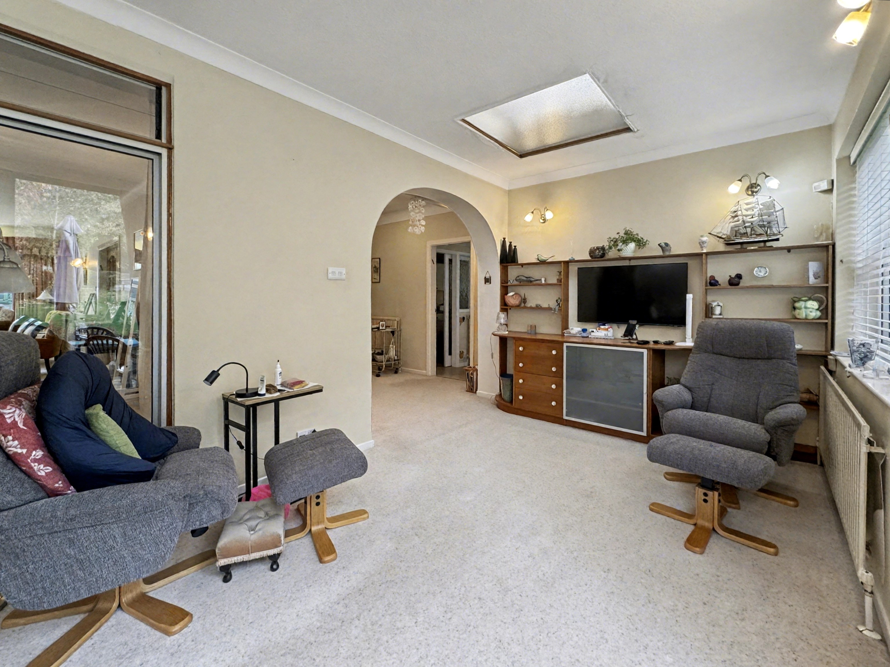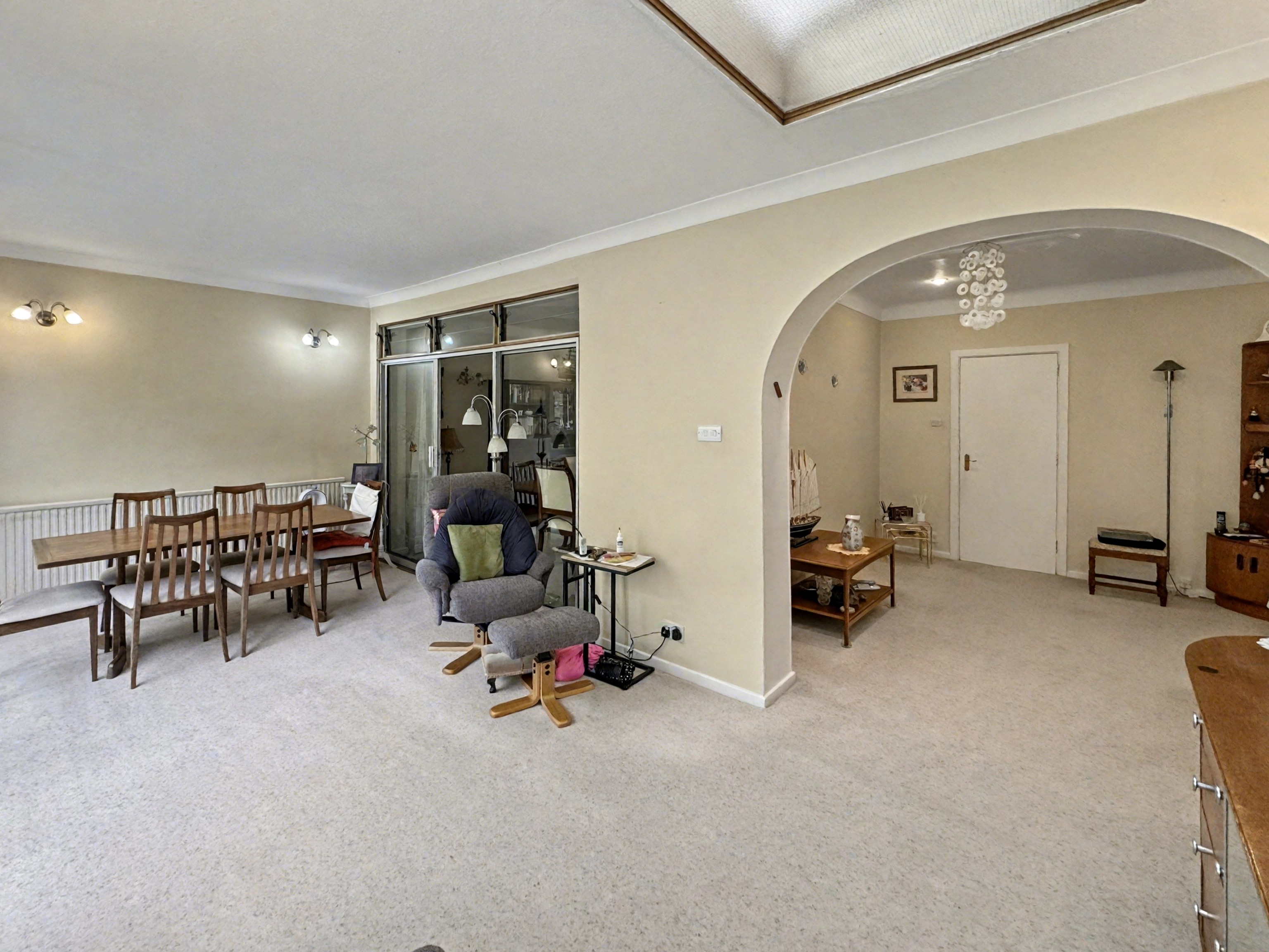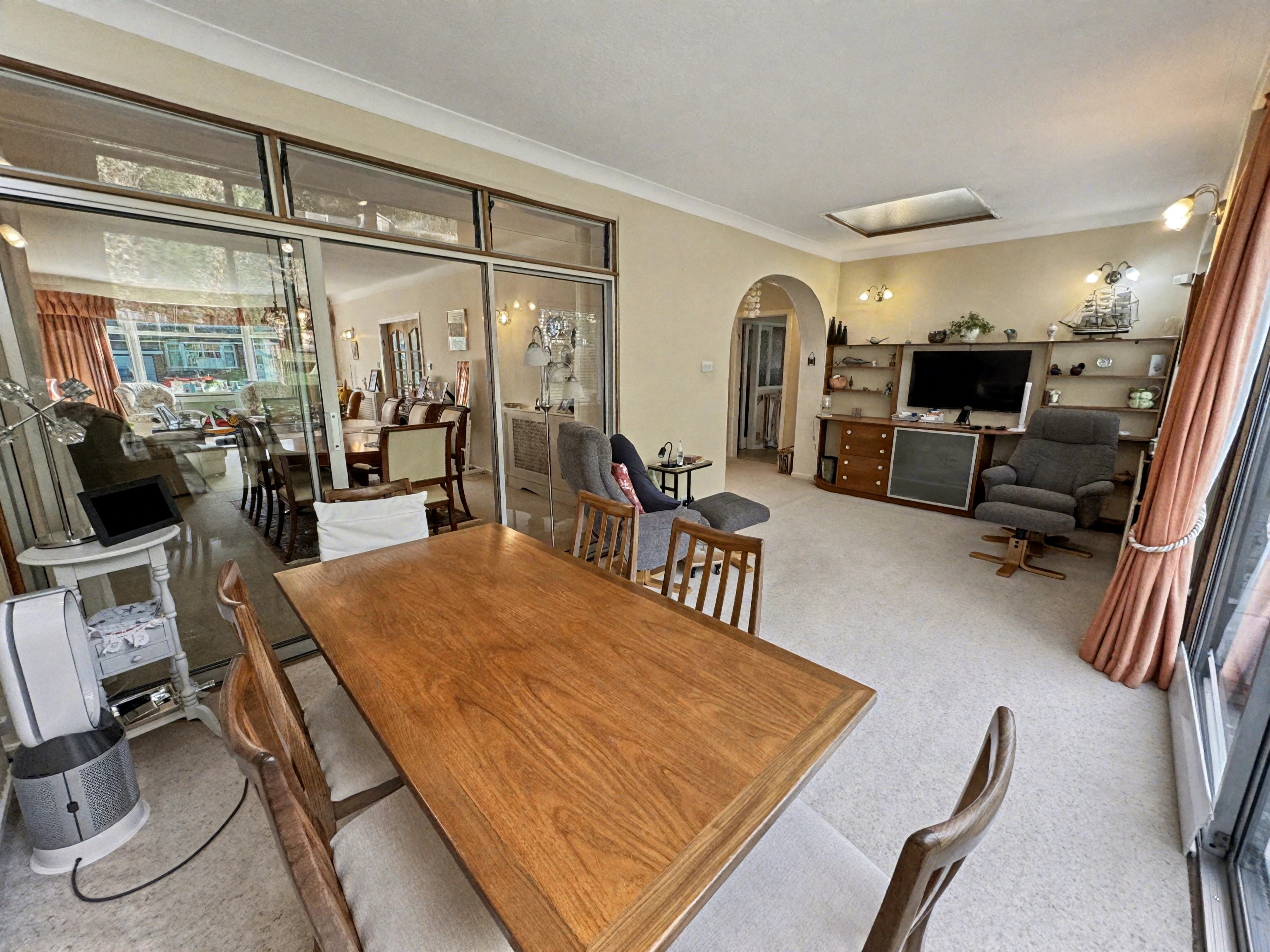 Upon entering through the porch, you are welcomed into a bright and spacious hallway, complete with a convenient cloakroom and downstairs WC. The home’s generous layout unfolds into a large open-plan lounge and dining area, ideal for both relaxing and entertaining, with views across the front of the property. Elegant glass doors open through to an additional reception room, currently used as a second dining space, which enjoys peaceful views over the rear garden.