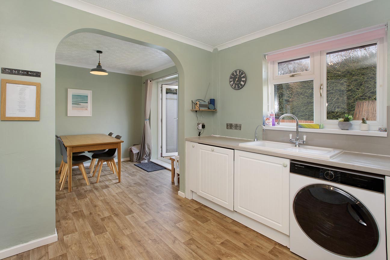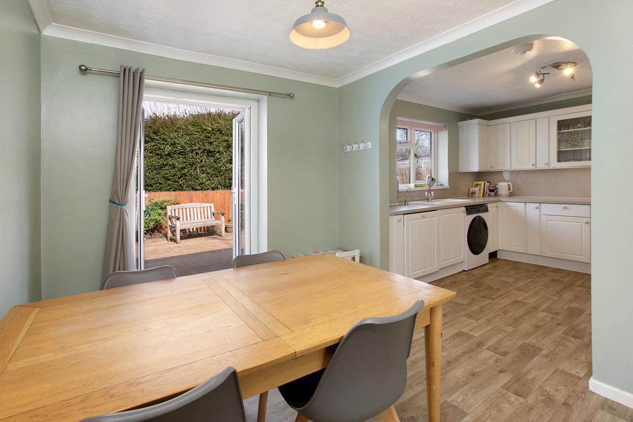 As you enter the property, you are welcomed into a bright and spacious porch, offering ample room for shoe and coat storage. A further door leads into the main hallway, which provides access to all rooms. The hallway also benefits from a large storage cupboard and an airing cupboard housing the combi boiler, complete with useful shelving. To the left, the living room is a generously sized, light-filled space featuring a charming coal-effect fire with a tiled hearth and mantel, creating a cosy focal point. An archway leads through to the kitchen/diner, which is fitted with a range of wall and base units complemented by roll-top work surfaces. The kitchen includes a ceramic sink with an instant hot water tap and offers space for an oven/hob, dishwasher, washing machine, and fridge/freezer. The dining area enjoys French doors that open out onto the rear garden, allowing for plenty of natural light and a seamless connection to outdoor living. The property comprises three well-proportioned double bedrooms and a recently updated bathroom fitted with a WC and basin. There is also potential to create a second WC in the hallway by utilising the existing coat and airing cupboards, if desired.