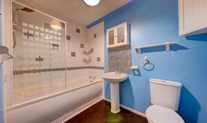 - Bathroom with a white suite, comprising bath with shower over, basin and W.C.