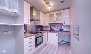 The welcoming living room is well lit from its front-facing window, overlooking Kings Road, creating an inviting space for relaxing or entertaining. The modern fitted kitchen has been upgraded with a stylish range of cupboards and integrated cooker, hob, and extractor.