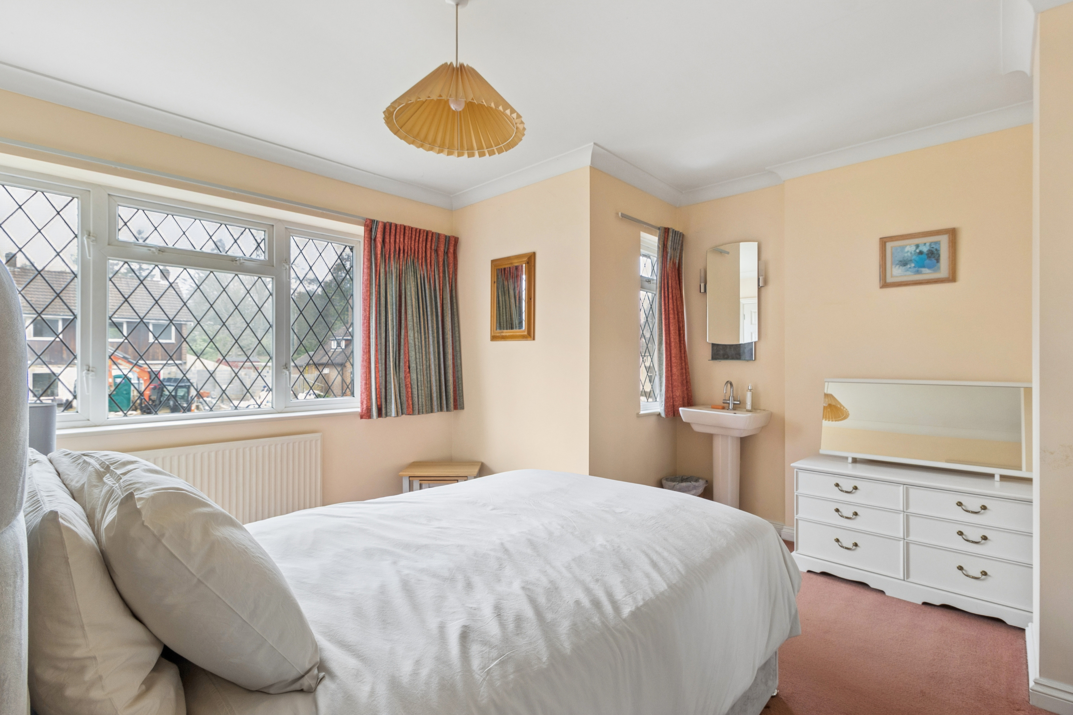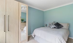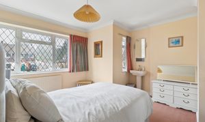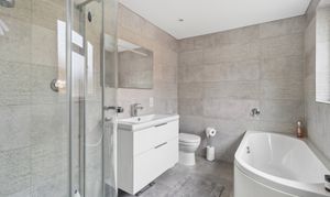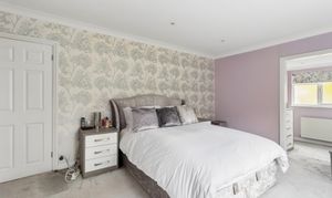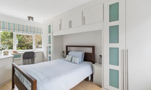 Upstairs, bedroom one is a superb size, with a large window enjoying views over the garden. The bedroom benefits from fitted wardrobes, a separate dressing area, and a well-appointed en suite bathroom complete with a separate bath and shower and underfloor heating.