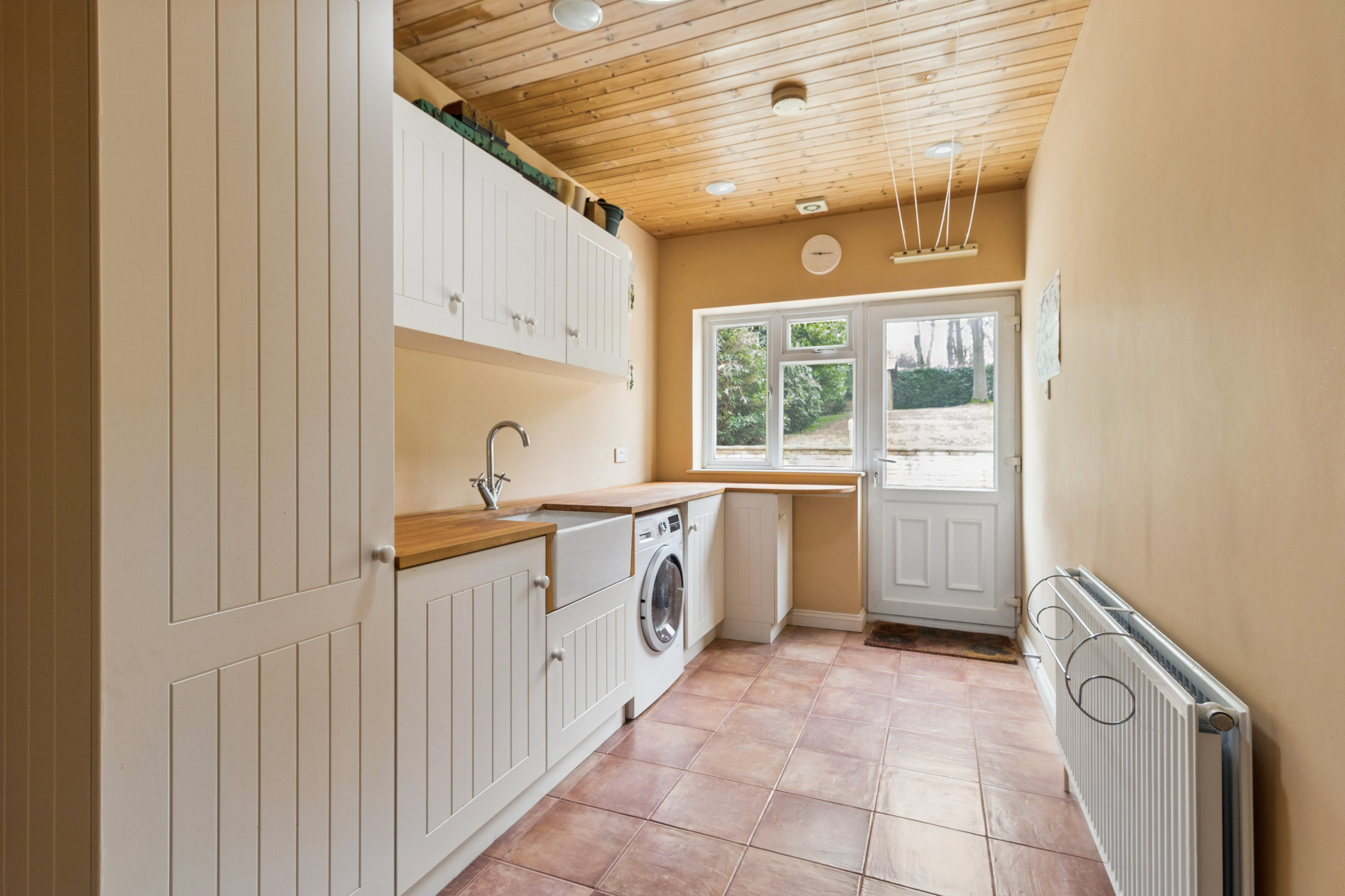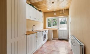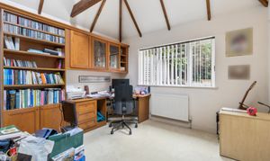 Beyond the family room is a large utility room, offering excellent additional storage and practicality, with a back door leading out to the garden. From this area, there is also a fantastic study, featuring attractive beams and offering a flexible space that could equally suit use as a playroom or hobby room.