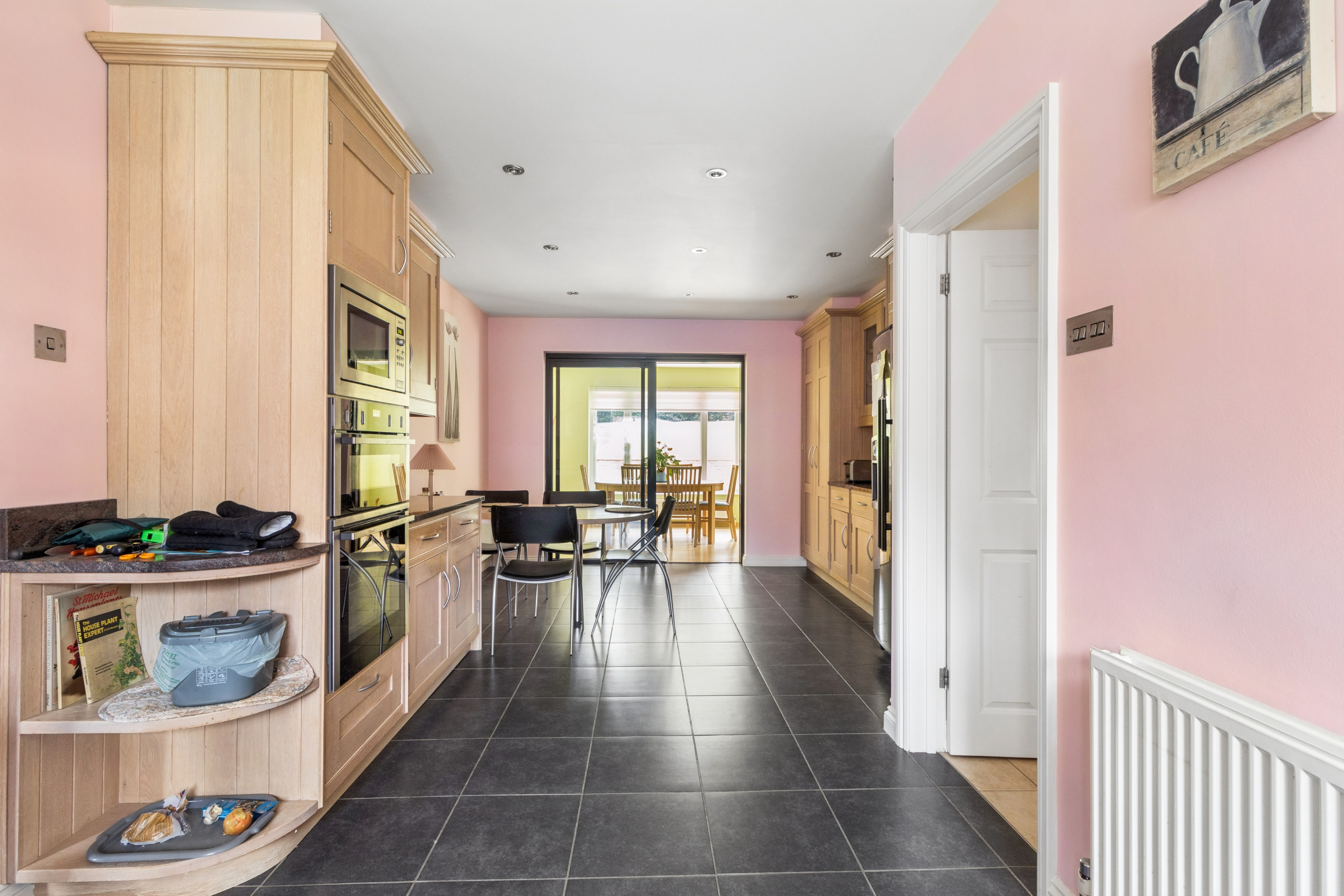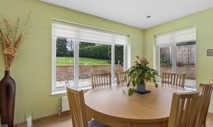 To the left of the lounge is a separate dining room, enhanced by sun pipes that flood the space with natural light. Sliding doors lead from the dining room into the kitchen, with an additional access point from the hallway, making the layout both practical and versatile.