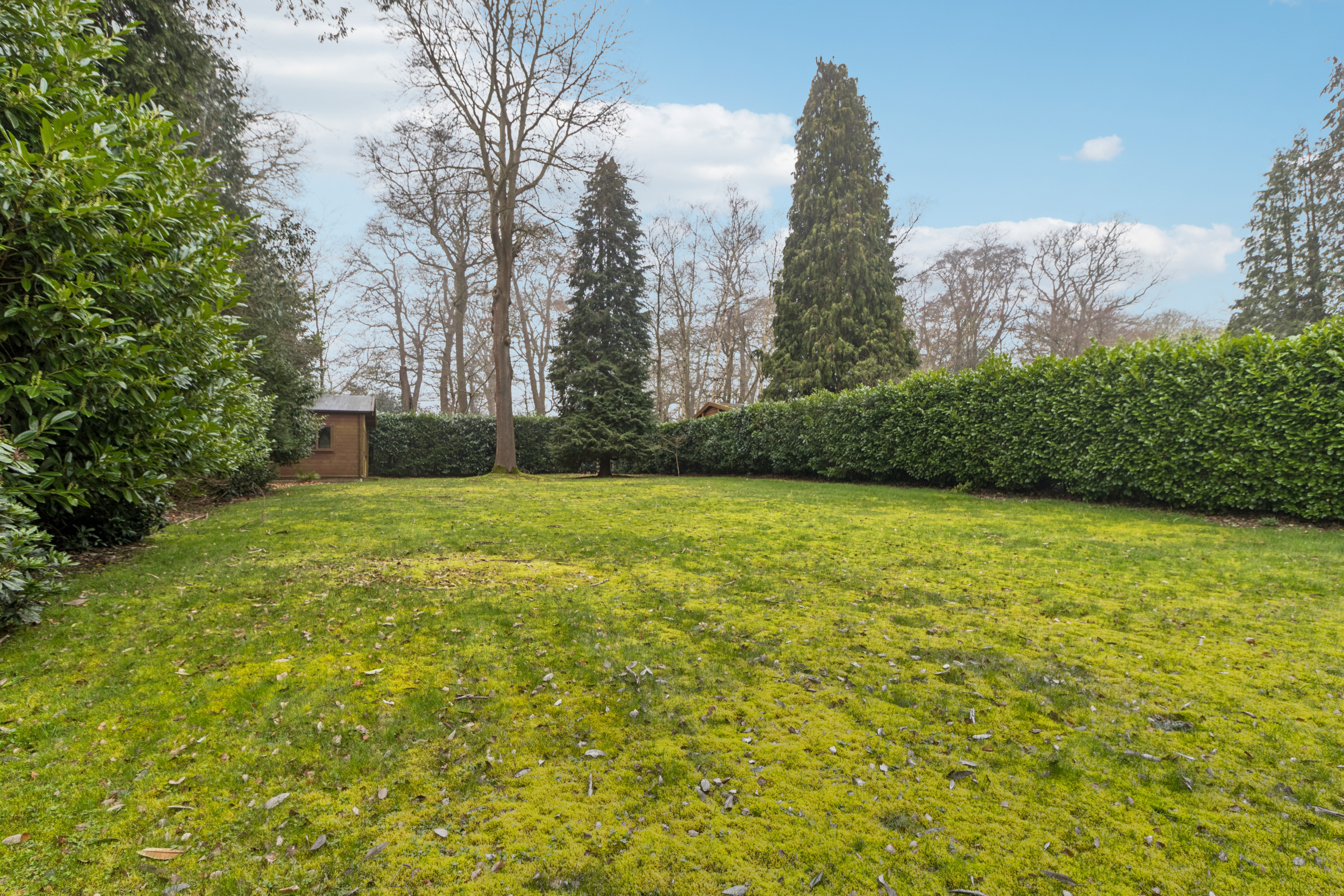 Outside, the property boasts a large south-facing garden, ideal for outdoor living. To the rear left is a substantial storage shed, and at the far corner of the garden a gate provides direct access to a woodland area, adding a wonderful sense of privacy and a natural backdrop.