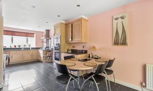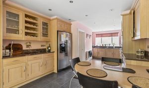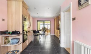 The kitchen is a standout feature, beautifully designed, generously proportioned, and fitted with integrated appliances. There is ample space for dining, including a built-in breakfast table at the far end, making it an ideal hub for family life and entertaining. Just off the kitchen is a family room, perfect for relaxing or as a children’s space.